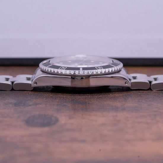 Here we have a 1995 Rolex Submariner Date 16610 Box & Papers, the 16610 was introduced around 1987, it came in two variants: an MK1 with "Swiss-T<25" on the dial using Tritium and an MK2 with just Swiss on the dial using LumiNova in 1999 and then Super-LumiNova from 2000 until 2004. The 40mm stainless steel Oyster case curves over your wrist with drilled tapered lugs, polished and brushed surfaces transition with crisp edges, and a lug-to-lug length of 47mm and a case thickness of 12.5mm give the watch an impressive wrist presence, on the right side is a signed Rolex Triplock screwed-down crown made up of four separate rubber gaskets, and the crown guards are part of the case which gives it strength. The unidirectional stainless steel bezel has deep knurling with a black anodised aluminium divers bezel insert that holds a sapphire crystal above a black dial. This MK1 dial has applied disc and baton indexes that are filled with Tritium marking the hours, Mercedes's hands are filled with Tritium complemented by a sweeping lollipop counterweighted second-hand. At 3 o’clock we have the date window with Cyclops magnification on the crystal. At 12 o’clock the Rolex crown with the text “Oyster Perpetual Date” is precisely applied, at 6 o’clock we have the additional fourth line “Superlative Chronometer Officially Certified”, on the bottom edge, you can see "Swiss-T<25". On the reverse, a coin-edged screw-down case back, inside an automatic Rolex Cal. 3135, 31 jewels, 28,800 beats per hour, it is fitted with a Parachrom hairspring, designed by Rolex; it offers greater resistance to shocks and to temperature variations, this movement was first introduced in 1988. The watch comes fitted on its Rolex 20mm stainless steel Oyster bracelet with OysterLock safety clasp and diver extension system which allows the watch to be worn over a divers suit. This watch is sold with its Rolex box, swing tag, Rolex anchor & Rolex paperwork.