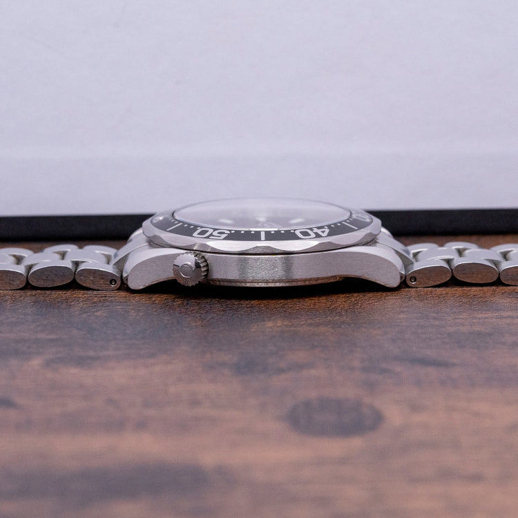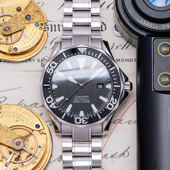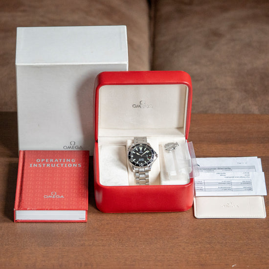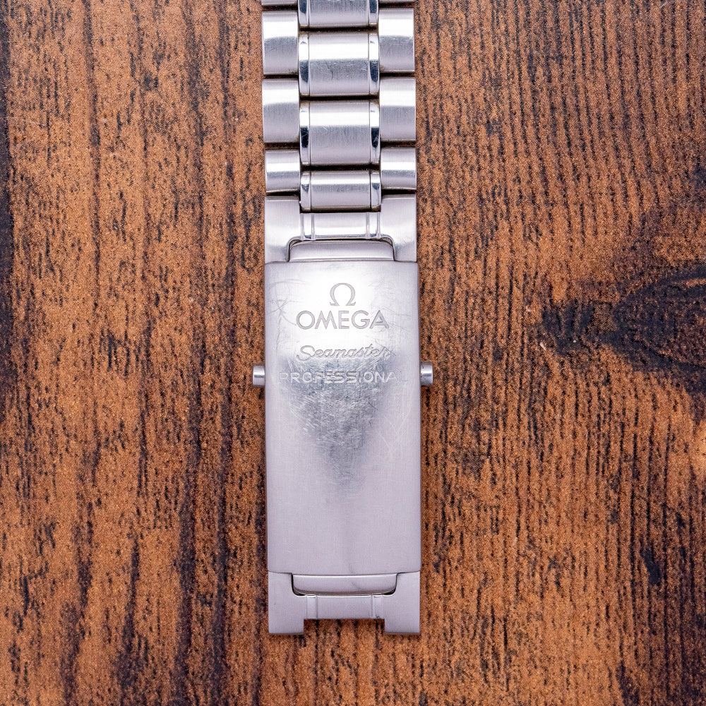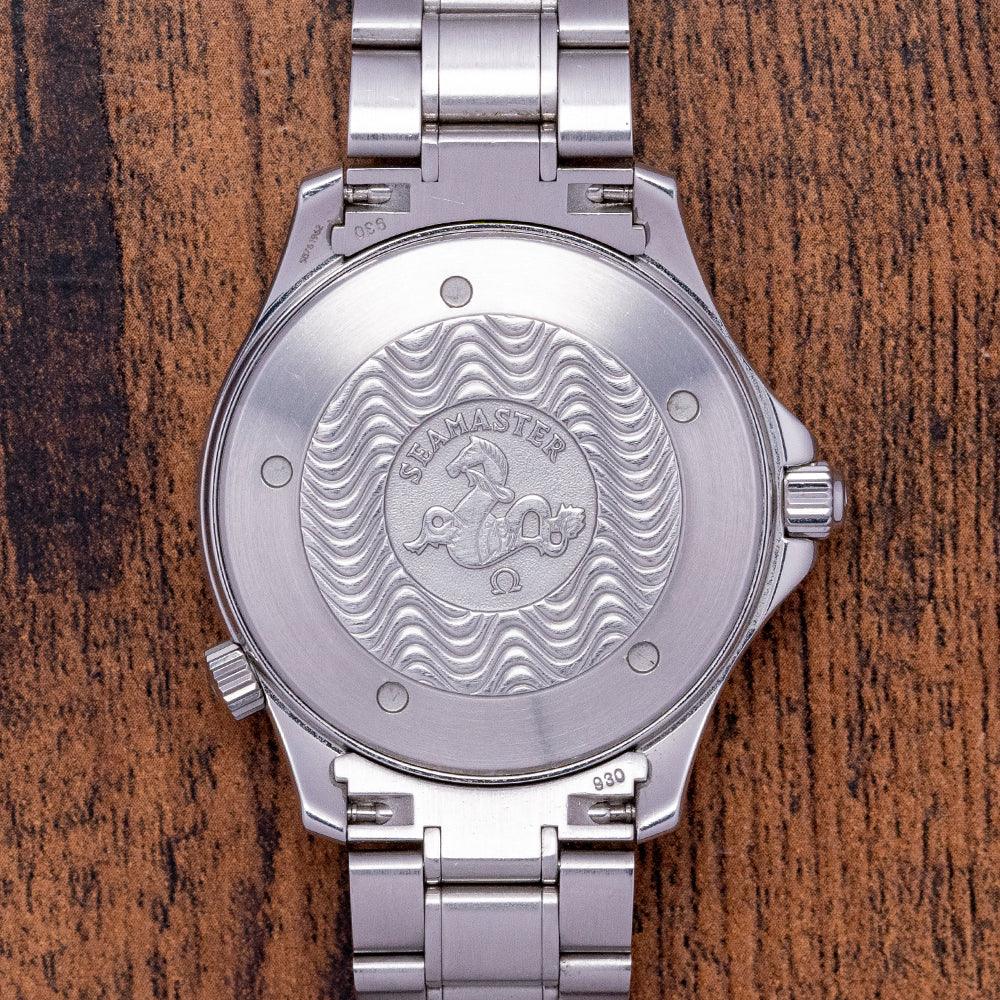 Here we have a 1998 Omega Seamaster 300M Black Quartz 2264.50.00 with a 41mm polished and brushed stainless steel case, curving over your wrist with the characteristic twisted lugs, and a lug-to-lug length of 47.5mm and a case thickness of 11mm giving the watch an impressive wrist presence. On the right side is a signed screw-down crown protected by crown guards and a helium escape valve at 10 o’clock on the left side. The unidirectional bezel has scalloped sides for extra grip and a black aluminium dive insert with silver numerals and markings. Sapphire crystal sits above a black dial with a dynamic wavy pattern, an outer minute chapter ring has long and short baton indexes coated in luminance marking the hours, and at 3 o’clock a colour-matched date window, steel sword hands are lume-filled complemented by red-tipped lollipop sweeping second-hand, at 12 o’clock we have the Omega motif and at 6 o’clock “Seamaster Professional 300m/1000ft'' is printed underneath. On the reverse a screw-down case back with engraved waves and a polished Hippocampus in the centre, a seahorse that represents Neptune the God of the sea, Pierre Borie conceived it after seeing a picture of Neptune riding a chariot pulled by seahorses, it is the reason why the seahorses are wearing a bridle, first seen on the Seamaster in 1958. Inside a Quartz Omega Cal. 1538, 6 jewels, based on the ETA 255.461. The watch comes paired with its polished and brushed 20mm Omega stainless steel bracelet with a signed push button-released folding clasp, all links are provided and will fit up to an 8-inch wrist.