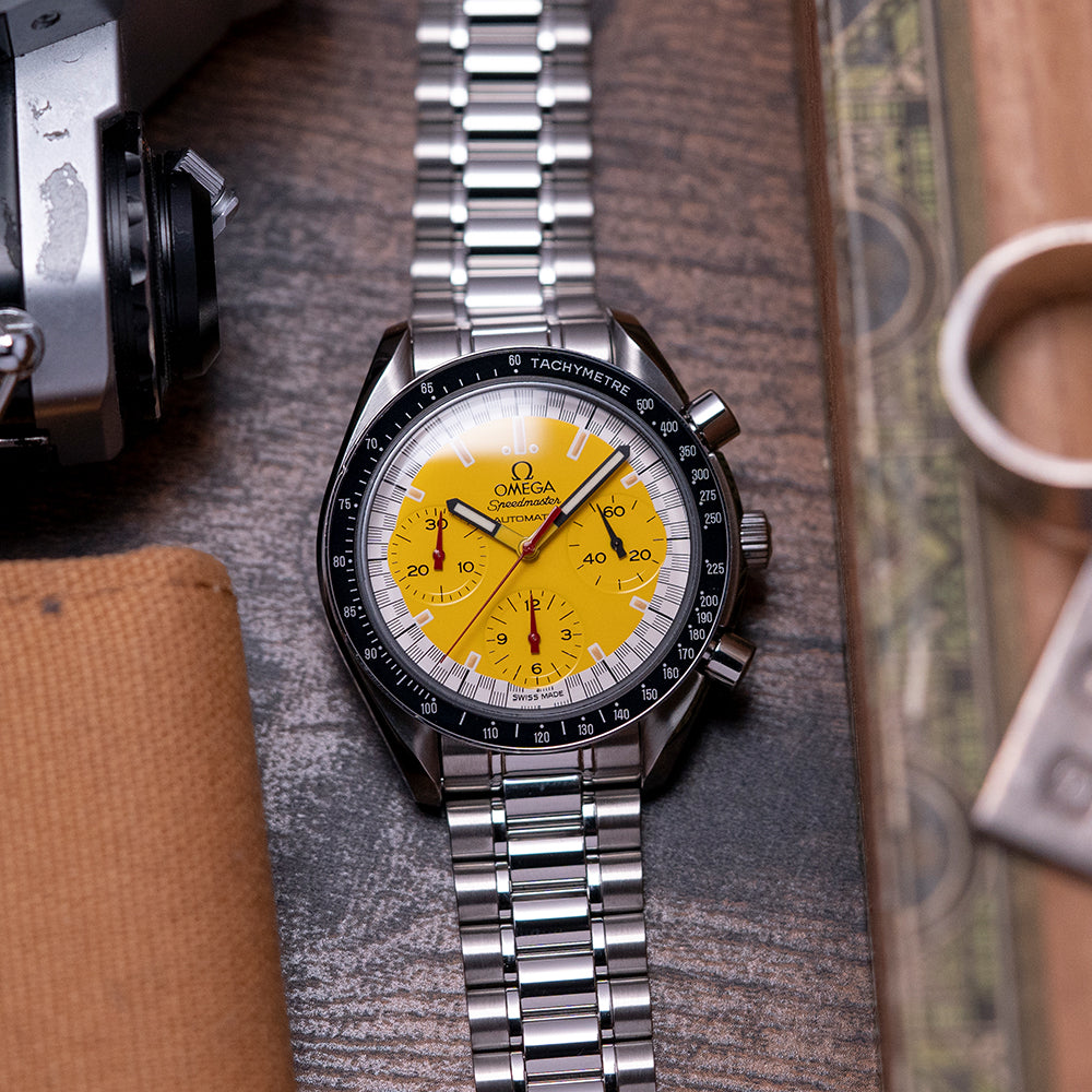 I have always been a big fan of the "Reduced" or automatic range of Speedmasters with their slightly smaller proportions which works great for someone with a smaller wrist like myself, but then also the fact that Omega seemed to allow for much more fun in the design department for the automatic range. These Schumacher dials are stunning and really do pop, this model in this condition with its original box and papers will make a collector very happy!