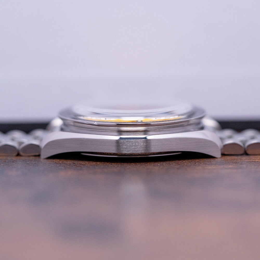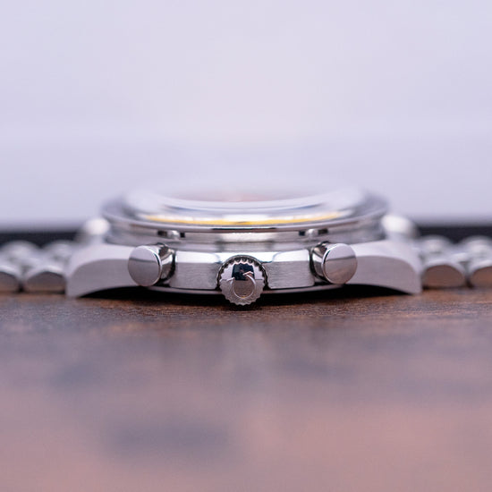 One man in Formula 1 stands out for his incredible achievements during his career from 1991-2006 and 2010-2012, 7 world championships, the one, and only Michael Schumacher. First introduced in 1996 they came in a vibrant blue alongside red and yellow dials celebrating Schumacher’s first drive for Ferrari. Here we have a 1998 Omega Speedmaster Reduced "Schumacher" Yellow Box & Papers 3510.12.00 that has a satin-brushed and polished 39mm stainless steel case that curves over your wrist with the characteristic twisted lugs, a lug-to-lug length of 44.5mm and a case thickness of 12mm gives the watch an impressive wrist presence. Polished and brushed surfaces transition with crisp flowing lines. On the right side, we have the short chronograph pushers with a signed crown in the centre. A fixed steel bezel has a black Tachymeter scale insert printed numerals in silver. A domed Hesalite crystal signed in the centre, sits above a vibrant yellow dial. An outer white chequer pattern surrounds baton indexes coated in luminescence marking the hours. At 3 o’clock a 60-second continuous register, at 6 o’clock a 12-hour register, and finally at 9 o’clock a 30-minute register. Red and black hands add a nice contrast to the registers. Yellow baton hands are outlined in black and filled with luminescence. A red tapered chronograph seconds hand hits the mark. On the reverse, a screw-down case back with the Hippocampus embossed in the centre, inside an automatic Omega Cal. 3220, 47 jewels, based on ETA 2892-A2 with a Dubois-Depraz chronograph platform which gives the Reduced a stepped profile to the pushers and crown. The watch comes paired on an 18mm polished and brushed Omega stainless steel bracelet with a signed folded clasp and comes with its special Formula 1 slick tyre and wheel Omega Presentation box and Omega paperwork.