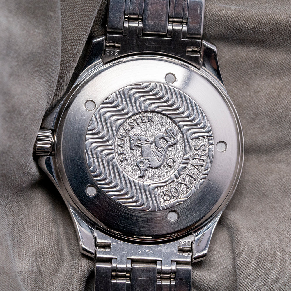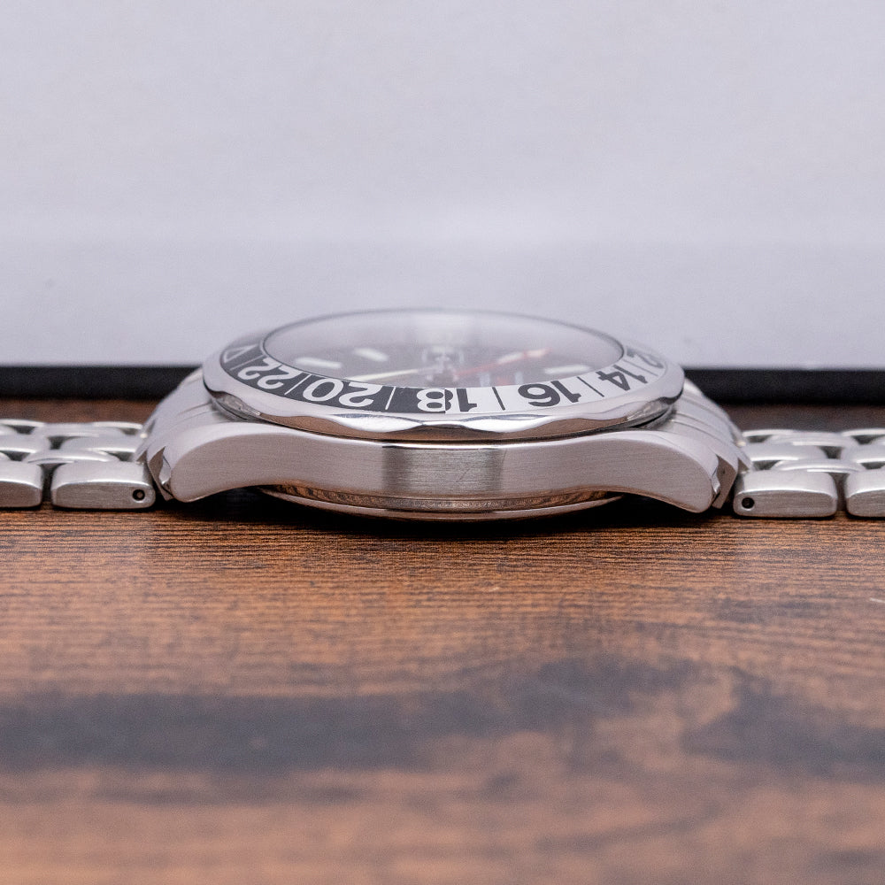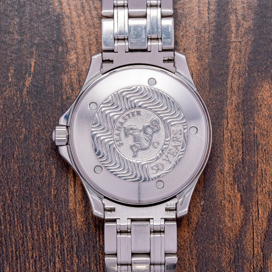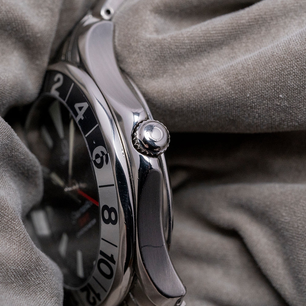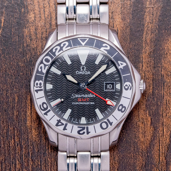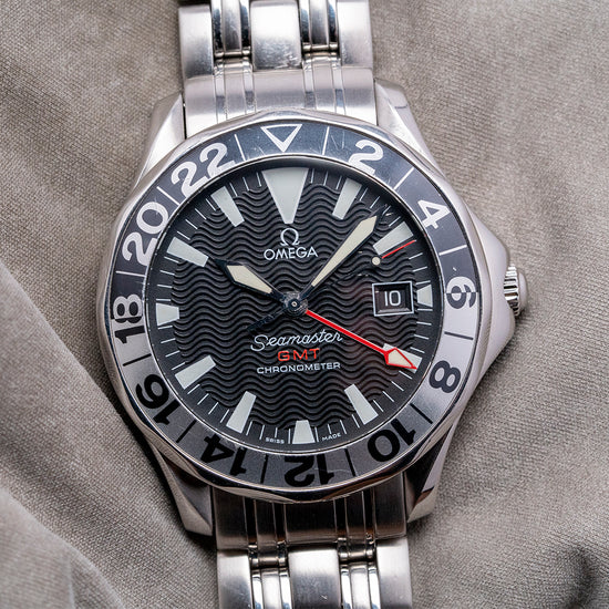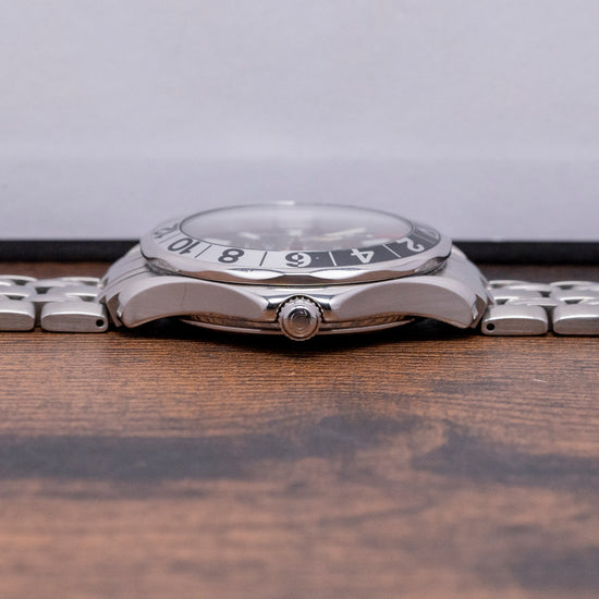 Here we have the charismatic 1999 Omega Seamaster GMT 2534.50, released in 1998, which celebrates the 50th Anniversary of the Seamaster, first released in 1958. Featuring a 41mm polished and brushed stainless steel case, curving over your wrist with the characteristic twisted lugs, and a lug-to-lug length of 47mm and a case thickness of 12mm, giving the watch an impressive wrist presence. On the right side is a signed screw-down crown protected by crown guards. The bidirectional bezel has scalloped sides for extra grip and a black and silver aluminium 24-hour insert with black and silver numerals and markings. The domed sapphire crystal sits above a black dial with a dynamic wavy pattern, an outer minute chapter ring has long and short indexes coated in lume marking the hours. At 3 o’clock, a colour-matched date window, black sword hands are lume-filled, complemented by red-tipped sweeping second-hand and a red arrow-tipped GMT hand, at 12 o’clock we have the Omega motif. At 6 o’clock ‘Seamaster’ ‘GMT’ in red and ‘Chronometer’ completes this dynamic traveller's companion. On the reverse a screw-down case back with engraved waves and a polished Hippocampus in the centre, a seahorse that represents Neptune the God of the sea, Pierre Borie conceived it after seeing a picture of Neptune riding a chariot pulled by seahorses, it is the reason why the seahorses are wearing a bridle, first seen on the Seamaster in 1958. Inside an automatic Omega Cal. 1128, 23 jewels, beating at 28,800 beats per hour, it features hand-winding, quick-set date, and hacking seconds for your convenience. It comes paired with its polished and brushed 20mm Omega stainless steel bracelet secured with a signed push-button-released concealed clasp; all links are provided. This watch is sold with its great set, including Omega box, swing tags and unsigned paperwork.