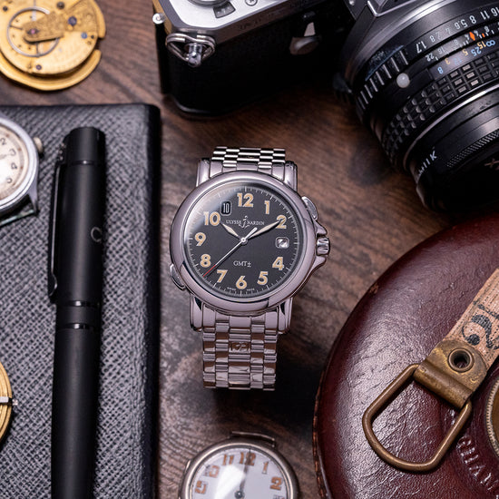 Here we have a 1999 Ulysse Nardin San Marco GMT Automatic 213-22, its high polished 40mm round stainless steel case gently curves over your wrist, the stepped lugs with a lug-to-lug length of 47mm and a thickness of 12mm ensure a comfortable fit. On the left side at 8 o’clock you find a pusher to change the GMT hour window on the dial at 11 o’clock. On the right side, a GMT pusher at 2 o’clock next to a protected screw-down signed crown with crown guards. A polished bezel holds a flat sapphire crystal, its matte black dial has an outer minute track and Arabic numeral indexes. At 3 o’clock a date window, and the watch features slim sword hands. Text is painted and the Anchor is applied, and at 11 o’clock the GMT Hour window. On the reverse, an embossed San Marco (Lion of St. Mark, the Evangelist) is in the centre of the screw-down case back, inside an automatic ETA 2892-A2, 21 jewels, 28,800 beats per hour, this is the advanced version of the Cal. 2892, it has an "eccentric screw" for precise fine adjustment. The watch comes paired with its Ulysse 20mm stainless steel bracelet with a butterfly-signed clasp.