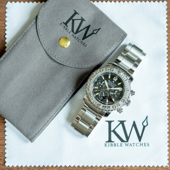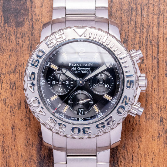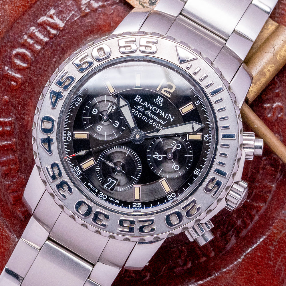 Here, we have a 2000s Blancpain Air Command Flyback Chronograph with a muscular, profiled 40mm polished stainless steel case, and thick drilled lugs curve over your wrist for a comfortable fit. Down the right side, we have screw-down pushers for the chronograph and a signed screw-down crown in the centre, each with matching deep knurling; on the left side, a deeply engraved “Blancpain”. The uni-directional bezel has deep knurling and a polished 60-minute dive scale in high relief for a 3d effect, and a flat sapphire crystal AR coated sits above the dynamic black sector-style dial. The matte outer ring has a minute track, 1/5th seconds precisely executed with small numerals surrounds applied Arabic and baton indexes coated in Super-LumiNova marking the hours, and the three registers consist of a 30-minute, small second including a colour-matched date window and finally a 12-hour at 9 o’clock, each slightly recessed. Wide sword hands filled with Super-LumiNova are complemented by an arrow-tipped chronograph hand; at 12 o’clock, we have the Blancpain motif “Air Command” “200m’ 660ft,” which completes this rugged sports chronograph. On the reverse a screw-down solid case back, inside an automatic Blancpain Cal. F185, 37 jewels, beating at 21,600 beats per Hour, this quality flyback column wheel movement is based on the Frédéric Piguet 1185. The watch comes paired with its 20mm Blancpain stainless steel bracelet with solid end links and screwed links for sizing, secured by a push button signed butterfly clasp and will fit up to a 7-inch wrist.