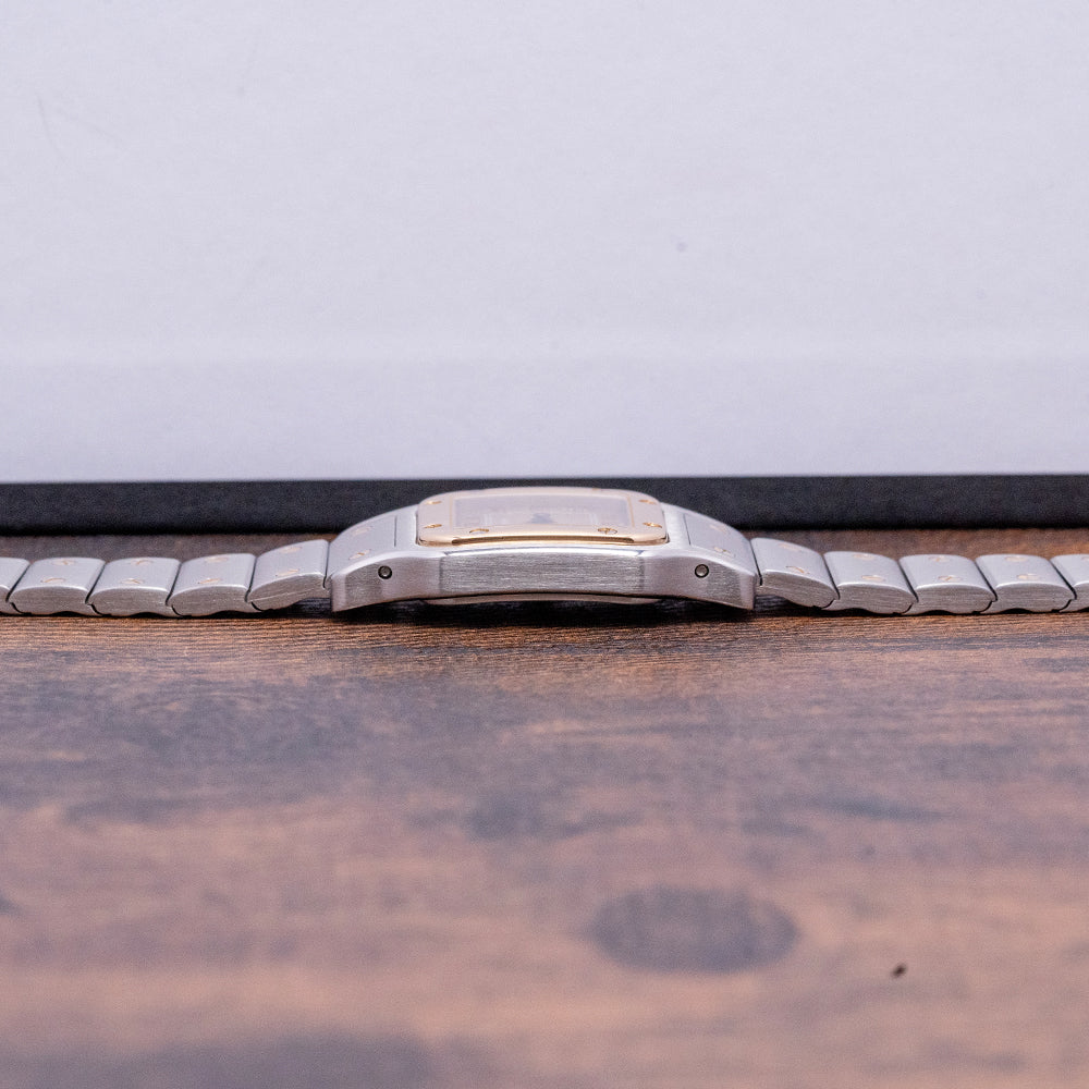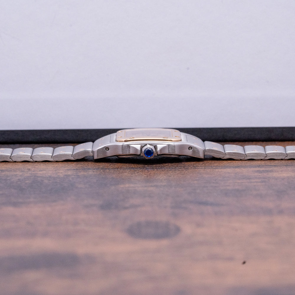 Here we have a 2000s Cartier Santos Galbée Steel & Gold 24mm 1567 with a polished and brushed curvaceous 24mm Steel case that curves over your wrist with finely tapered lugs, and a lug-to-lug length of 35mm and a case thickness of 6mm giving the watch an impressive and comfortable fit. On the right side is a crown featuring a blue cabochon, and an attractive 18ct yellow gold bezel holds a sapphire crystal above a stunning sunburst champagne dial that catches the light as you rotate your wrist. Applied Roman numerals with an inner minute track, and slender gold hands complete this beautiful dial. On the reverse, a solid screwed-down case back, inside an automatic Cartier signed Quartz movement. The watch comes paired with its polished and brushed steel & gold bracelet, which will fit up to a 6.25inch wrist