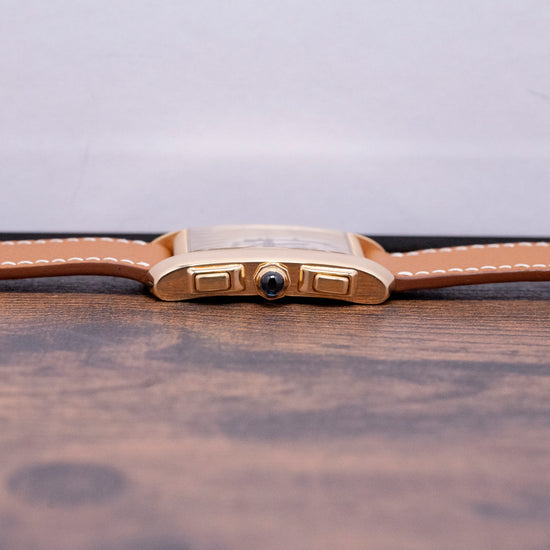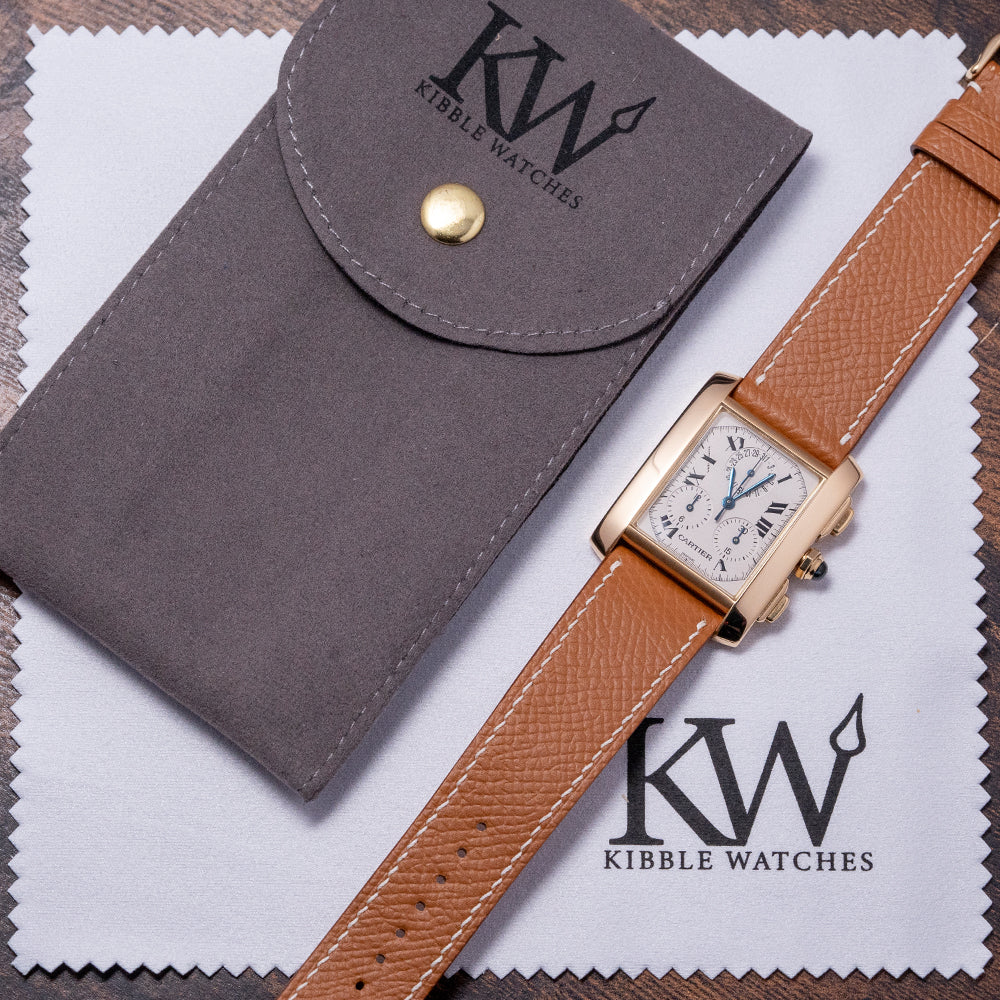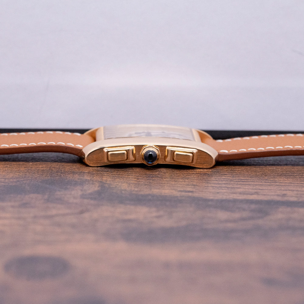 Here we have a charismatic 2000s Cartier Tank Française Quartz Chrono 18ct Gold 1830. The Tank Française collection was launched in 1996, presenting a modern interpretation of the classic Cartier Tank. Featuring its distinctive 18ct yellow gold ‘Tank’ case that sits comfortably on your wrist thanks to the broad parallel bezels, known as brancards, that extend the case, forming the angular cut lugs. Its straight flanks gently curve towards the lugs, with a lug-to-lug length of 36mm and a case thickness of just 6.5mm. Down the right side, we have the stepped square pushers and an octagonal crown topped with a blue sapphire cabochon. A flat sapphire crystal sits above a white dial with an unusual layout. An outer minute track is precisely executed, surrounding large exploding Roman numerals marking the hours, at 12 o’clock, a perpetual calendar register; at 4 o’clock, a 30-minute register and finally at 8 o’clock, a 12-hour register, each slightly recessed with a concentric circular pattern and a blued hand. Thermally blued hands are complemented by a tapered chronograph hand; at 6 o’clock, the Cartier motif completes this beautifully appointed chronograph. On the reverse, a brushed 18ct yellow gold screwed-down case back is hallmarked with the details of the watch. Inside a Quartz Cartier Cal. 212P movement. It comes paired with a short 20mm leather strap, featuring its original Cartier-signed 18ct yellow gold pin buckle.
