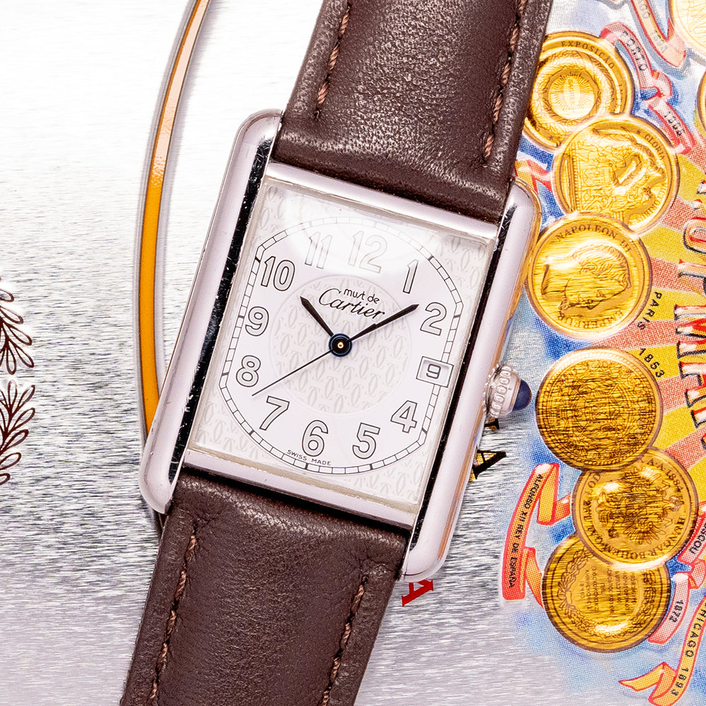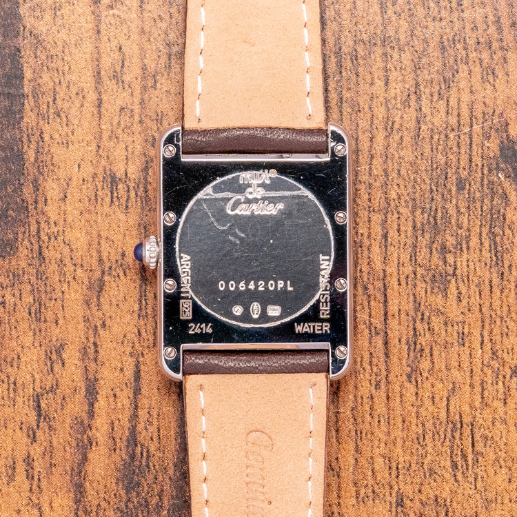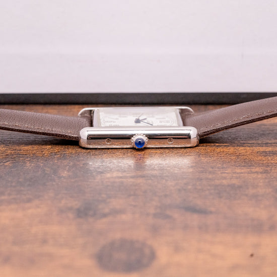 Here we have a 2000s Cartier Tank Must de Cartier 925 Silver 2414, part of the Must collection; it has an understated elegance to its 25mm 925 Silver case. Its slim, classic Tank profile ends with soft rounded corners, and a lug-to-lug length of 33mm and a case thickness of just 6mm leads to a comfortable fit on the wrist. Polished surfaces transition with perfect lines, and the characteristic Cartier crown with a blue cabochon inset is on the right side. A sapphire crystal sits above a crisp white dial with an attractive repeating Cartier logo, and an outer minute rail track surrounds outlined Arabic numerals marking the hours, at 3 o’clock, a colour-matched framed date window. Elegant thermally blued steel sword hands complete this sophisticated dress watch. On the reverse, we have a screwed-down case back. Inside is a Quality Quartz movement. The watch comes paired with a well-suited aftermarket 19mm leather strap and its original Cartier 19mm leather strap and clasp.