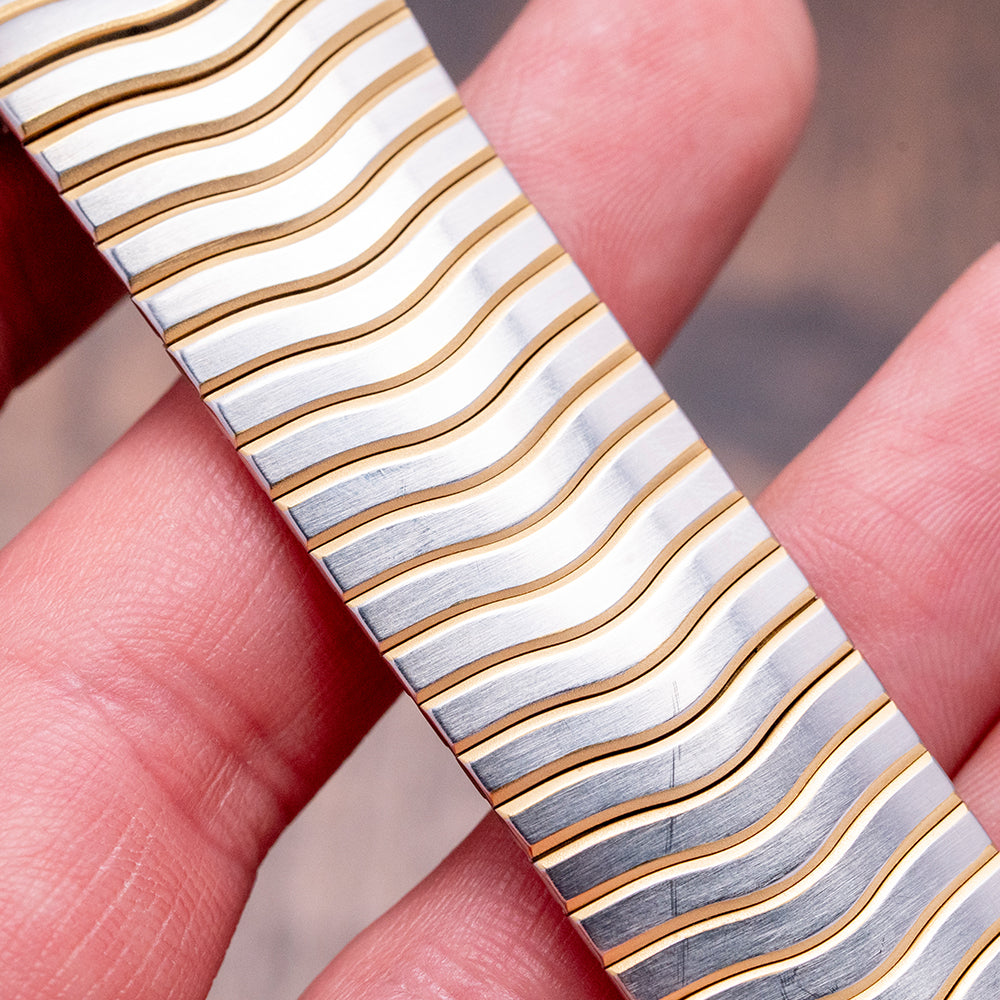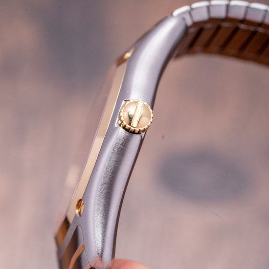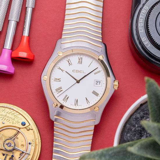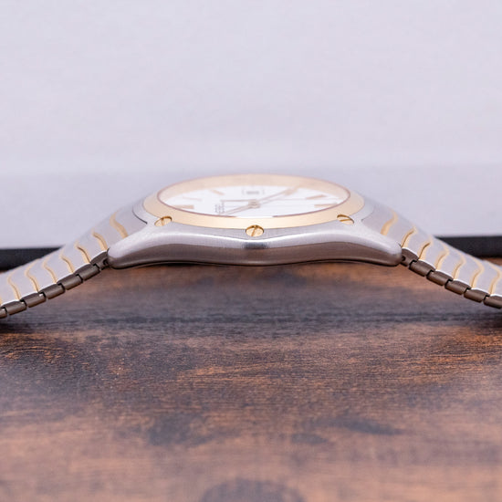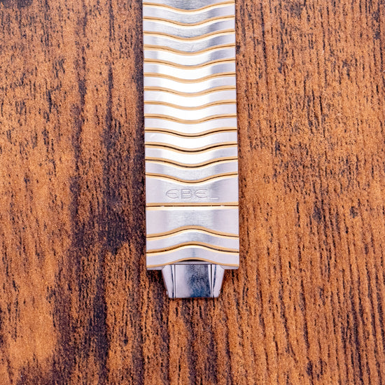 Here we have a great example of the 2000s Ebel Classic Wave Quartz 1255F41.1 with a curvaceous 37mm brushed stainless steel and yellow gold plated case that flows over your wrist towards the soft rounded lugs, a lug-to-lug length of 43mm and a case thickness of just 7mm ensures a comfortable fit. On the right side is a Gold plated crown that sits recessed into the case, and five yellow gold-plated screws surround a Yellow Gold-plated bezel that holds a flat sapphire crystal above a white dial. An outer minute track with hour pips surround attractive applied Yellow Gold-toned Roman numeral indices marking the hours, adding flair and sophistication; at 3 o’clock, a framed date window and Yellow Gold plated sword hands are complemented by a tapered second hand; at 12 o’clock we have the Ebel motif completing this distinctive dress watch. On the reverse, a screwed-down case back engraved with the details of the watch, inside an Ebel Quartz movement. The watch comes paired with its original 20mm Ebel Yellow Gold plated and stainless steel bracelet with a signed hidden deployment clasp. All links are included and this watch is sold with its original Ebel presentation box and original unsigned Ebel papers.