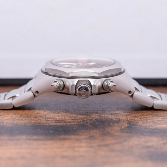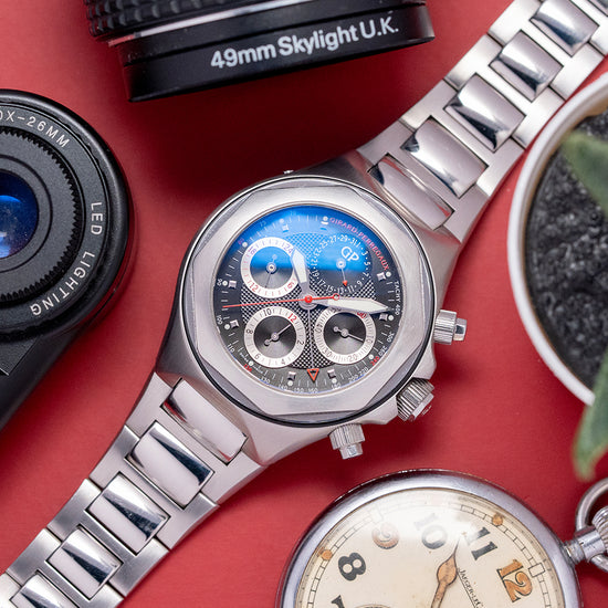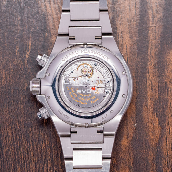 Here we have a rare 2000s Girard Perregaux Laureato EVO3 Chronograph 80180, a modern interpretation of their 1975 sporty dress watch designed by Gerald Genta, who has incorporated elements found in his AP Royal Oak creation. Featuring a 44mm stainless steel tonneau-shaped case with graceful, perfectly transitioned brushed lines that draw the eye to the integrated strap; a lug-to-lug length of 50mm and a case thickness of 14.5mm give the watch an impressive wrist presence. On the right side, we have the screw-down chronograph pushers and a signed screw-down crown with deep knurling for extra grip, protected by crown guards. On the left side, a recessed pusher to set the date register. A black gasket supports an octagonal brushed smooth bezel that holds a flat sapphire crystal above a striking, black dial with a dynamic Clous de Paris (waffle) pattern. An outer Tachymeter scale chapter ring surrounds applied indexes marking the hours. At 12 o’clock, a date register, at 3 o’clock, a silver ringed running seconds, at 6 o’clock, a silver ringed 12-hour register and at 9 o’clock, a silver ringed 24-hour register. Broad-sword hands are filled with lume, an arrow hand indicating the passing chronograph minutes, and a tapered chronograph hand sits on top. At 12 o’clock, we have the printed Girard Perregaux motif that completes this stunning vintage-inspired, versatile traveller's sports watch. On the reverse, a screwed-down exhibition case back, inside an automatic GP Cal. GP033C0, 52 jewels, beating at 28,800 beats per hour; this movement features a base of the thin Cal. GP 3300 with a Dubois-Depraz module. It comes paired with its Girard Perregaux 25mm integrated brushed stainless steel bracelet secured with a push-button release deployant clasp; it will fit up to a 7.25-inch wrist. This watch is sold with its original Girard Perregaux Box, missing its cushion, signed swing tag and unsigned paperwork.