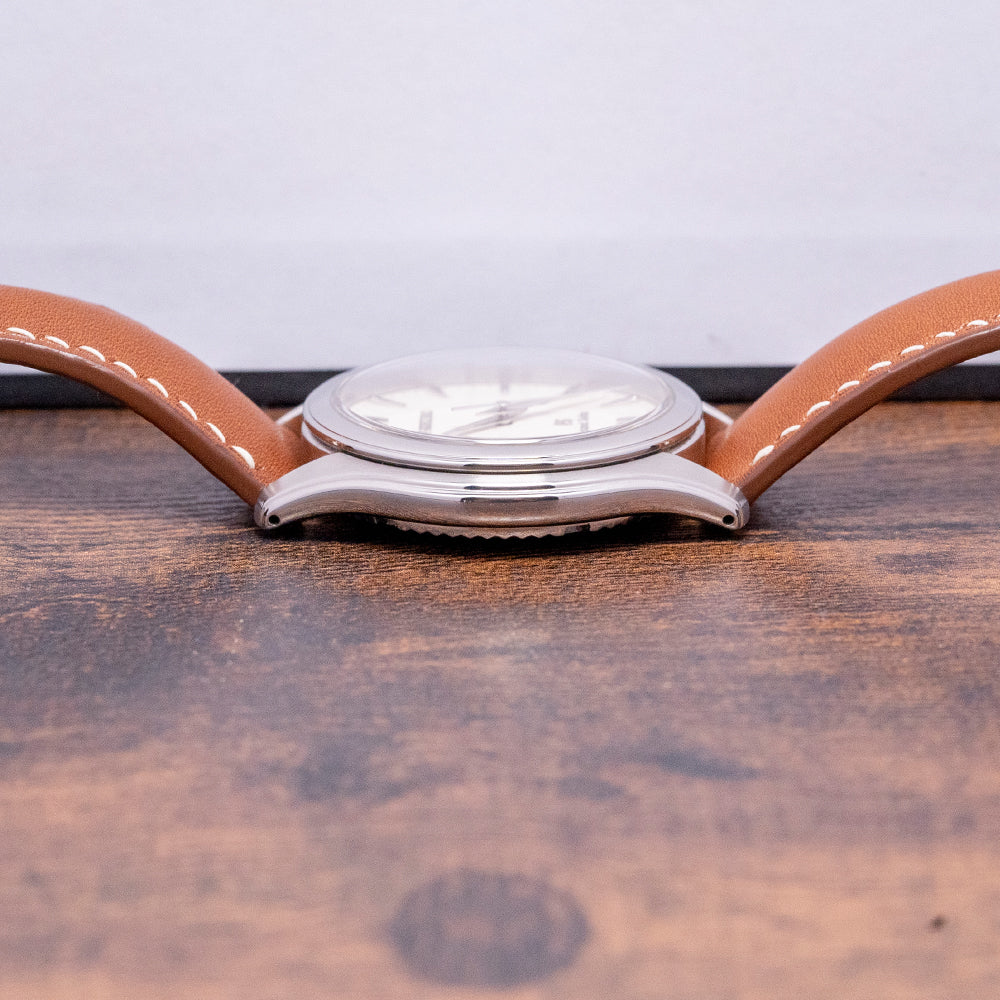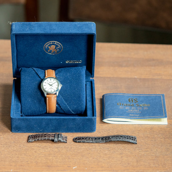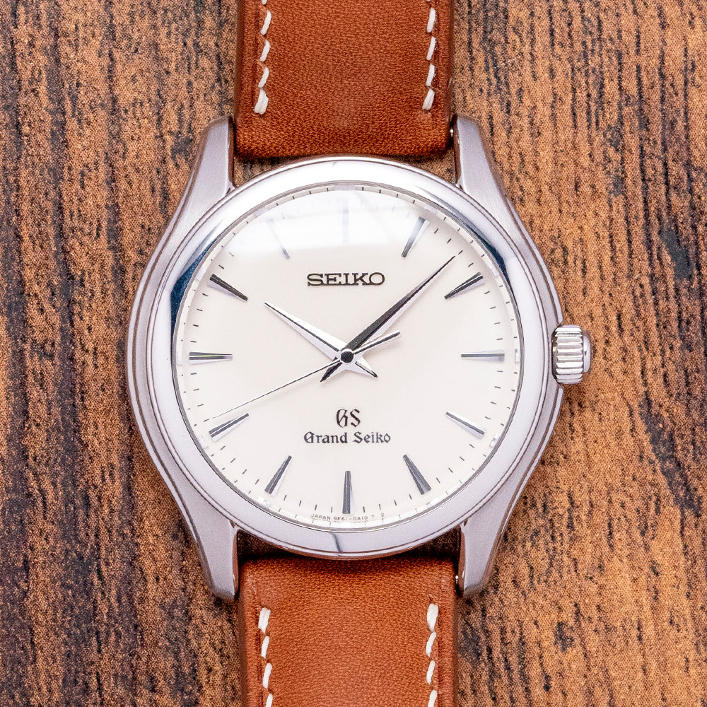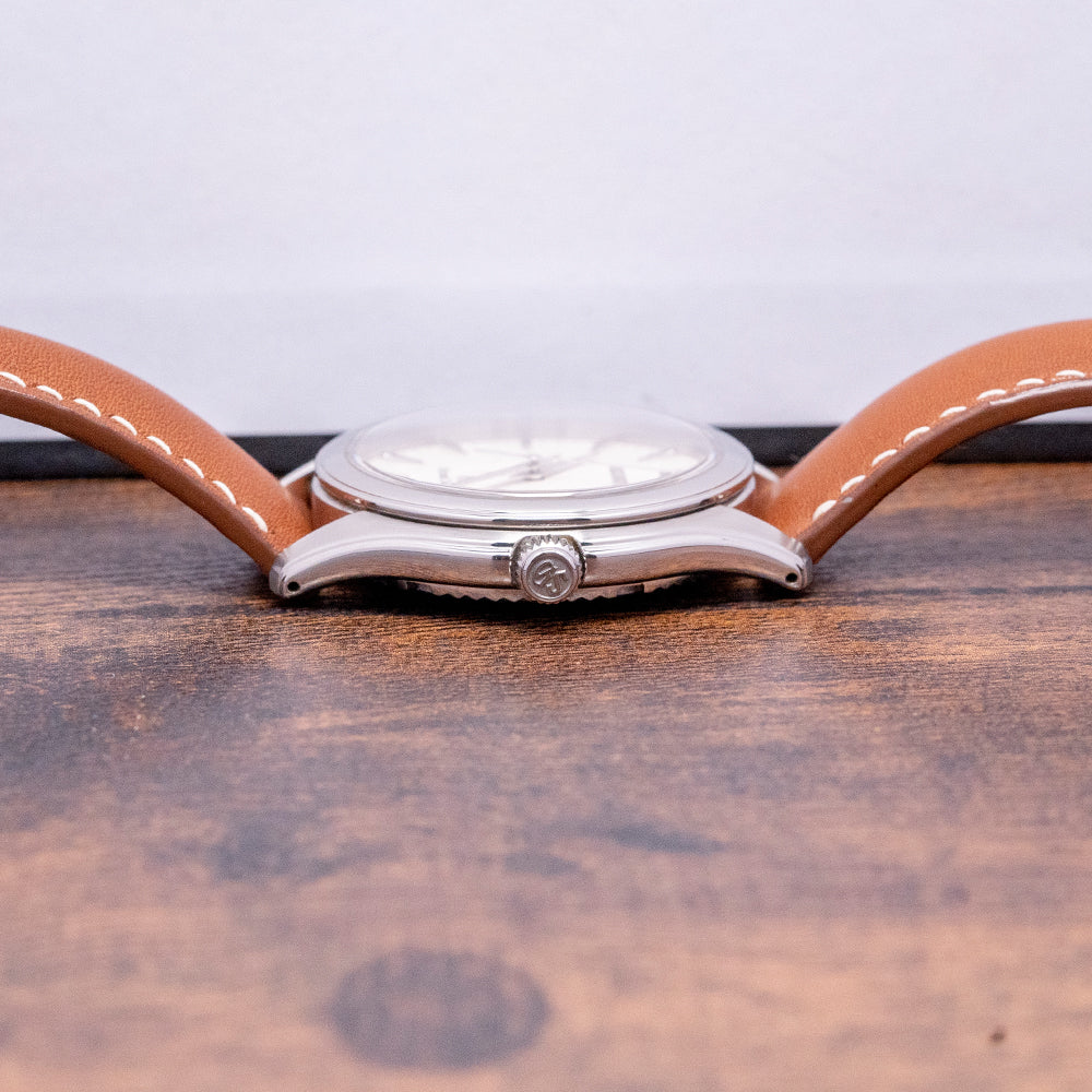 Here we have a 2000s Grand Seiko 9F Quartz White Dial SBGX009 with a 36mm polished and brushed stainless steel case; the subtle curve of the case has polished soft edges leading to drilled lugs and a lug-to-lug length of 40mm and a case thickness of 10mm ensures a comfortable fit on your wrist. On the right side, a signed crown and a smooth polished stepped bezel hold a sapphire crystal above a striking crisp white dial. An outer minute track surrounds applied dagger indexes with precisely chamfered edges Zaratsu polished; as you rotate your wrist, the dial magically plays with the light. Elegant steel dauphine hands have been expertly Zaratsu polished and are complemented by a tapered second hand; at noon, we have an applied Seiko at 6 o’clock, an applied GS, and precisely printed Grand Seiko to complete this sophisticated dress watch. On the reverse, a screw-down case back with polished fluted sides and brush finishing around the Grand Seiko Lion embossed in the centre, reminding us of the past Grand Seiko’s medallions, inside a Grand Seiko 9F61 Quartz calibre, a top-tiered Quartz movement. Seiko grows their own quartz crystals, and using a higher torque allows them to use these heavier GS hands; keeping their brand aesthetic intact, they have incorporated a backlash auto-adjust mechanism that controls every single tick of the second hand accurately and perfectly in time. The watch comes paired with an 18mm Strap Tailor leather strap and includes its original 18mm leather strap with a signed pin buckle. It also comes with its 2000s Grand Seiko presentation box and booklet.