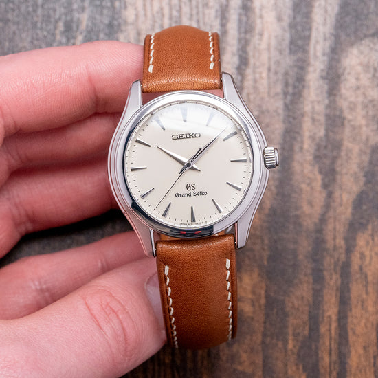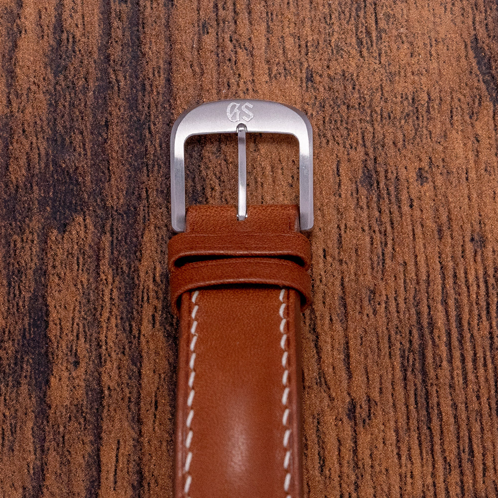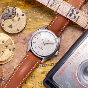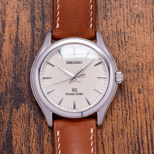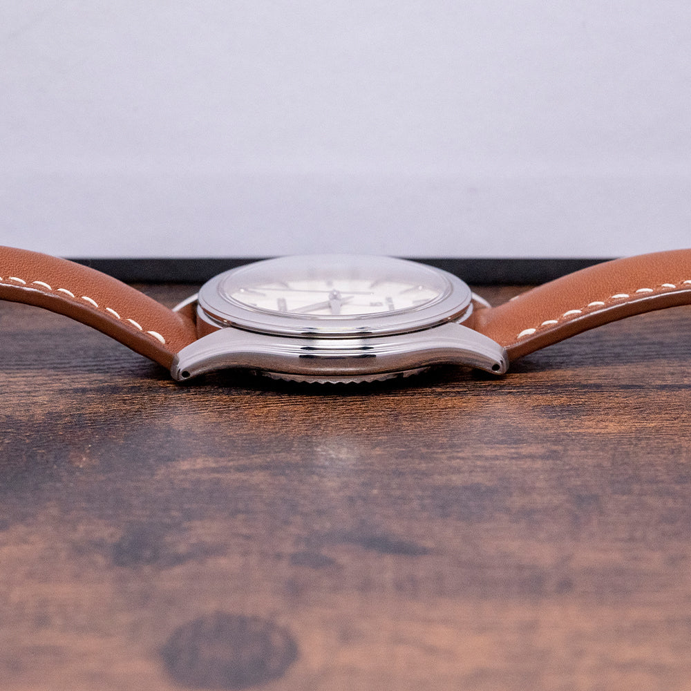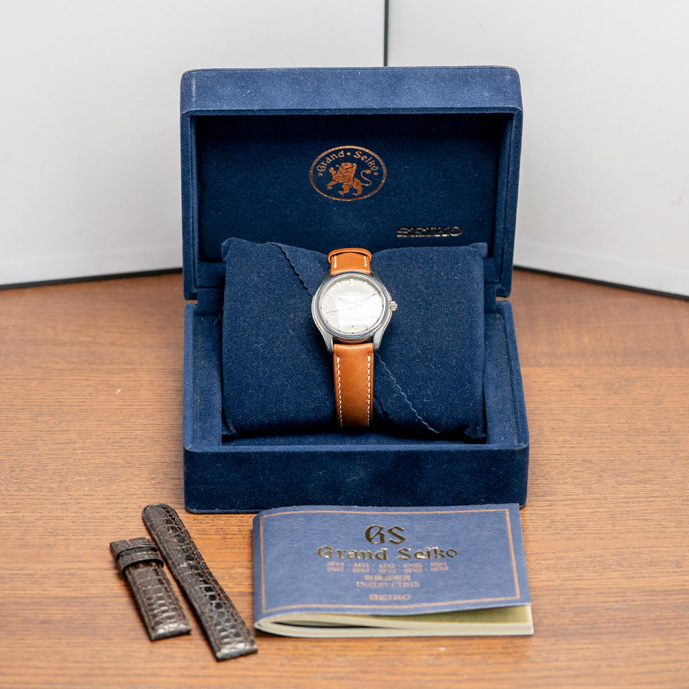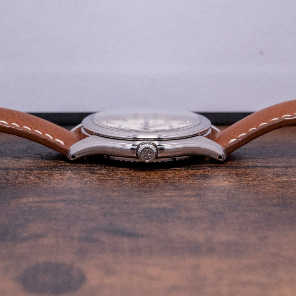 Here we have a 2000s Grand Seiko 9F Quartz White Dial SBGX009 with a 36mm polished and brushed stainless steel case; the subtle curve of the case has polished soft edges leading to drilled lugs and a lug-to-lug length of 40mm and a case thickness of 10mm ensures a comfortable fit on your wrist. On the right side, a signed crown and a smooth polished stepped bezel hold a sapphire crystal above a striking crisp white/eggshell dial. An outer minute track surrounds applied dagger indexes with precisely chamfered edges Zaratsu polished; as you rotate your wrist, the dial magically plays with the light. Elegant steel dauphine hands have been expertly Zaratsu polished and are complemented by a tapered second hand; at noon, we have an applied Seiko at 6 o’clock, an applied GS, and precisely printed Grand Seiko to complete this sophisticated dress watch. On the reverse, a screw-down case back with polished fluted sides and brush finishing around the Grand Seiko Lion embossed in the centre, reminding us of the past Grand Seiko’s medallions, inside a Grand Seiko 9F61 Quartz calibre, a top-tiered Quartz movement. Seiko grows their own quartz crystals, and using a higher torque allows them to use these heavier GS hands; keeping their brand aesthetic intact, they have incorporated a backlash auto-adjust mechanism that controls every single tick of the second hand accurately and perfectly in time. The watch comes paired with an 18mm Strap Tailor leather strap and includes its original 18mm GS leather strap with a GS signed pin buckle. It also comes with its 2000s Grand Seiko presentation box and booklet.