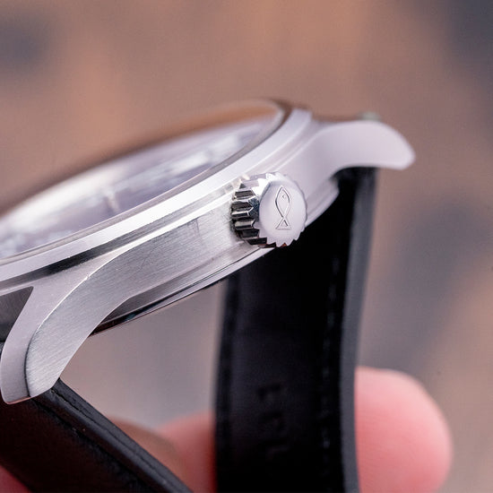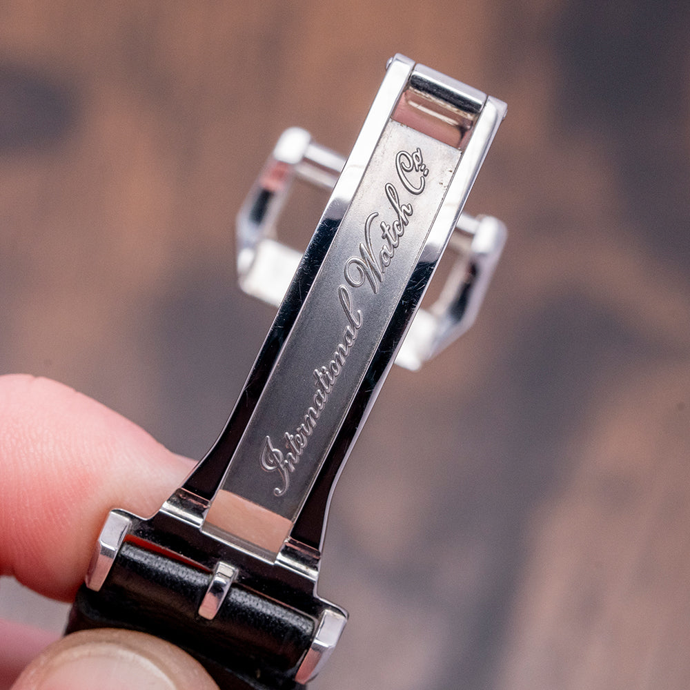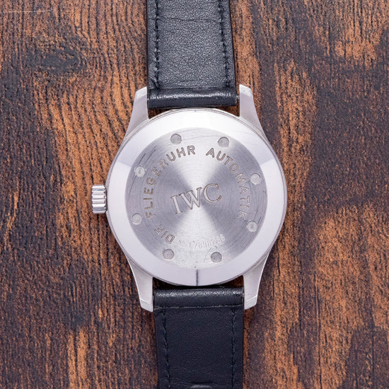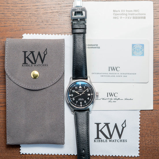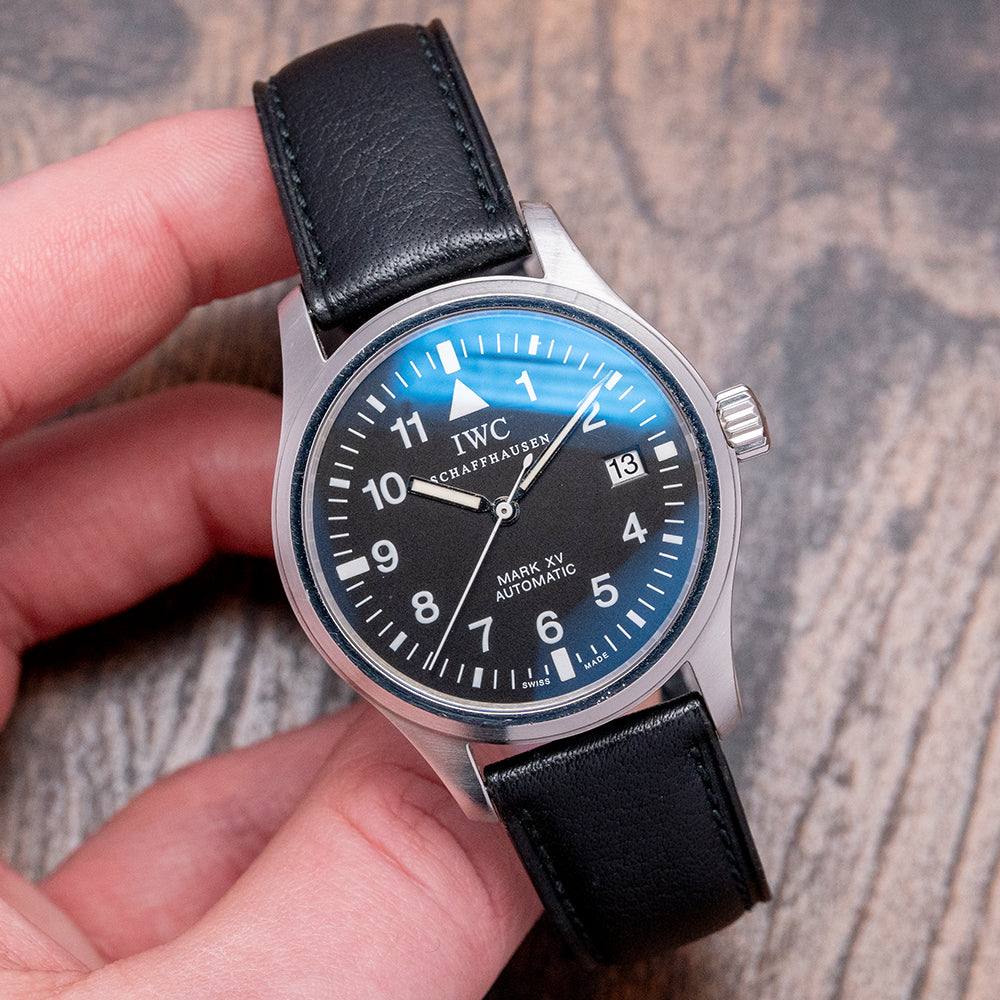 Here we have a 2000s IWC Pilot Mark XV on Leather Strap IW3253. The classic Mark XV was produced from 1999 until 2005, and the Mark X line of watches can trace its heritage back to 1944 when it was issued to the military. The 38mm satin brushed stainless steel case curves over your wrist with a lug-to-lug length of 46.5mm and a case thickness of 10.5mm, ensuring a comfortable fit on your wrist. On the right side, we have a signed crown. The smooth bezel holds a slightly domed sapphire crystal above a matte black dial, and an outer minute track is precisely executed with lume-coated batons and Arabic numeral indices marking the hours. At 3 o'clock, there is a date window; at 12 o’clock, we have the large triangle, slender baton and sword hands coated in lume are complemented by a teardrop counterweighted sweeping second hand. Printed at 12 o’clock, we have the IWC motif, and at 6 o’clock, "Mark XV Automatic" completes this vintage-inspired pilot watch. On the reverse, a screw-down case back with the details of the watch and IWC engraved into it, inside an automatic IWC Cal. 30110, which has a base of the ETA 2892-A2, 21 jewels, 28,800 beats per hour; the movement is heavily modified by IWC. The watch comes fitted on its 19mm black IWC leather strap with a signed buckle.