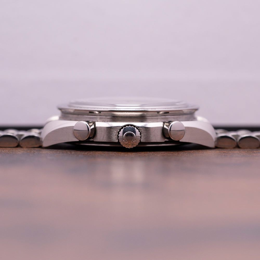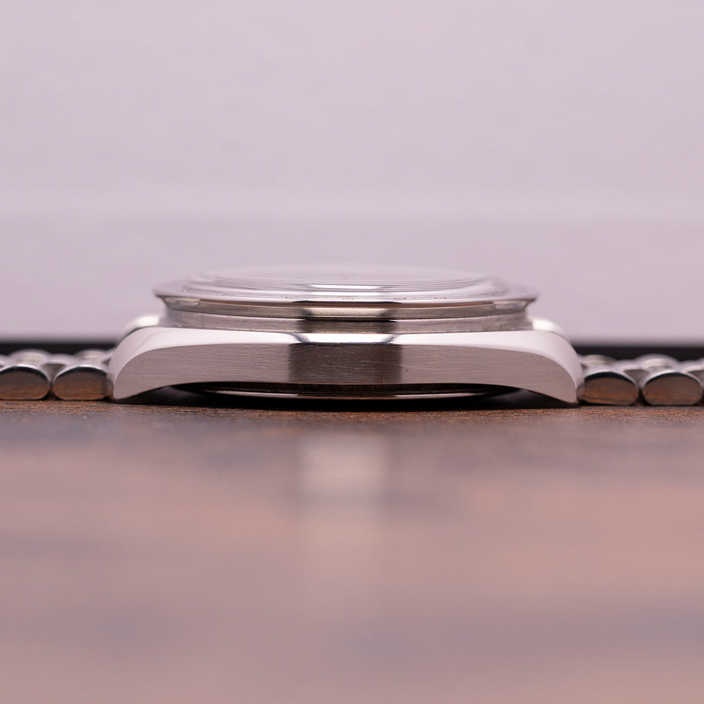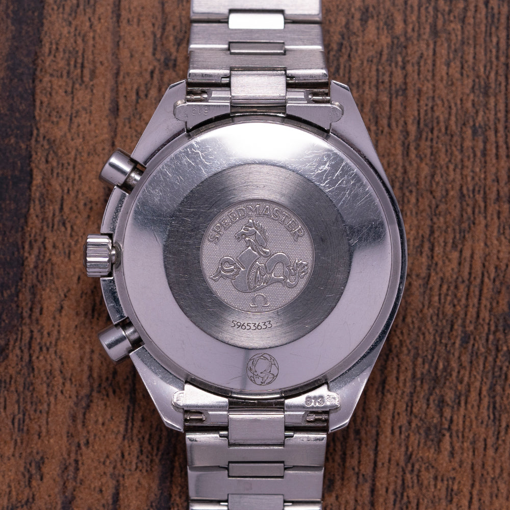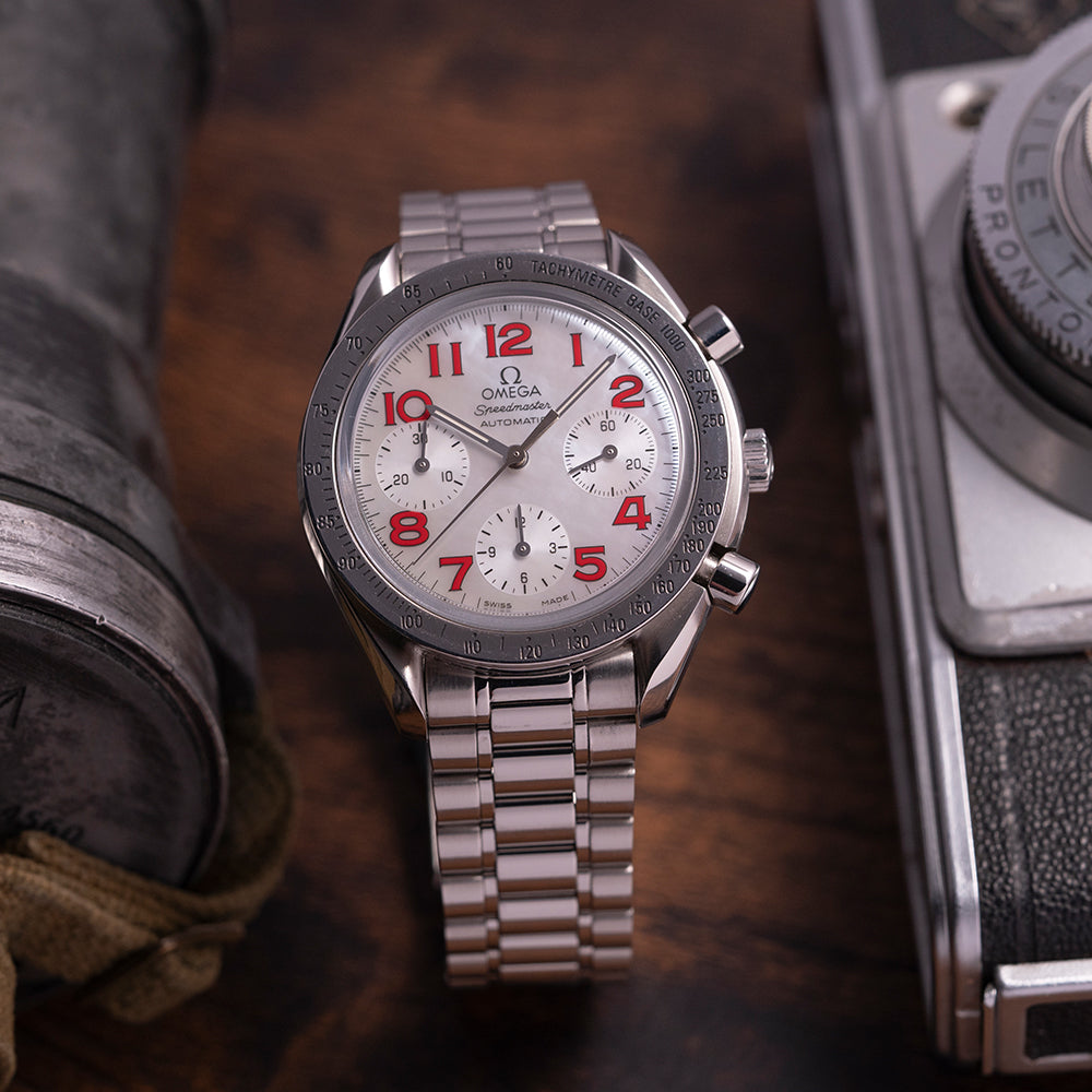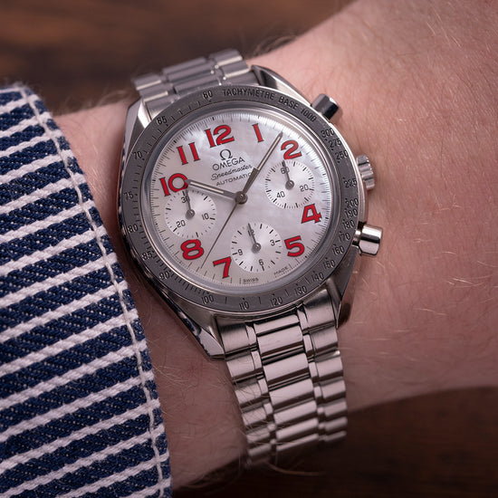 Here we have a 2000s Omega Speedmaster Reduced MOP 3534.79.00 with a 39mm satin-brushed and polished stainless steel case that curves over your wrist with the characteristic twisted lugs, a lug-to-lug length of 44.5mm and a case thickness of 12mm ensures a comfortable fit on your wrist. Down the right side, we have the recessed piston-style chronograph pushers and in the centre a signed crown. The fixed stainless steel bezel has an engraved Tachymeter scale with its numerals painted in black, holding a domed sapphire crystal above the stunning Mother of Pearl dial. An outer minute track is precisely executed with vibrant red Arabic numerals marking the hours, at 3 o’clock we have the continuous seconds register, at 6 o’clock a 12-hour register and finally at 9 o’clock a 30-minute register. Slender sword hands are infilled with luminance and complemented by a tapered chronograph hand, at 12 o’clock you will find the Omega Speedmaster motif completing this mesmerising tool watch that magically catches the light as you rotate your wrist, a true feast for the eyes. On the reverse, we have an embossed Hippocampus on a textured centre of a snap-off case back, inside an automatic Omega Cal. 3220, 47 jewels, beating at 28,800 beats per hour, the movement is based on an ETA 2890-A2 calibre, with a Dubois-Dépraz 2020 chronograph module stacked on top. The watch comes paired with an original Omega 18mm stainless steel bracelet.