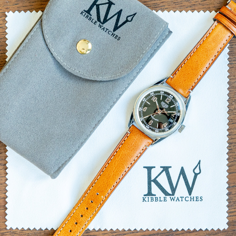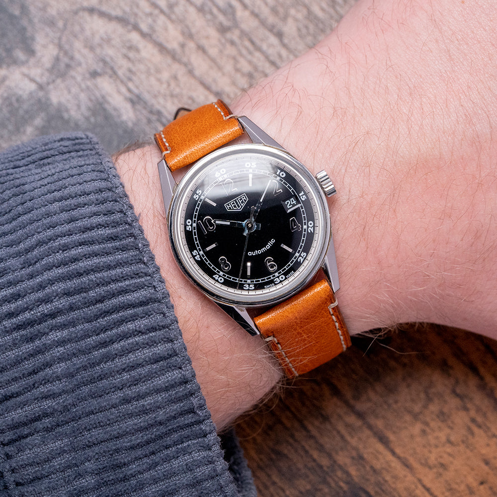 This 2000s Heuer Carrera Automatic 1964 Re-Edition WS2111 celebrates the introduction of the Carrera 3648 in 1964 by Jack Heuer; it is part of the Heuer Classics range and is the re-edition of the Carrera 3648. The polished 35mm stainless steel case has bevel-edged tapered angular lugs, a lug-to-lug length of 44mm and a case thickness of 10.5mm, giving the watch an impressive wrist presence. We have a large signed crown on the right side with deep knurling. A slim bezel holds a domed plexiglass crystal, and the glossy black dial has a white outer decimal chapter ring surrounding a 60-minute rail track Tritium pips above applied polished Arabic numerals, steel batons marking the hours. At 3 o’clock, a colour-matched date window. At 12 o’clock, the Heuer logo and at 6 o’clock, the smiley “automatic” signifying an ETA movement that perfectly finished off this classic dial. On the reverse, Heuer is engraved in the centre with the reference numbers below, inside an automatic ETA Cal. 2824-2, 25 jewels, 28,800 beats per hour; the movement has the quickest date, hacking seconds and hand winding for your convenience. It comes paired with a 19mm Italian leather strap with its original Heuer buckle.