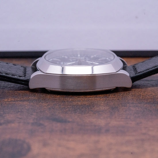 Here we have a 2000s TAG Heuer Monza Chronograph Automatic CR2113-0 inspired by a Heuer watch designed in 1933, it was a manual wound single pusher through the crown chronograph, this 37mm cushion stainless steel case is similar to the original except that one was only 33mm. Polished sides and brushed tops transition perfectly with crisp bevelled edges, and a lug-to-lug length of 44mm and a case thickness of 12.5mm give the watch an impressive wrist presence. Down the right side, an onion crown with the two piston-style pushers on either side. A flat sapphire crystal sits above the black dial, an outer minute track is precisely executed with lume pips surrounding Arabic 12 and facet-edged indexes marking the hours, as you rotate your wrist the dial and indexes catch the light perfectly. Between the 4 and 5 a date window. At 3 o’clock 60 seconds continuous register, at 6 o’clock a twelve-hour register, and finally at 9 o’clock a 30-minute register, each recessed in a cushion shape like the case. The dial is well-balanced and easy to read with the large registers. Sword’s hands are filled with LumiNova. Printed at 12 o’clock “Monza” “TAG HEUER”. On the reverse, a screwed-down case back with “Monza TAG HEUER” engraved into it, inside an automatic TAG Heuer Cal. 17, 37 jewels, 28,800 beats per hour, a module is added to the base ETA 2894-2. The watch comes fitted on a 20mm leather strap and its original TAG Heuer 20mm leather strap with a signed deployment clasp.