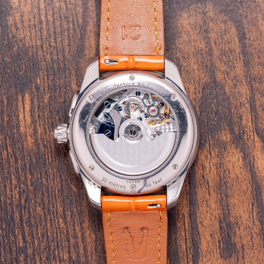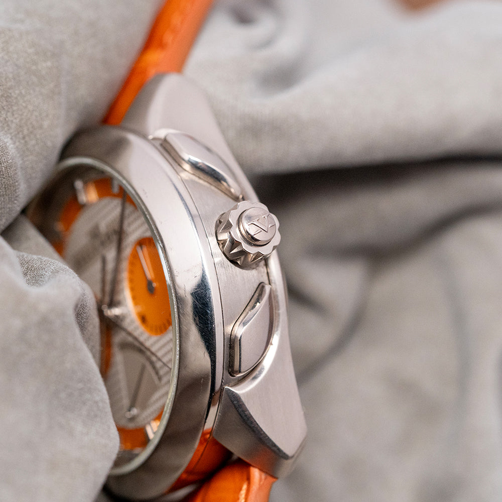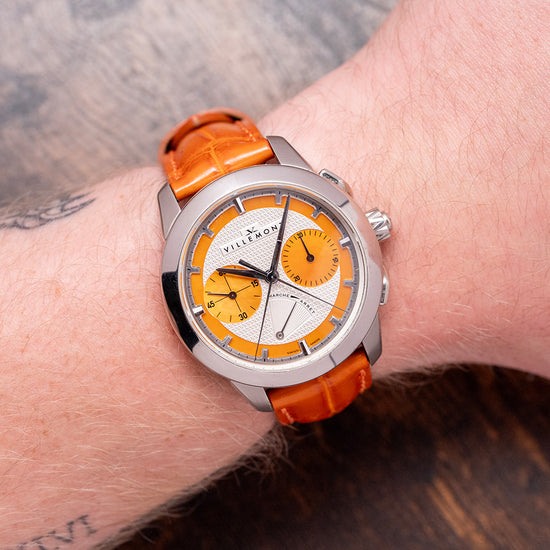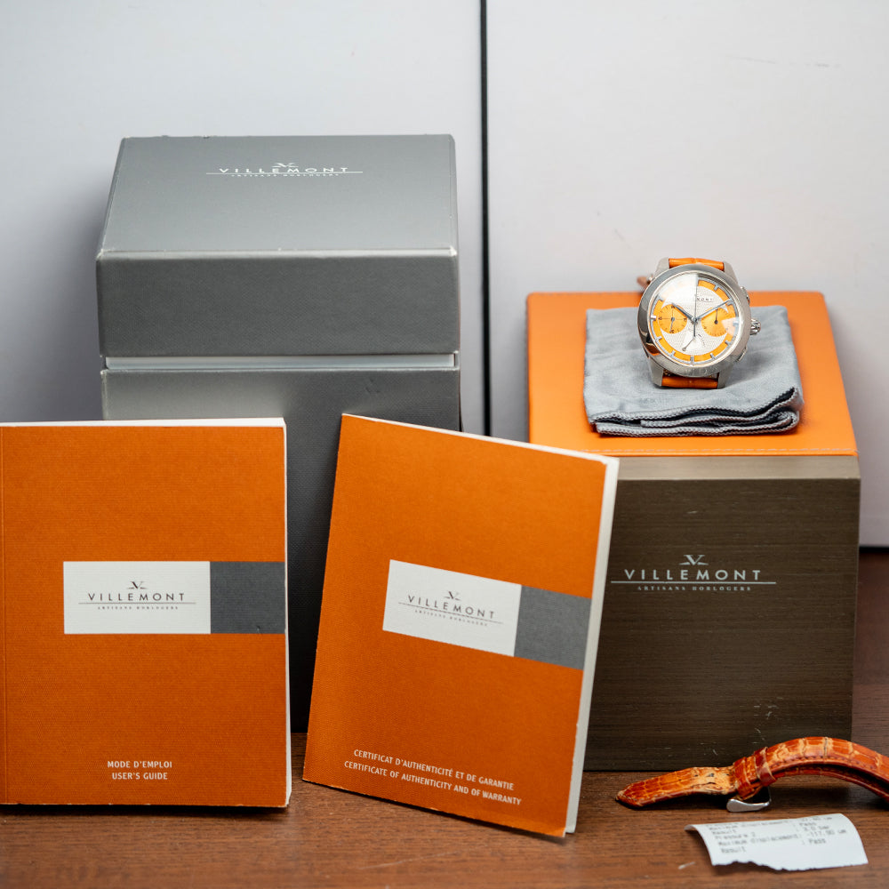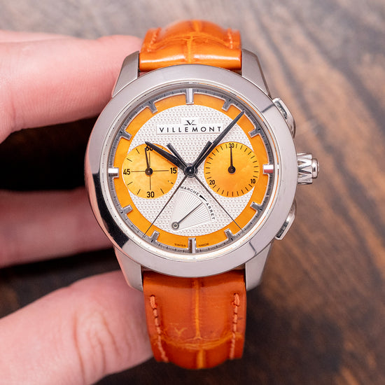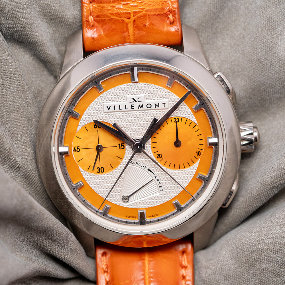Here we have a 2000s Villemont 18ct White Gold Split-Second Chronograph featuring a brushed and polished 43mm 18ct white gold round case, with a total gold weight of 120 grams, that comfortably sits on your wrist, thanks to the thick tapered lugs. The sculpted brushed flanks lead to a lug-to-lug length of 49mm and a case thickness of 16.5mm, giving the watch an impressive wrist presence. Down on the right side, there are the teardrop-shaped chronograph pushers and a deep knurled crown in the centre. The sloping, polished, and smooth bezel features a domed crystal above a stunning Mother-of-Pearl bi-compax dial. An outer minute chapter ring has faceted baton indexes marking the hours, surrounding an attractive Mother-of-Pearl ring and Guilloché patterned centre disc with the 30-minute register at 3 o’clock, a running seconds at 9 o’clock, each in Mother-of-Pearl and black markings, at 6 o’clock a power reserve indicator, and slender hands are complemented by the split-seconds and chronograph hands, at noon we have the Villemont motif completing this charismatic sports watch. On the reverse, a screwed-down exhibition case back is engraved with the details of the watch around its edge. Inside is an automatic Modified ETA 7750, featuring 25 jewels that beat at 28,800 beats per hour. This heavily modified movement incorporates a split-second complication, enabling the simultaneous timing of two distinct events. It comes paired with two 21mm leather straps and an 18ct White Gold pin buckle. This watch is sold with its original Villemont box and paperwork.
