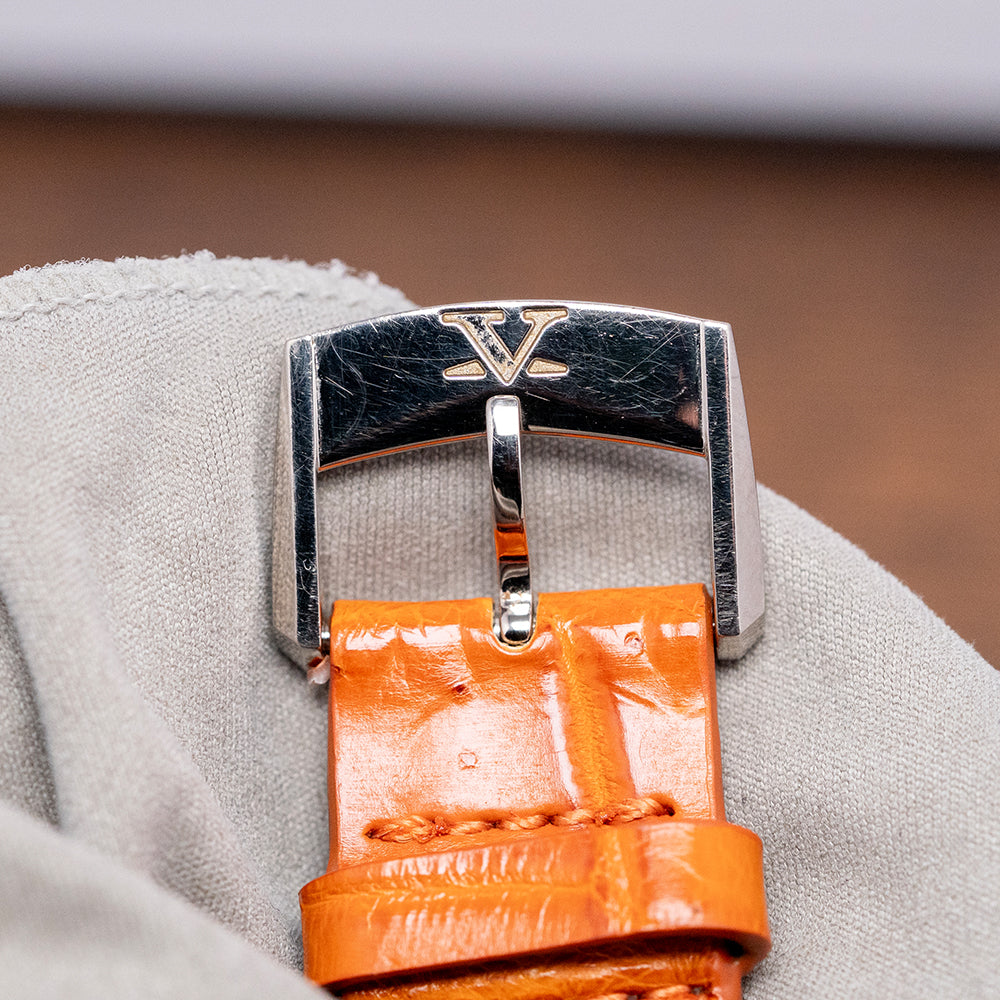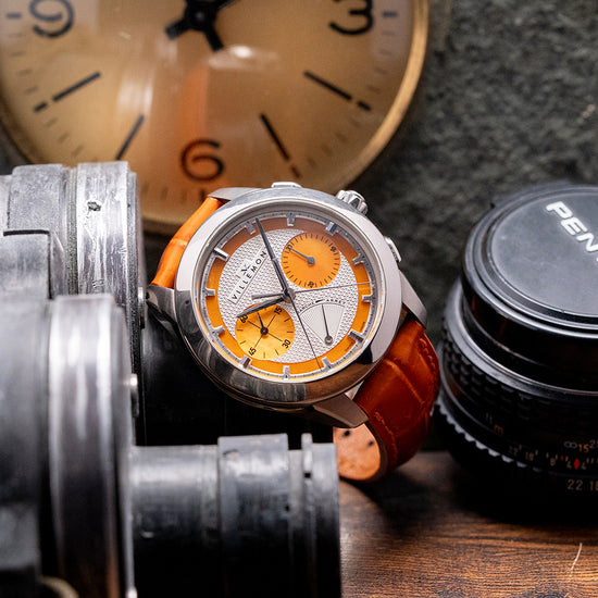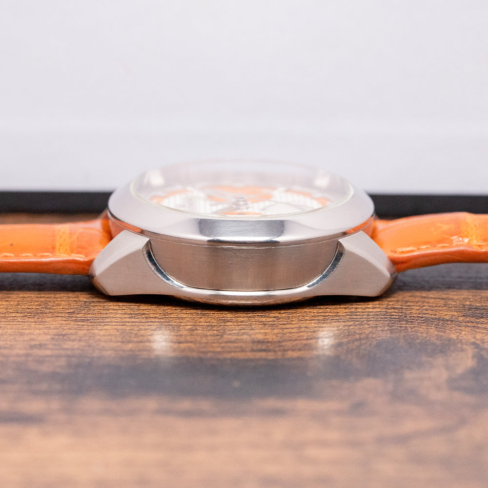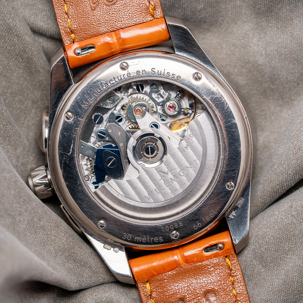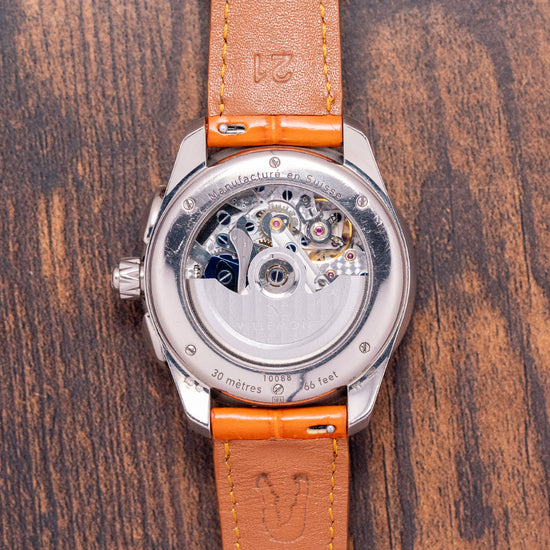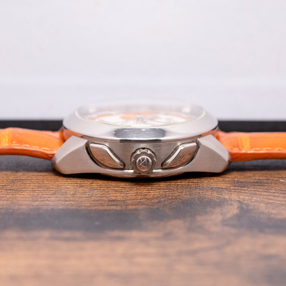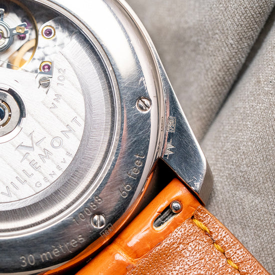 Here we have a 2000s Villemont 18ct White Gold Split-Second Chronograph featuring a brushed and polished 43mm 18ct white gold round case, with a total gold weight of 120 grams, that comfortably sits on your wrist, thanks to the thick tapered lugs. The sculpted brushed flanks lead to a lug-to-lug length of 49mm and a case thickness of 16.5mm, giving the watch an impressive wrist presence. Down on the right side, there are the teardrop-shaped chronograph pushers and a deep knurled crown in the centre. The sloping, polished, and smooth bezel features a domed crystal above a stunning Mother-of-Pearl bi-compax dial. An outer minute chapter ring has faceted baton indexes marking the hours, surrounding an attractive Mother-of-Pearl ring and Guilloché patterned centre disc with the 30-minute register at 3 o’clock, a running seconds at 9 o’clock, each in Mother-of-Pearl and black markings, at 6 o’clock a power reserve indicator, and slender hands are complemented by the split-seconds and chronograph hands, at noon we have the Villemont motif completing this charismatic sports watch. On the reverse, a screwed-down exhibition case back is engraved with the details of the watch around its edge. Inside is an automatic Modified ETA 7750, featuring 25 jewels that beat at 28,800 beats per hour. This heavily modified movement incorporates a split-second complication, enabling the simultaneous timing of two distinct events. It comes paired with two 21mm leather straps and an 18ct White Gold pin buckle. This watch is sold with its original Villemont box and paperwork.