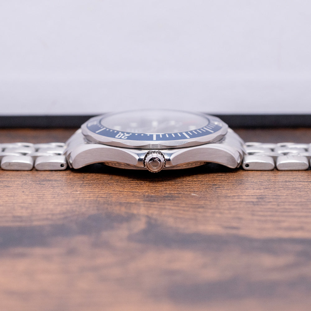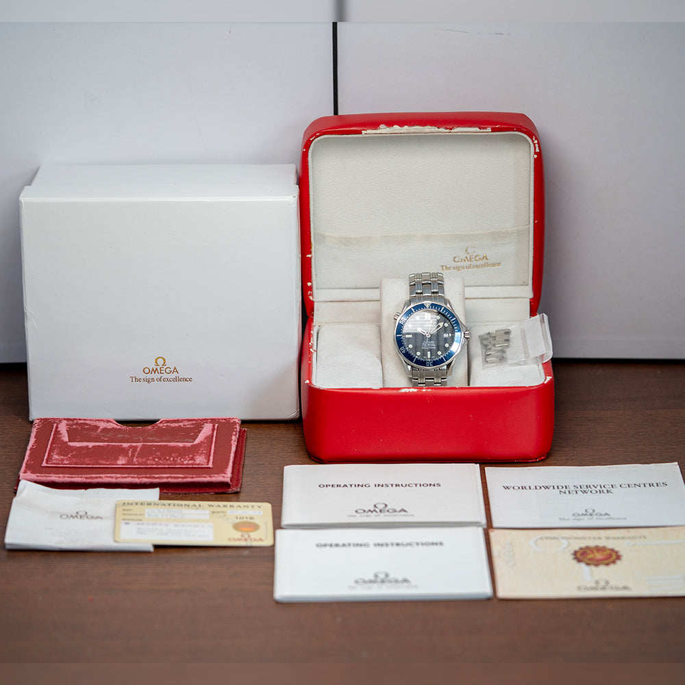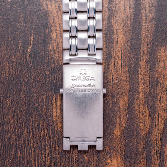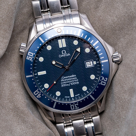 Here we have a classic 2001 Omega Seamaster Diver 300M Blue Auto 2531.80.00 featuring a 41mm polished and brushed stainless steel case, twisted lugs with a lug-to-lug length of 47mm and a case thickness of 11.5mm, giving the watch an impressive wrist presence. On the right side is a signed screw-down crown protected by crown guards, and at 10 o’clock on the left side, a helium escape valve. The unidirectional bezel has scalloped sides for extra grip and a blue dive insert with silver numerals and markings. A domed Sapphire crystal sits above a deep blue dial featuring a dynamic wavy pattern, and an outer minute track has disc and baton indexes coated in luminous material marking the hours. At 3 o’clock, a framed date window, skeletonised sword hands have lume tips complemented by a red-tipped lollipop sweeping second-hand. At 12 o’clock, we have the Omega motif. At 6 o’clock, ‘Seamaster Professional Chronometer 300m/1000 ft ' is printed underneath. On the reverse, a screw-down case back with engraved waves and a polished Hippocampus in the centre, a seahorse that represents Neptune, the God of the sea, it was conceived by Pierre Borie after seeing a picture of Neptune riding a chariot pulled by seahorses. It is the reason why the seahorses are wearing a bridle, first seen on the Seamaster in 1958. Inside an automatic Omega Cal. 1120, 23 jewels, 28,800 beats per hour, the movement has hacking seconds and a quick-set date for your convenience. The watch comes paired with its 20mm Omega stainless steel, brushed and polished, bracelet, secured by a signed push-button-released folding clasp. The watch comes paired with its 18mm Omega polished and brushed stainless steel bracelet with a signed push-button-released folding clasp. This watch is sold with its original Omega box and Omega paperwork.