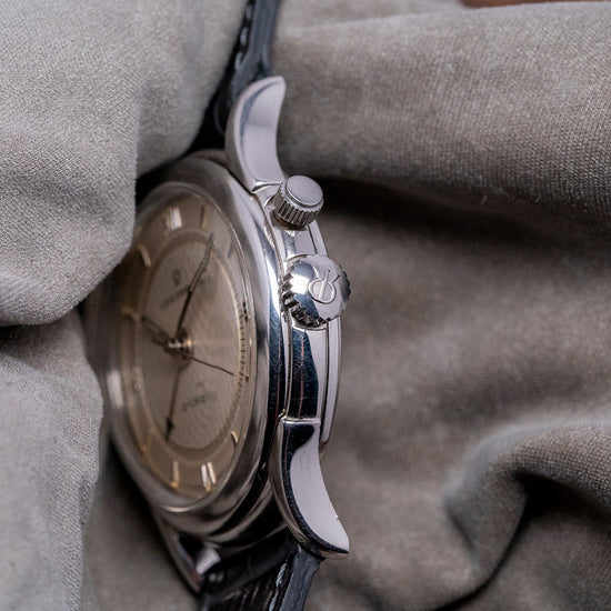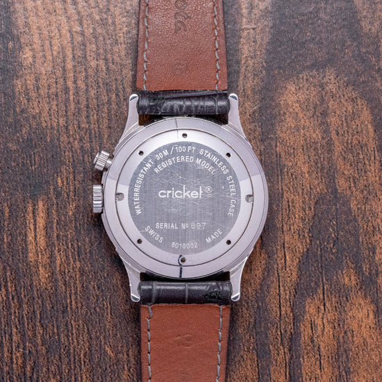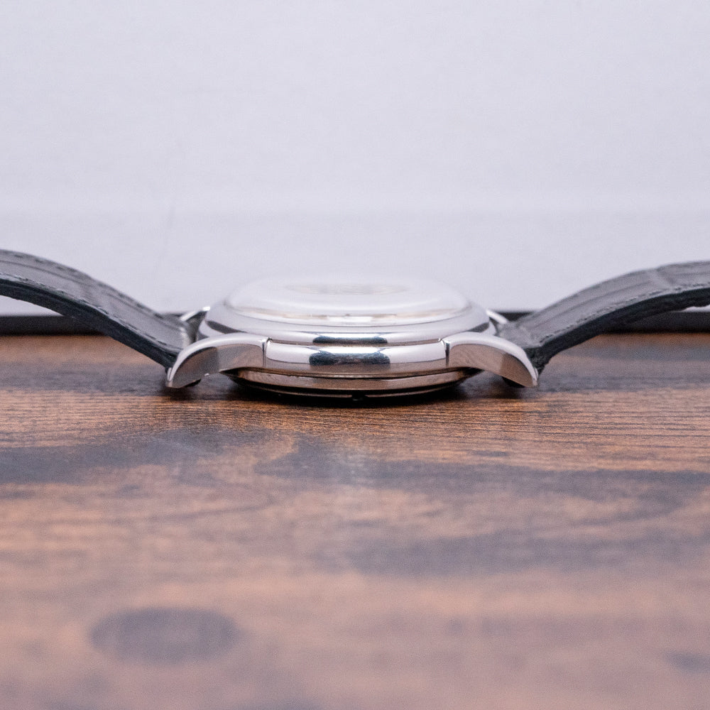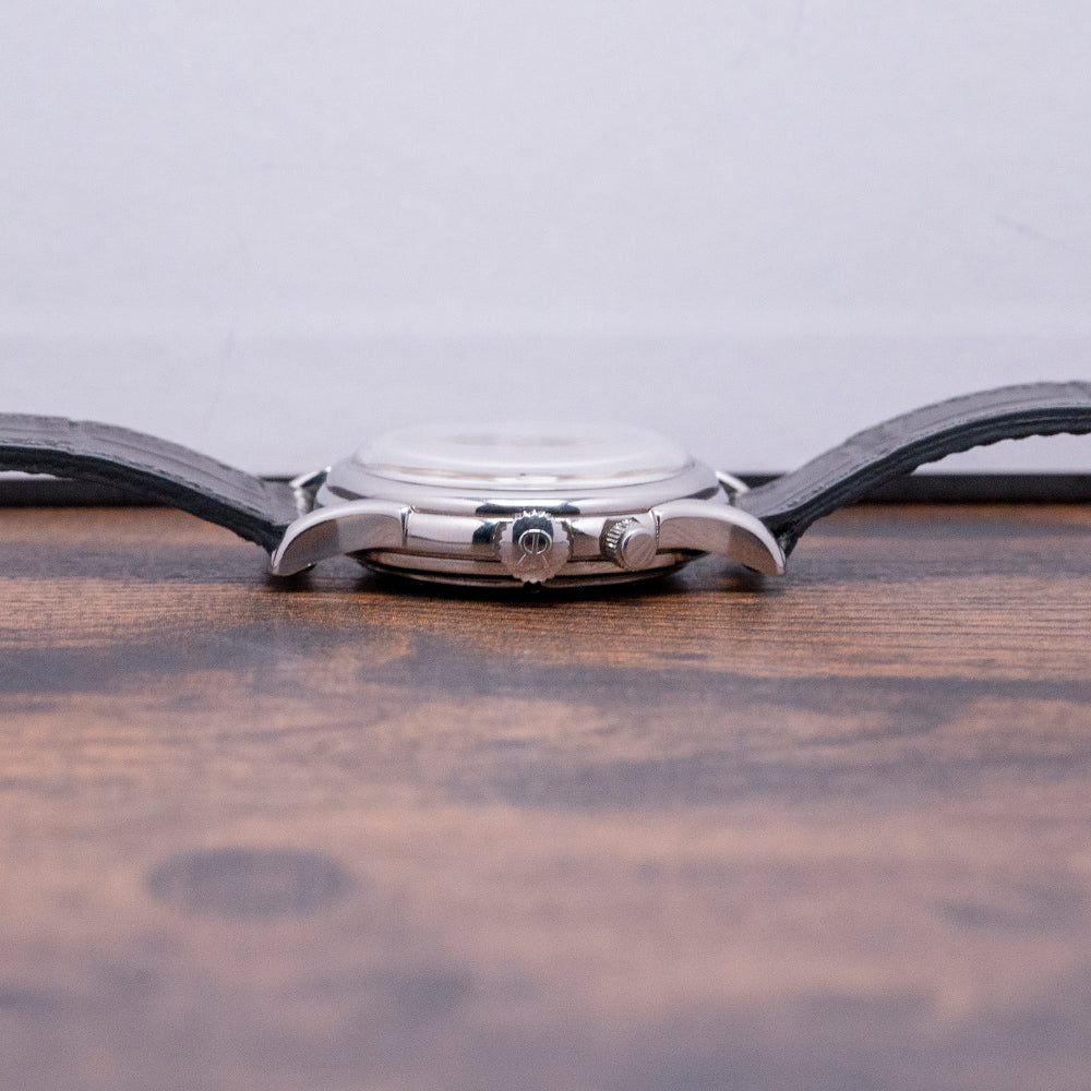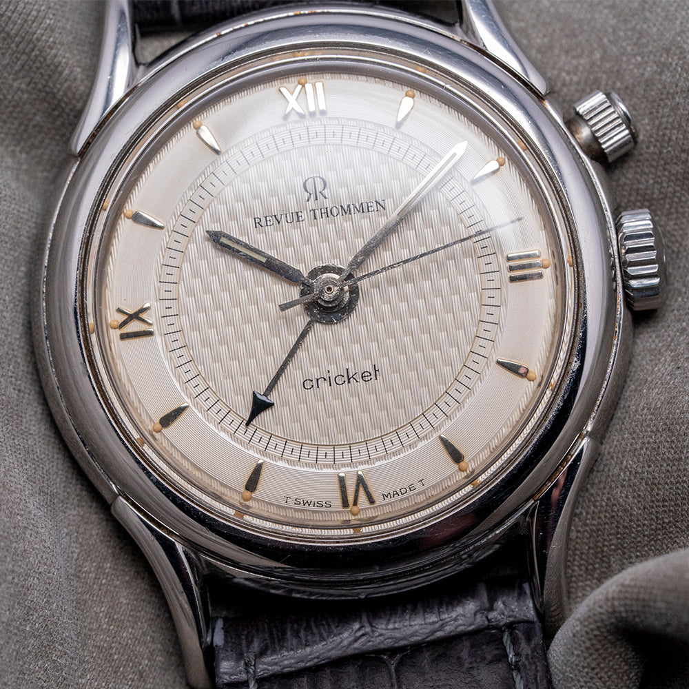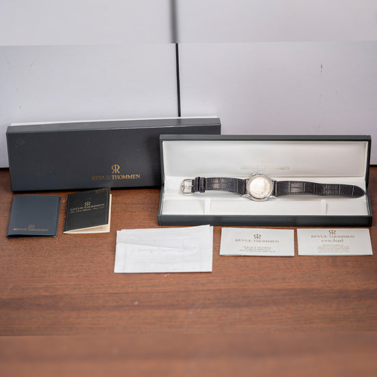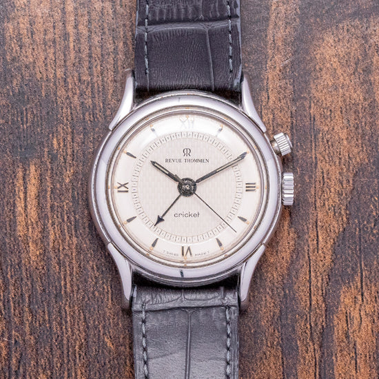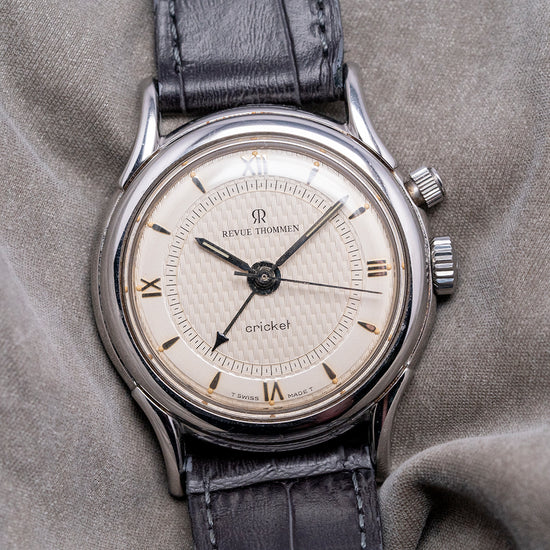 Here we have a 2001 Revue Thommen Cricket Alarm, which was originally released in 1947 and has a long history of being presented to all US presidents from Harry Truman, including the Soviet president Mikhail Gorbachev. This interesting movement patent was owned by MSR Holdings, which allowed both Vulcain and Revue Thommen to produce Cricket watches. Montres Vulcain SA was founded in 2001, bringing together both brands under one roof. The 35mm polished stainless steel case comfortably curves over your wrist thanks to the fancy tapered horn lugs. Its curved flanks lead to a lug-to-lug length of 42.5mm and a case thickness of 12mm. Down the right side, we have the crown to wind the Cricket alarm and set it, and a signed crown with knurling for grip in the centre. The stepped bezel holds a domed acrylic crystal above a striking cream dial. Applied polished gold-toned Roman numerals at the cardinal points and arrowhead indexes with Tritium pips mark the hours. An inner seconds and minute ring is useful for setting the alarm, slender polished gold toned sword hands filled with Tritium, a blue painted arrow tipped hand to indicate the Alarm and a tapered second hand sit majestically in the centre of the intricate guilloché dial, at noon we have the Revue Thommen motif and at 6 o’clock ‘Cricket’ completes this vintage inspired timepiece. On the reverse, a screw-down case back engraved with the details of the watch. Inside a manually wound Revue Cal. RT80, 17 jewels, beating at a leisurely 18,000 beats per hour, fitted with two independent barrels, one for the alarm and the other for the watch, the patented movement was originally released in 1947. It comes paired with a well-suited 19mm leather strap and the original pin buckle. This watch is sold with its original Revue Thommen box and paperwork, including its original purchase receipt.