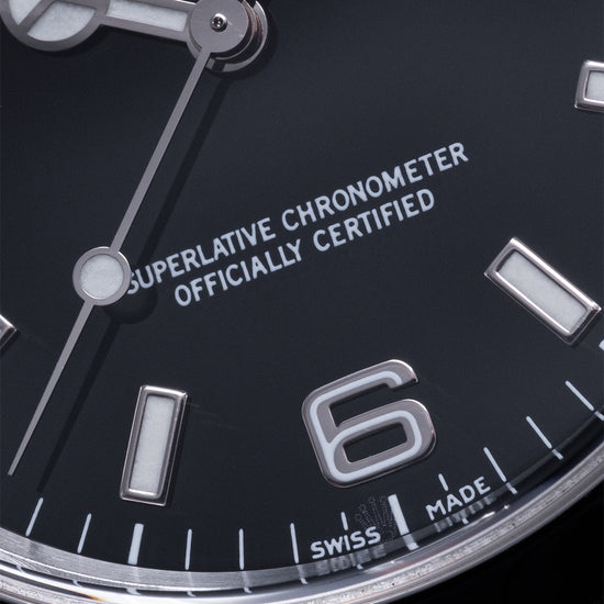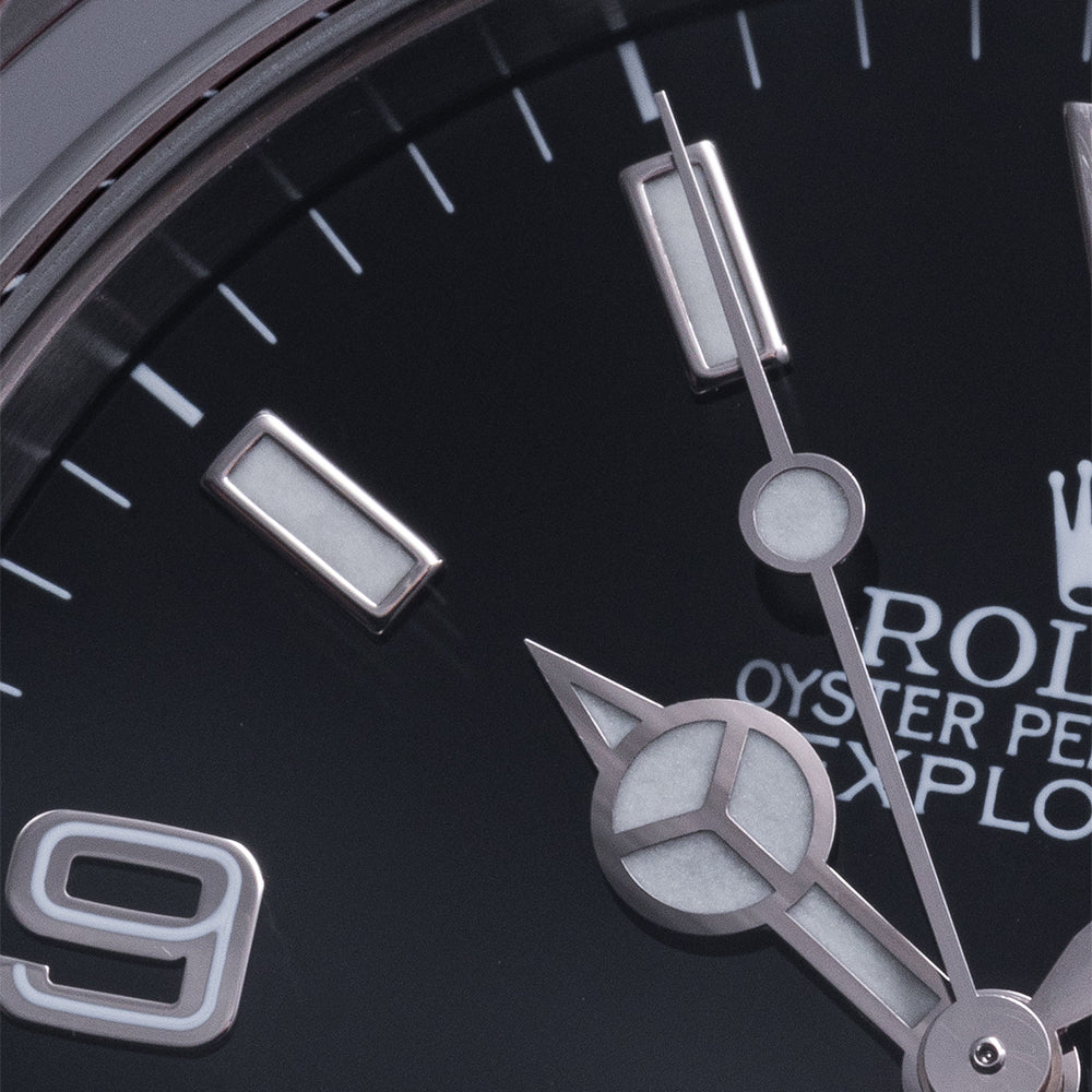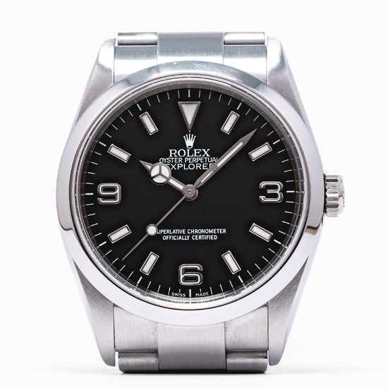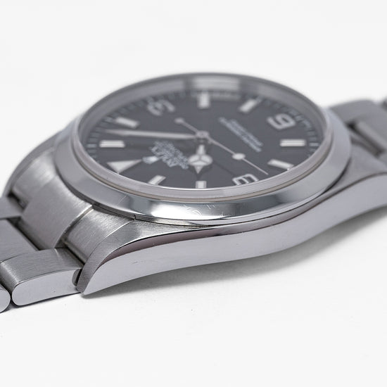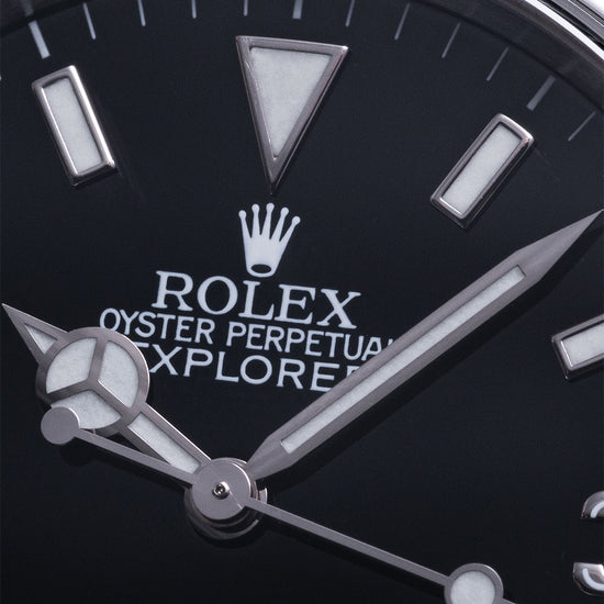 The Rolex Explorer was first introduced in 1953, shortly after the first successful summit of Everest by Sir Edmund Hillary. The Rolex Oyster Perpetual Chronometers used by the expedition were the forerunner of the explorer, albeit without the name. In 1989 the reference 1016 was discontinued after 26 years of production. To replace it the reference 14270 brought with it modern upgrades such as acrylic crystal to sapphire crystal and a newer movement, the automatic Cal. 3000. During the 90s Rolex switched from tritium to Luminova and from 2001 Super LumiNova. Later in 2001, they introduced the reference 114270 which had the updated automatic cal. 3130 and a minor thickness increase from 11.5mm to 12.0mm. Here we have a 2001 Rolex Explorer 1 36mm 114270 on bracelet that has a 36mm stainless steel Oyster case that curves over your wrist with tapered lugs, a lug-to-lug length of 44mm and a thickness of 12mm gives the watch an excellent wrist presence. This is the last version to have a 36mm case due to Rolex introducing the reference 214270 at Baselworld increasing its size to 39mm in 2010, until recently Rolex has again brought back the iconic 36mm size. Its polished and brushed surfaces transition perfectly towards tapering lugs. On the right is a large screw-down crown, its polished smooth bezel holds a flat sapphire crystal. The glossy black dial has applied white gold framed Arabic numerals at 12, 3, 6, and 9. with white gold framed baton indexes infilled in Super Luminova, elegant Mercedes’s hands are also Super LumiNova infilled. At 12 o’clock we have the Rolex motif “Rolex Oyster Perpetual Explorer” and at 6 o’clock “Superlative Chronometer Officially Certified”. On the reverse, a coin-edged screw-in case back, inside an automatic Rolex Cal. 3130, 31 jewels, 28,800 beats per hour, COSC Chronometer Certified movement. The watch comes fitted on its Rolex stainless steel Oyster bracelet with a signed deployment clasp and solid end links, polished sides and brushed links give the watch a quality finish.