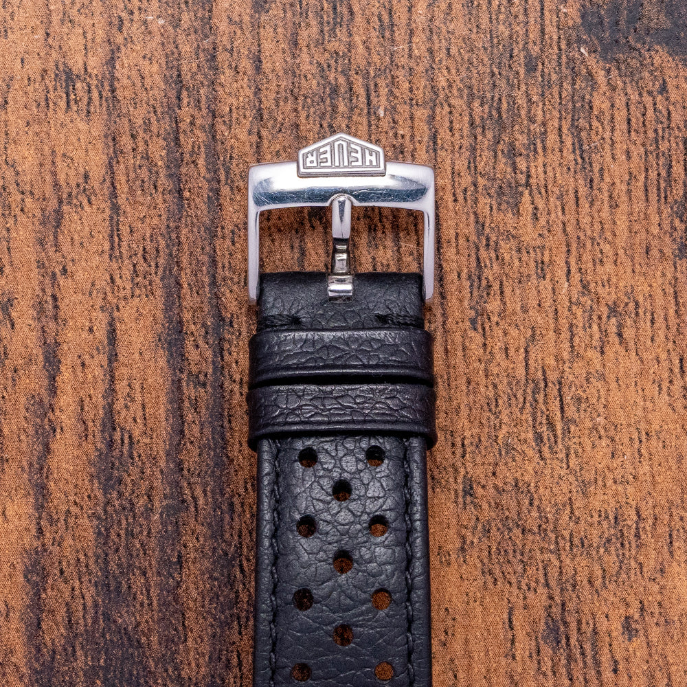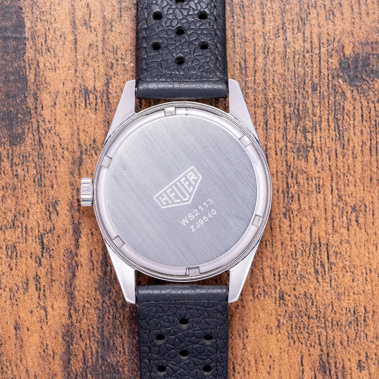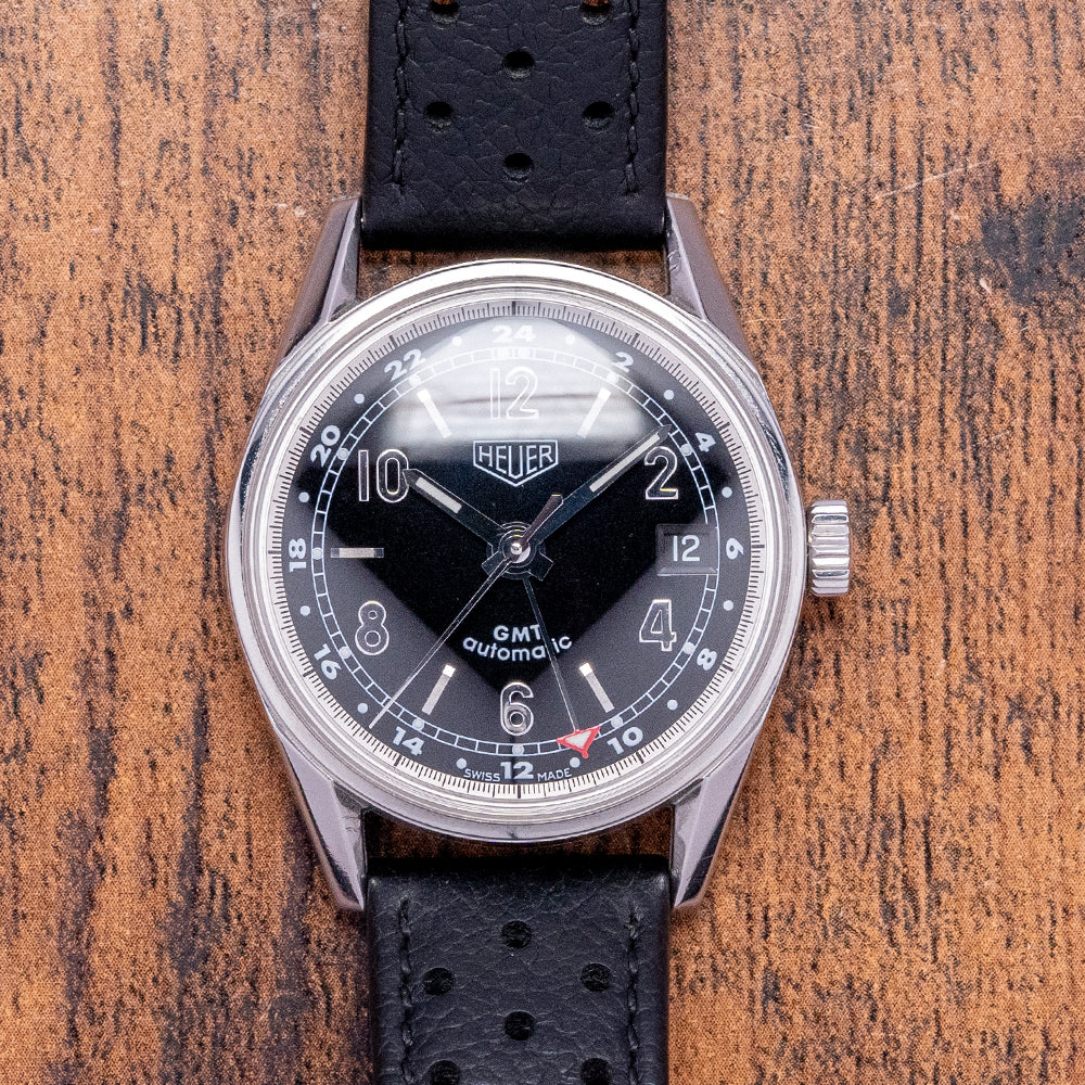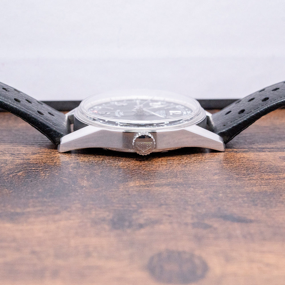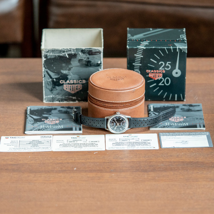 This collector's set 2002 Heuer Carrera GMT 1964 Re-Edition WS2113 celebrates the introduction of the Carrera 3648 in 1964 by Jack Heuer; it is part of the Heuer Classics range and is the re-edition of the Carrera 3648. The polished 35.5mm stainless steel case has bevel-edged tapered angular lugs, a lug-to-lug length of 43.5mm and a case thickness of 10.5mm, giving the watch an impressive wrist presence. On the right side, a signed crown. A slim bezel holds a domed plexiglass crystal, the glossy black dial has a white outer minute chapter ring, printed Arabic, 24-hour numerals, run around the outer edge with applied steel Arabic numerals and batons marking the hours. At 3 o’clock, a date window. Sword hands with lume infill, tapered seconds hand and a GMT hand with red triangle, making it easy to read. At 12 o’clock, the Heuer logo and at 6 o’clock GMT Automatic finished off this classic dial and traveller companion. On the reverse, Heuer is engraved in the centre with the reference numbers below, inside an automatic ETA 2893-2, 21 jewels, 28,800 beats per hour, the movement has the quickest date, and GMT functions when you pull the crown out to position 1, turn clockwise/forward to adjust the GMT, and counter-clockwise/backward to adjust the date. The watch comes on a 19mm black Italian leather strap with a signed buckle and comes with its Heuer Classics box, leather travel case and paperwork.