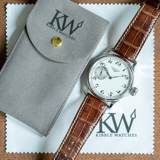 Here we have a classic 2002 Longines Heritage Avigation Maxi 47mm L2.639.4 Limited Edition of 500 pieces, launched in honour of Philip van Horn Weems, inventor of Navigation instruments and Navigation methods, who was the mentor of Charles A. Lindbergh. The shapely 47mm polished stainless steel case sits on your wrist with elegantly curved lugs, and a lug-to-lug length of 57mm and a case thickness of 13mm give the watch an impressive wrist presence. On the right side is an onion crown in keeping with the vintage aesthetic. A smooth polished bezel holds a high domed sapphire crystal above a crisp white enamel dial, and an outer minute rail track surrounds black Breguet numerals marking the hours, at 9 o’clock a silver small seconds perfectly executed, thermally blued Breguet hands sit majestically in the centre. At 12 o’clock, the Longines motif completes this vintage-inspired pilot's Avigation timepiece. On the reverse a polished case back with expertly engraved details of the watch and the number out of 500, inside a manually wound Longines Cal. L878.4, 17 jewels and Rhodium plated. The watch comes paired with its original 25mm leather strap and an original pin buckle.