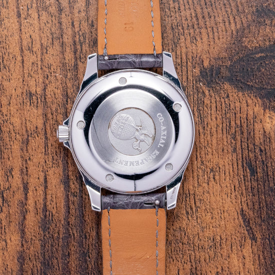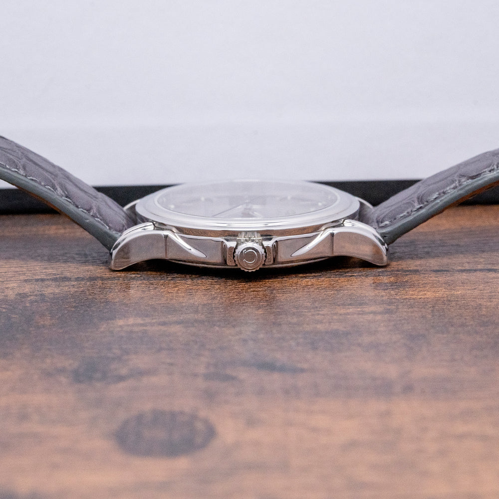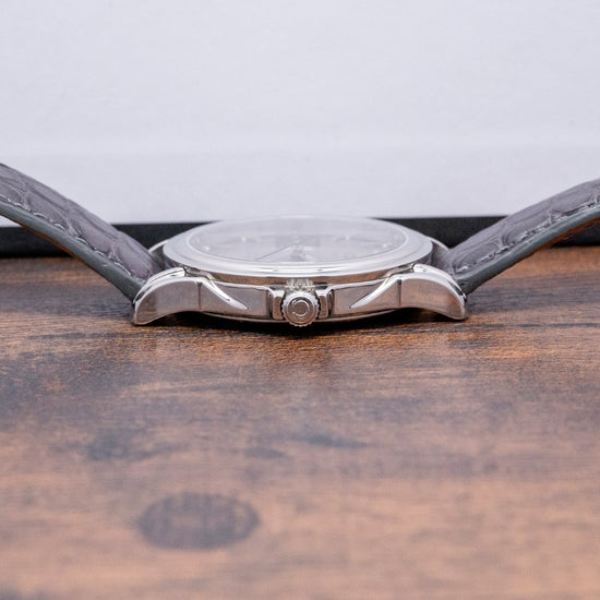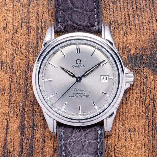 Here we have a 2002 Omega De Ville Chronometer 4831.40.31 with a 37.5mm stainless steel case that curves over your wrist thanks to the attractive thick tapered lugs, and a lug-to-lug length of 46mm and a case thickness of 9.5mm ensuring a comfortable fit. In 1967 Omega launched the De Ville as a stand-alone line, a much more streamlined, varied, and younger feel, it soon became Omega’s best-selling collection. On the right is a signed crown with deep knurling, protected by crown guards that are part of the case for strength, the stepped smooth bezel holds a domed sapphire crystal above a grey dial, and an outer minute chapter ring with lume plots surrounds applied steel bevel-edged baton indexes marking the hours, at 3 o’clock a date window, elegant Alpha style hands infilled with lume are complemented by a blue tapered sweeping second hand. At 12 o’clock we have the applied Omega motif and “De Ville Automatic Chronometer” printed at 6 o’clock completing this versatile timepiece. On the reverse a screw-down solid case back engraved with Co-Axial Escapement and the first Omega motif with the Greek God Chronos pointing at Omega with his lance, he is known as the father of time and was first used by Omega in 1895. Inside an Automatic Omega Cal. 2500, 27 jewels, beating at 25,200 beats per hour, Chronometer Certified, this quality movement introduced in 1999 is Omega’s modified version of the ETA 2892-A2, the Co-Axial Escapement is for excellent stability and durability. The watch comes paired with a 19mm aftermarket grey leather strap and original buckle.