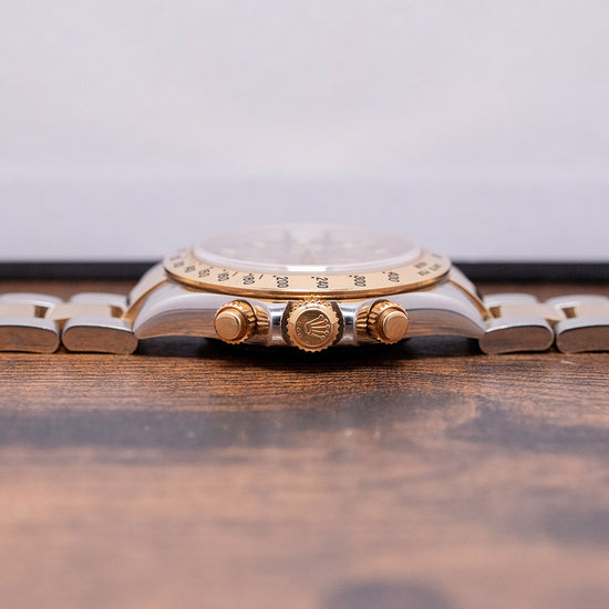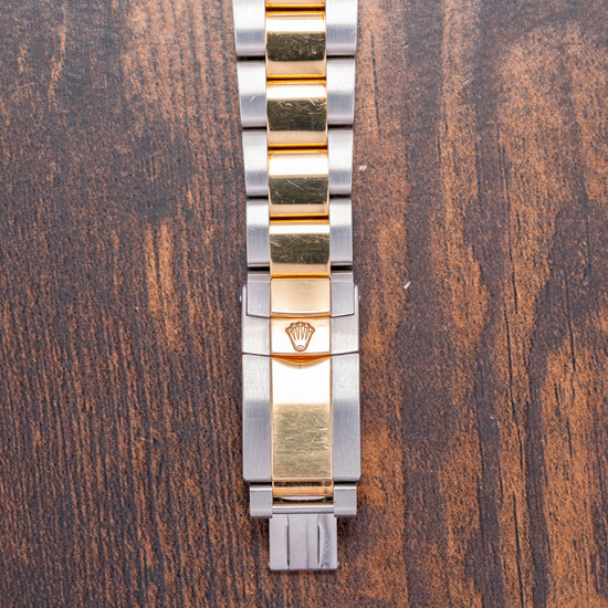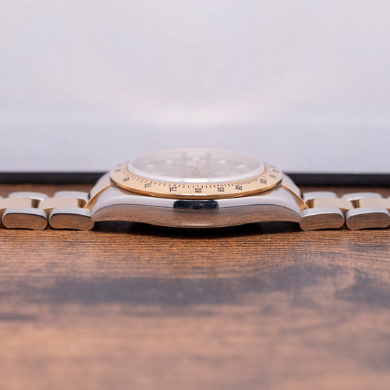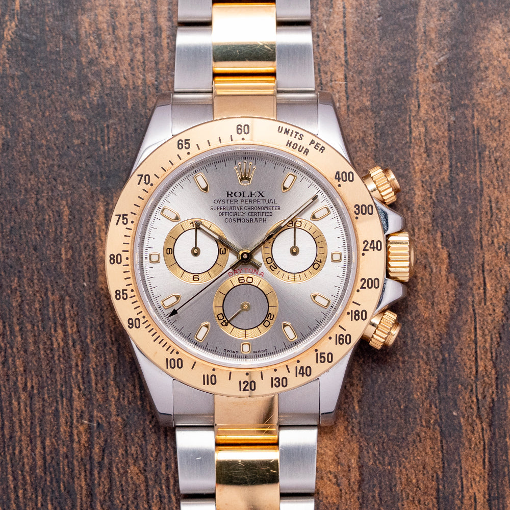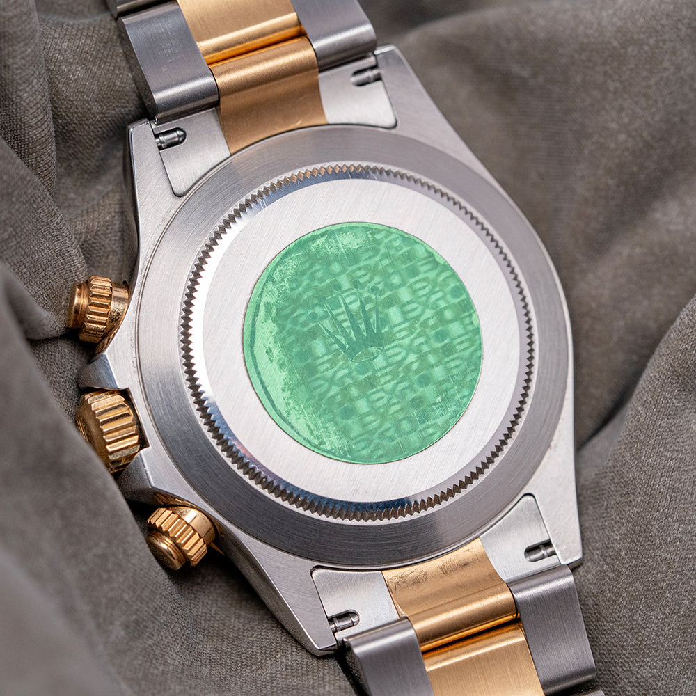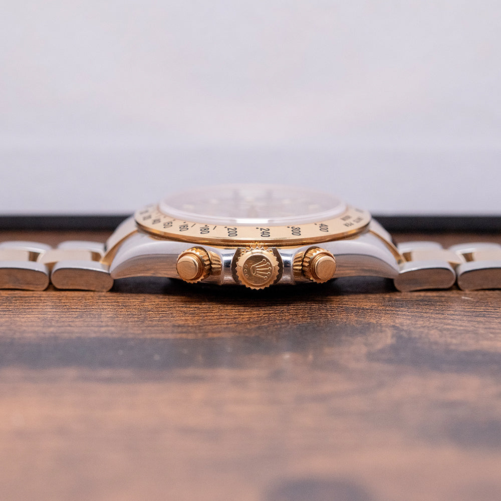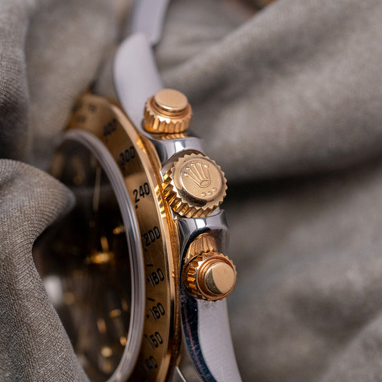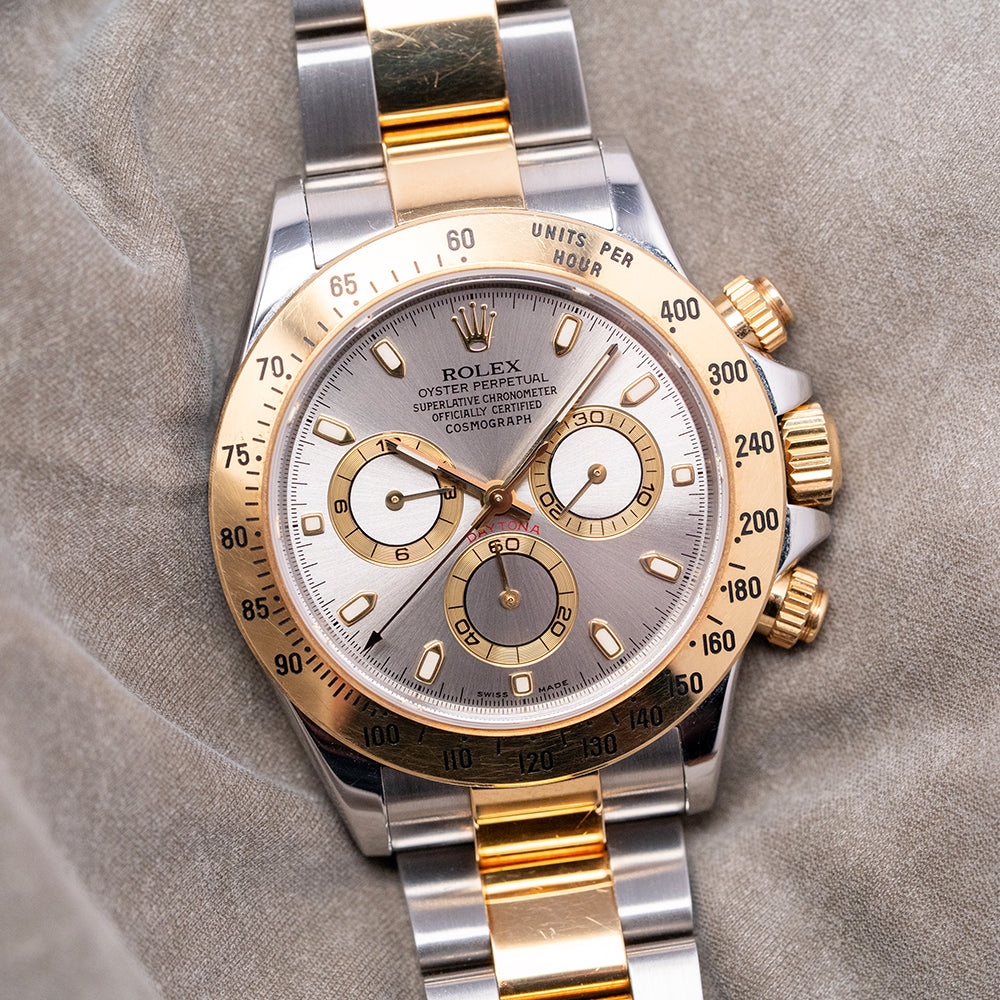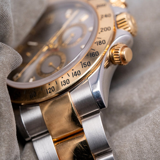 Here we have a classic 2002 Rolex Daytona Steel & Gold 'Slate' Dial 116523, featuring an unpolished 40mm stainless steel and 18ct yellow gold Oyster asymmetric case that curves over your wrist, with thick, tapered, flat-ended lugs. Its curved steel flanks lead to a lug-to-lug length of 46mm and a case thickness of 12mm, giving the watch an impressive wrist presence. On the right side, we have the characteristic 18ct yellow gold screw-down pushers, and the centre-signed screw-down 18ct yellow gold crown is protected by crown guards. The fixed 18ct yellow gold bezel features a black-filled engraved Tachymeter scale and holds a domed sapphire crystal above a stunning slate grey dial. An outer minute track precisely executed surrounds applied 18ct yellow gold indexes filled with lume, marking the hours. The three 18ct yellow gold registers consist of a 30-minute register, a running seconds register, and a 12-hour register. 18ct yellow gold hands tipped with lume are complemented by an arrow-point chronograph hand. At noon, we have the applied Rolex Crown and printed underneath, ‘Rolex Oyster Perpetual Superlative Chronometer Officially Certified Cosmograph’ and below the hands, a red ‘Daytona’ completes the perfectly balanced chronograph, which is expertly put together with all the refinement and craftsmanship you come to expect from Rolex. On the reverse, a coin-edged screw-down case back, inside an automatic Rolex Cal. 4130, 44 jewels, 28,800 beats per hour, Chronometer Certified, released in 2000, it replaced the iconic Zenith El Primero, and this in-house movement has a bi-directional rotor for excellent efficiency and accuracy, Parachrom Blue hairspring, Paraflex shock system and ceramic ball bearings are the first to be used in an automatic anywhere. The watch comes paired with its 20mm steel and 18ct yellow gold 3-link Rolex Oyster bracelet, secured by a Rolex folding Oysterlock safety clasp. All links are included, along with an additional 20mm blue-fitted Everest rubber strap. This watch is sold with an original Rolex box set and Rolex paperwork, with the reference sticker still present on the outer box.