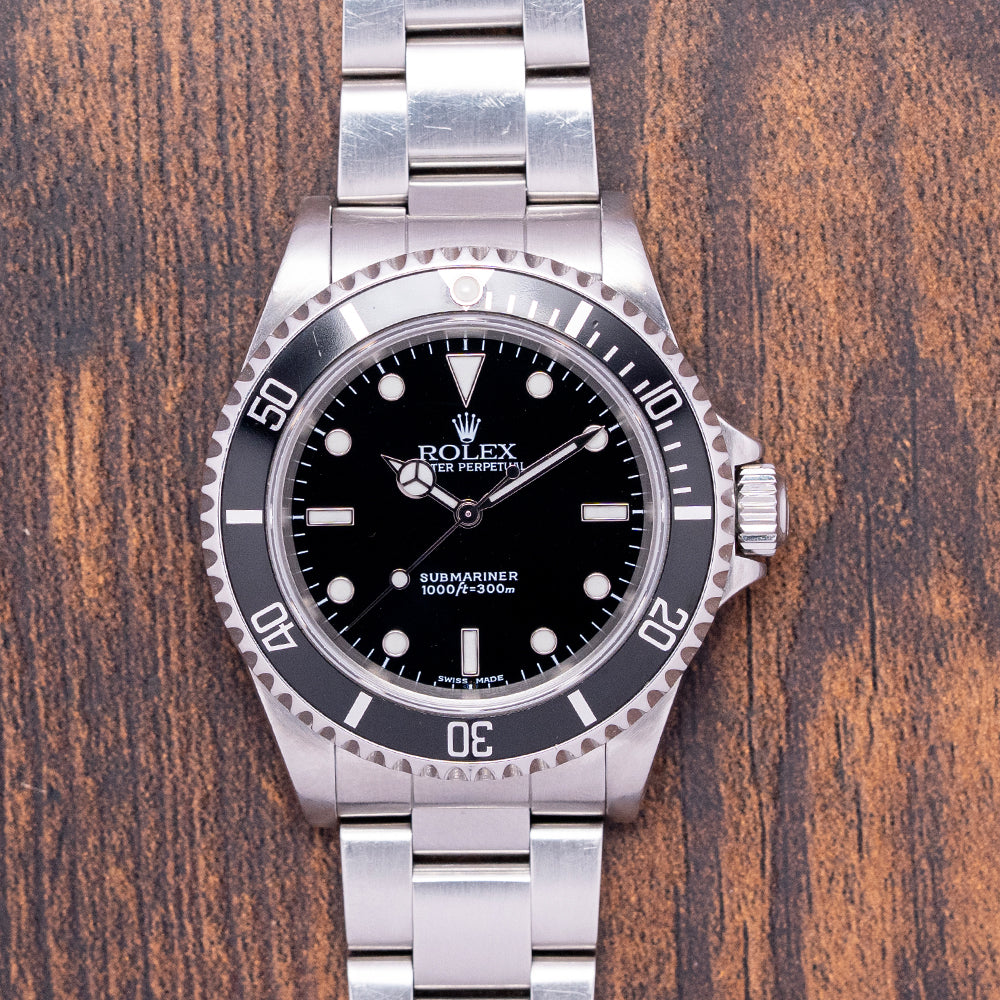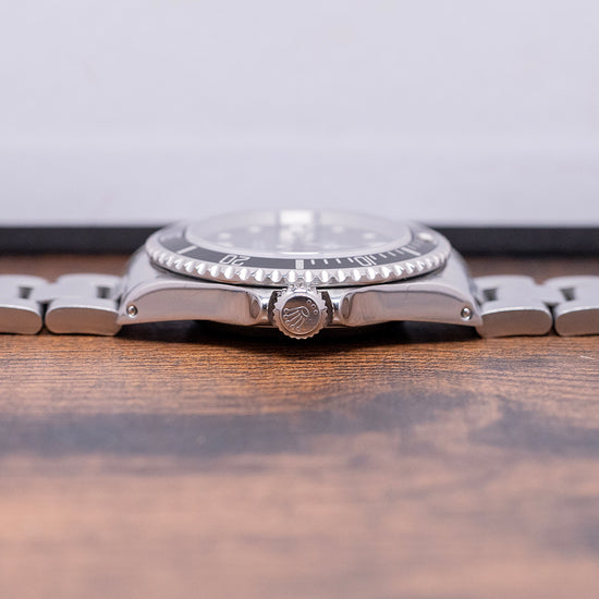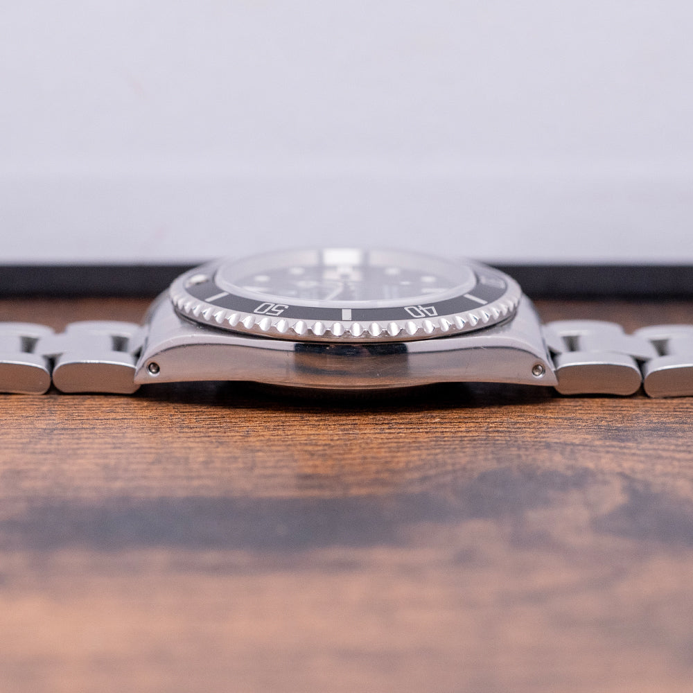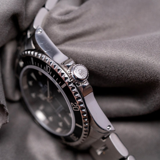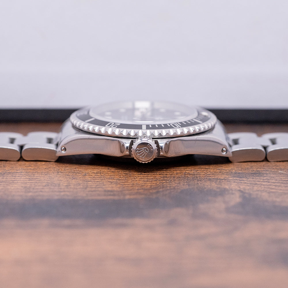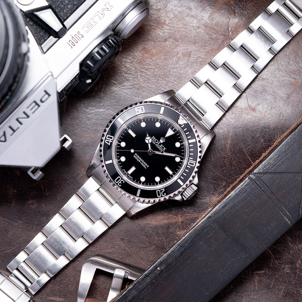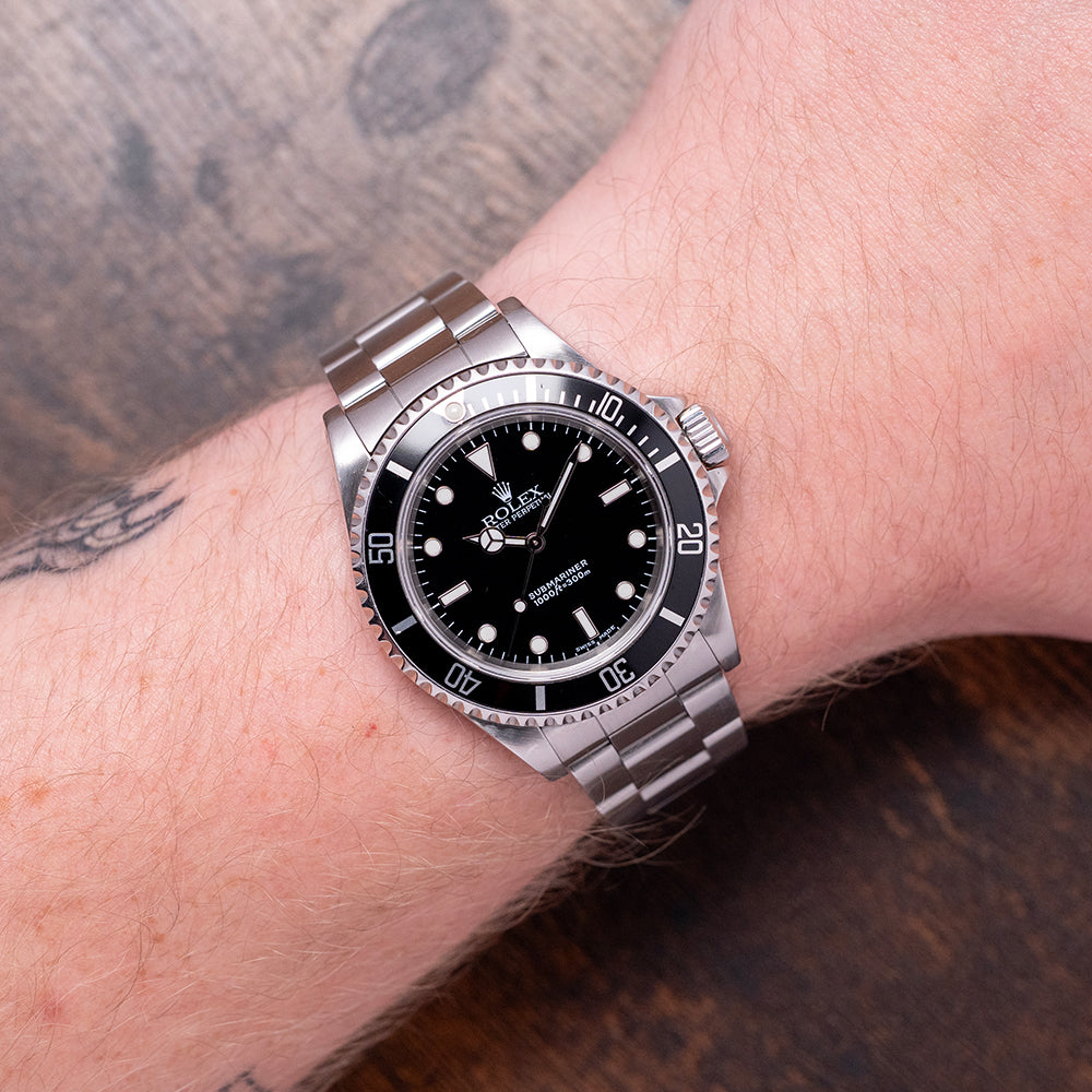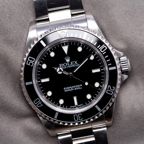 Here, we have a 2002 Rolex Submariner No-Date "2 Liner" 14060M, launched in 1999, the “M” stands for “Modified” and refers to the revised movement by Rolex. The curvaceous 40mm stainless steel Oyster case curves over your wrist with drilled tapered lugs, polished and brushed surfaces transition with a crisp edge, a lug-to-lug length of 47mm, and a case thickness of 12mm, giving the watch an impressive wrist presence. On the right side is a signed Rolex screw-down crown. The crown guards are part of the case, which gives it strength. The unidirectional black aluminium divers bezel holds a sapphire crystal above a black dial, applied white-gold disc and baton indexes are infilled with SuperLumiNova, marking the hours. The Mercedes's hands are complemented by a lollipop counterbalanced sweeping second-hand infilled with SuperLumiNova; at noon, a Rolex coronet ‘ROLEX Oyster Perpetual’. At 6 o’clock we have the “2 lines” “Submariner” 1000ft=300m. On the reverse, a coin-edged screw-down case back. Inside an automatic Rolex Cal. 3130, 31 jewels, 28,800 beats per hour with hacking and hand winding for your convenience. It comes paired with its original full 20mm stainless steel Rolex Oyster bracelet secured by a signed folding clasp and flip-lock, and the watch comes with a Rolex presentation box.