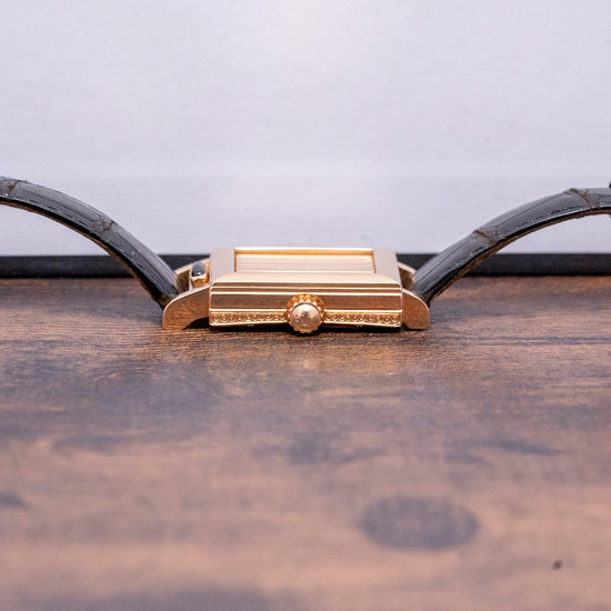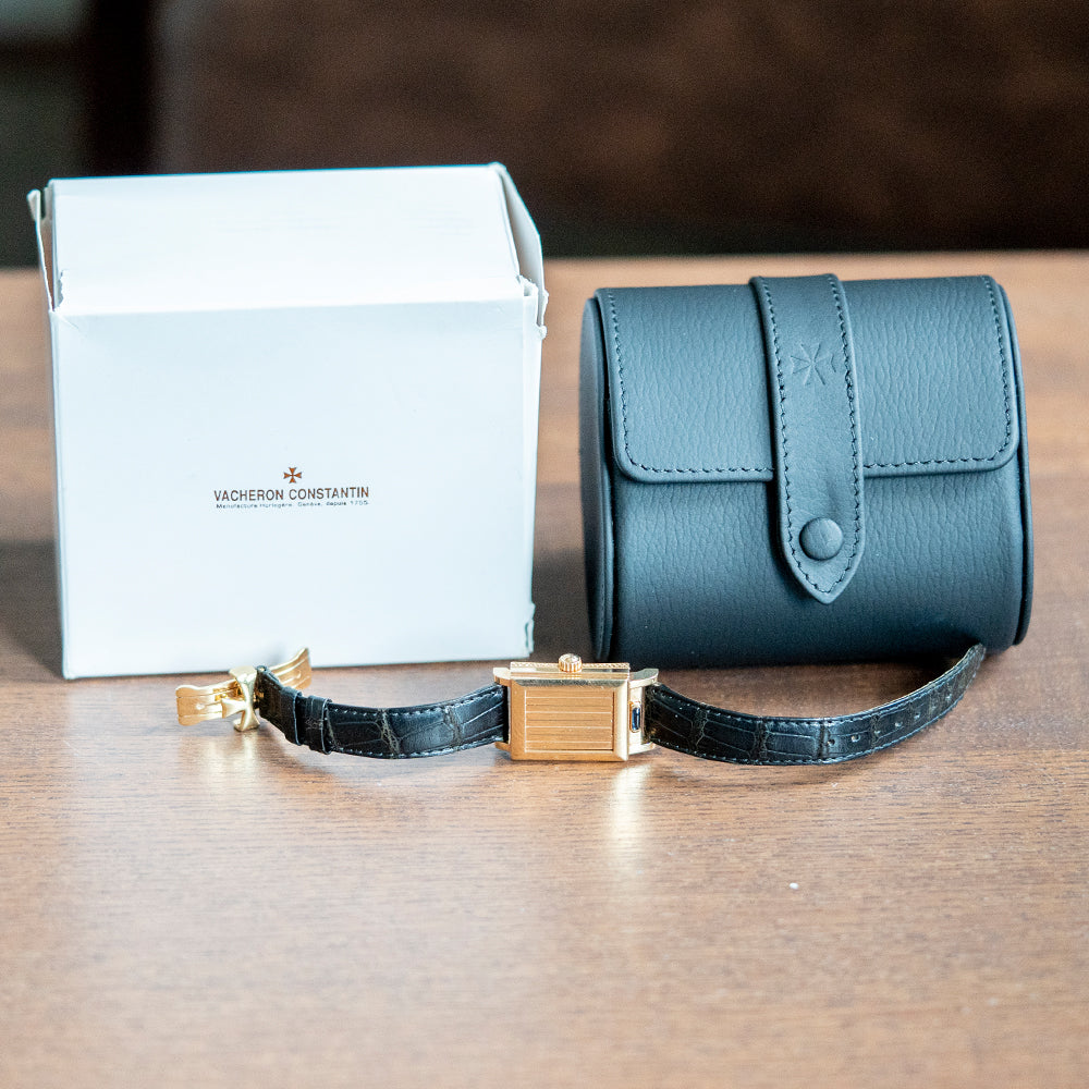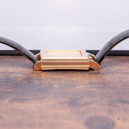 Here we have a rarely seen and unusual 2002 Vacheron Constantin Historiques Jalousie Shutter-Dial. Jalousie simply means “jealousy”; it is playful and teasing in its execution and is also French for Blind or Louvre window. Based on a 1930s case made by Parisian jeweller Verger Frères, with whom Vacheron Constantin worked with for many years, it is a clever variation of concealment and protection similar in function to that found on the iconic Jaeger-LeCoultre Reverso. A distinctive 22.5mm “Tank shaped” 18ct Pink/Rose Gold case with slender straight lugs leads to a lug-to-lug length of 36.5mm and a case thickness of just 7mm, ensuring a comfortable fit and a classic profile. On the right side, an 18ct Pink Gold crown signed with the Maltese cross. The lower part of the case is intricately hand engraved in a repeating Art Deco “S” shaped curved pattern; the top part of the case is smooth. A domed bezel holds the slim vertical blinds to hide the beautiful dial. To open the blinds, you slide the blue cabochon under the dial to the right to reveal a sapphire crystal above a stunning white enamel dial; applied Pink Gold stick indexes mark the hours, slender thermally blued leaf hands sit above a precisely executed, sub-seconds at 6 o’clock and at noon we have the Vacheron Constantin motif completing this beautifully crafted Art Deco inspired dress watch. On the reverse 18ct Pink Gold screwed-down case back, stamped with its relevant hallmarks, inside a manually wound Vacheron Cal. 1055, 21 jewels, beating at a leisurely 18,000 beats per hour, at just 2.1mm thick, this remains one of the world's thinnest movements. The watch comes paired with a VC 15mm leather strap and an 18ct Pink/Rose Gold clasp, stamped with its relevant hallmarks and comes in a VC service box.