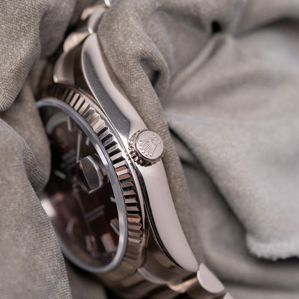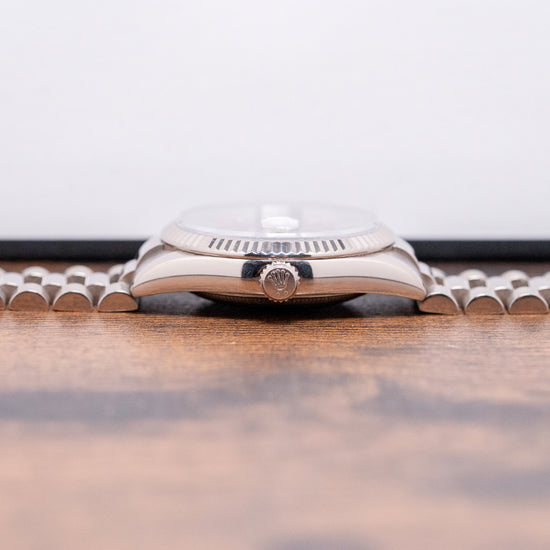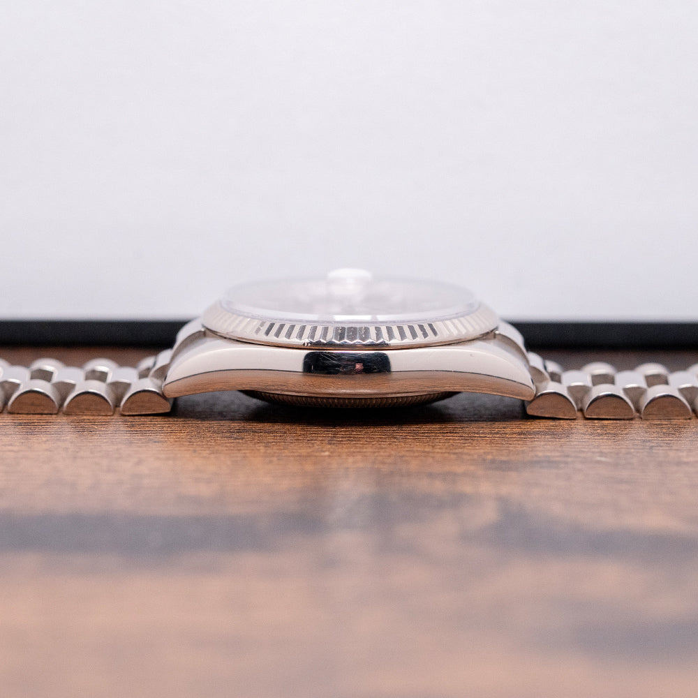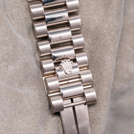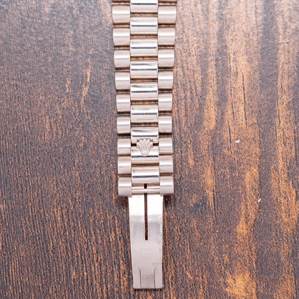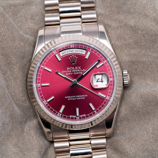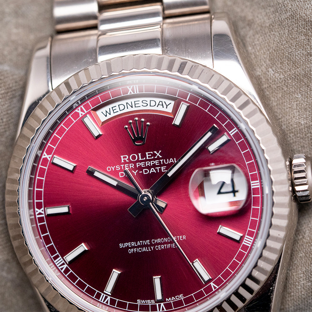 Here we have the rare curvaceous 2003 Rolex Day-Date 118239 Cherry Red Dial featuring a 36mm 18ct White Gold Oyster case that gently curves over your wrist with fine tapered lugs. Its curved flanks lead to a comfortable lug-to-lug length of 43mm and a case thickness of 12mm. On the right side, a signed coin-edged screw-down crown. An attractive fluted bezel holds a domed sapphire crystal above a stunning sunburst Cherry Red dial. An outer minute railroad features Roman numeral hour markers above applied baton indexes filled with lume. At 12 o’clock, we have the Day crescent and at 3 o’clock, a date window with Cyclops magnification. Baton hands filled with lume are complemented by a tapered sweeping second hand. At noon, the Rolex Oyster Perpetual Day-Date and at 6 o’clock, Superlative Chronometer Officially Certified completes this distinctive timepiece. On the reverse, a screw-down, solid coin-edged case back, inside an automatic Rolex Cal. 3155, 31 jewels, 28,800 beats per hour. This COSC Chronometer Certified movement was first introduced in 1988. The watch comes paired with its original 20mm 18ct White Gold President bracelet with a concealed clasp. This watch is sold with its original set, including Rolex presentation boxes, Rolex wallet, original Rolex paperwork, and swing tags.