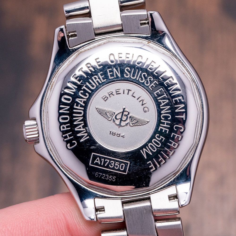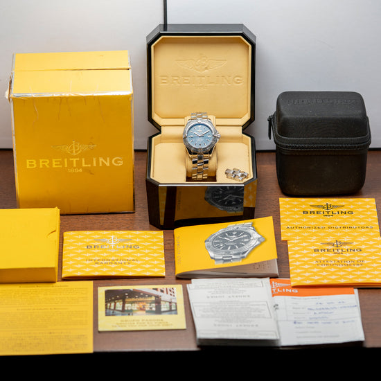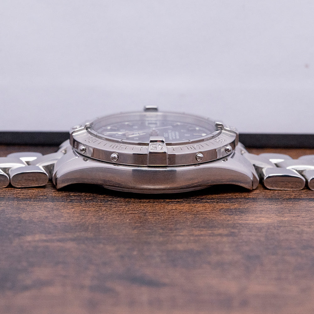 With a 38mm polished stainless steel case that gently curves towards tapered lugs, a lug-to-lug length of 43.5mm and a thickness of 12mm ensure an impressive, comfortable fit on the wrist. On the right side, a crown guard protects the screw-down signed crown. A unidirectional 60-minute bezel has domed screws around its edge to give you some surface to grip. Deep engraving and raised 15, 30, and 45-minute sections make this undoubtedly a Breitling Colt. Its flat, scratch-resistant sapphire crystal AR coating is recessed, adding some protection against knocks. Its blue matte dial has an interesting concentric circular pattern. An outer minute track surrounds applied polished baton indexes tipped with lume above the Arabic 24-hour numeral in white, adding a nice contrast to the dial. At 3 o’clock, a framed date window. Broad sword hands and a sweeping tapered seconds hand with its square counterweight are filled in luminescence. At 12 o’clock, we have the Breitling winged motif, and at 6 o’clock, “Colt Chronometre Automatic 500m/1650ft” completes this dynamic sports dive watch. On the reverse, a screw-down case back with the high-relief Breitling logo in the centre and the details of the watch engraved around its edge. Inside an automatic Breitling Movement Cal.17 based on the ETA 2824-2, 26 jewels, beating at 28,800 beats per hour. It comes paired with its Breitling 18mm 3-link polished and brushed stainless steel bracelet secured by a signed folding clasp and flip lock, and the watch comes with its Breitling presentation box and paperwork.