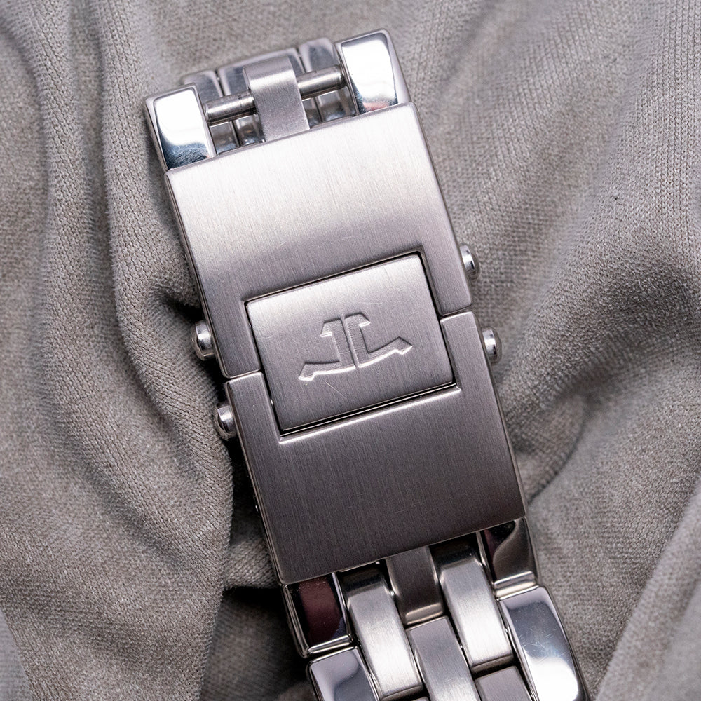 Here we have a 2004 Jaeger-LeCoultre Master Compressor Memovox 146.8.97 featuring a polished 41mm stainless steel case that gently curves over your wrist with tapered lugs. Its curvaceous, polished flanks lead to a lug-to-lug length of 49.5mm and a case thickness of 15mm, giving the watch an impressive wrist presence. Down the right side, we have a locking signed crown at two o’clock to wind, set the alarm, stop the alarm and adjust the date; at four o’clock, a locking signed crown to wind the watch and set the hour and minute hand; at 10 o’clock, we have the crown to adjust the inner 60-minute dive bezel. A smooth brushed bezel holds a sapphire crystal above a matte black dial. An inner rotating 60-minute bezel has Arabic numerals, and the first 15 minutes are highlighted in red, with Arabic 12, 6, and 9 numerals alongside spear-shaped indexes marking the hours; at 3 o’clock, there is a framed date window, an alarm crescent sits on the left side with a red arrow tipped hand, slender baton hands are filled with lume and complemented by a red arrow tipped second hand, off centre sits the Jaeger-LeCoultre motif and “Memovox Automatique” complete this versatile alarm timepiece. On the reverse, a screwed-down solid case back with the details of the watch around its edge and the gold JLC Master Compressor medallion in the centre, inside an automatic Alarm JLC Cal. 918, 27 jewels, beating at 28,800 beats per hour, introduced in 1994, it has a double barrel, one for the alarm and one for the time, made up of 260 components. It is paired with its original JLC 21mm brushed and polished multi-link stainless steel bracelet secured by a push-button deployant clasp. This watch is sold with its original JLC box and paperwork.