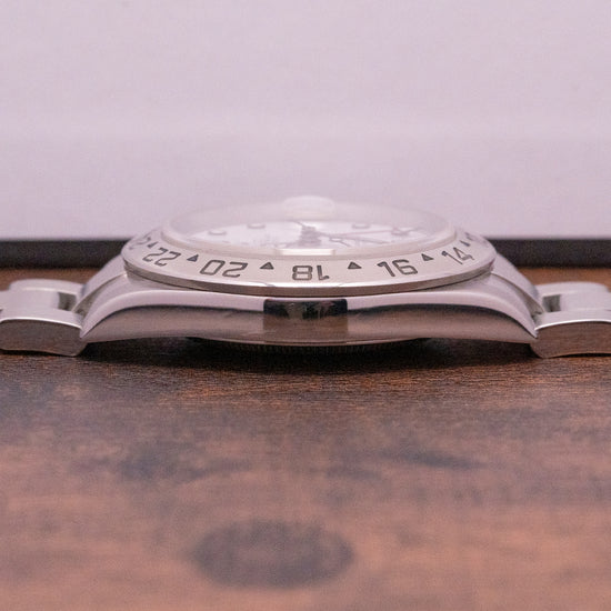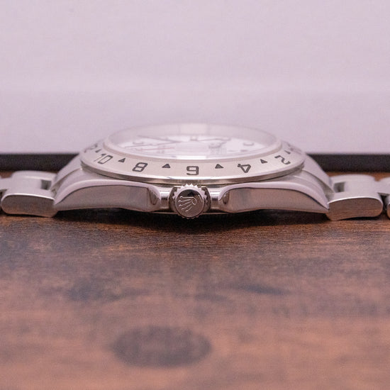 Here we have a 2004 Rolex Explorer II "Polar" White 16570 SEL Full Set. The Explorer II was specifically made for Spelunkers who are cave explorers, this meant it was built with a particular specification and ultra-durability. The reference 16570 was introduced in 1989, it has a 40mm stainless steel case with polished flanks and brushed top surfaces that are exquisitely executed, and a lug-to-lug length of 47mm and a case thickness of 12mm giving the watch an impressive wrist presence. The TwinLock screw-down crown has been crafted at Rolex and consists of a two-gasket seal system; a stepped fixed bezel has 24-hour black markings. Sapphire crystal protects the striking Polar White dial, an outer minute track and applied disc, batons, and triangle at 12 o’clock with contrasting black outlines marking the hours, all lumed in SuperLumiNova. At 3 o’clock a date window with cyclops magnification on the crystal, the Mercedes’s hands are complimented with the lollipop sweeping second hand and an arrow hand for the 24-hour function made more visible with its red hand and white arrowhead. On the reverse, we have the screw-down case back, inside the movement is protected from vibration and knocks by the ParaFlex shock absorber. The Automatic Rolex Cal. 3186 features 31 jewels and beats at 28,800 beats per hour, the movement is fitted with a Parachrom hairspring, which offers greater resistance to shocks and to variations in temperature. The watch comes paired with its original brushed solid end-link 20mm Rolex Oyster stainless steel bracelet with a signed Rolex clasp and flip lock, all links are provided and comes with its Rolex presentation box, swing tag, bezel protector and Rolex paperwork, including a 2015 RSC.