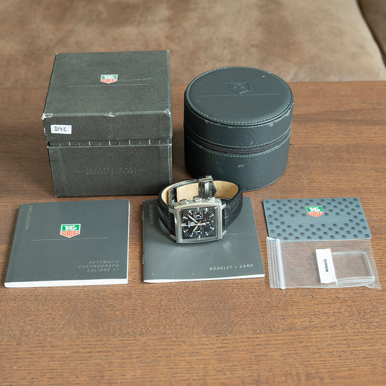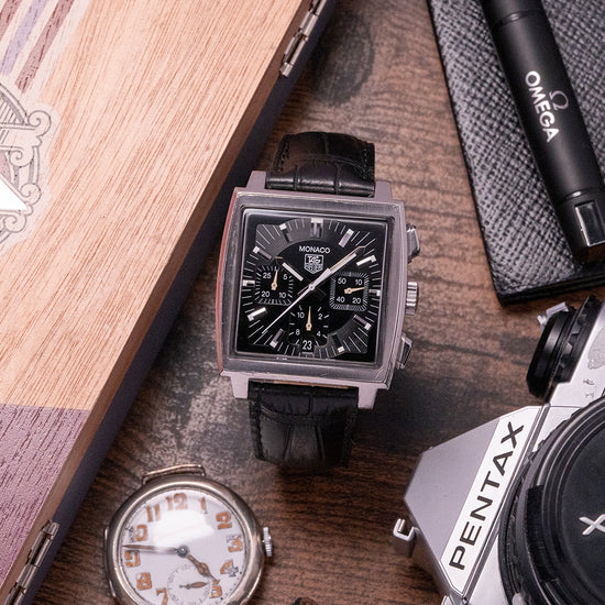 Monaco was made famous by Steve McQueen in the film Le Mans in 1971, since then, this has been an absolute icon and rightly so! Love or hate TAG; respect for Monaco is universal within the watch world! Here we have a 2004 TAG Heuer Monaco Black automatic CW2110-0 with a 38mm polished and brushed square stainless steel case, stubby lugs with a lug-to-lug length of 46mm and a case thickness of 13mm ensure a comfortable fit on your wrist. Down the right side, we have sloped chronograph pushers and a signed crown in the centre. The bevel-edged flat hesalite crystal sits above the black dial. An outer minute track with large polished applied steel indexes marks the hours, at 3 o'clock a recessed square sub-seconds register, at 6 o’clock, a recessed square 12-hour register, including the date window, and finally at 9 o’clock a recessed square 30-minute register. Polished steel sword hands have luminescence infill, at 12 o’clock we the “Monaco” and TAG Heuer motif. On the reverse, a screwed-down case back with deep engraving, inside an automatic TAG Heuer Cal. 17 movement (based on the ETA 2894-2), 37 jewels, beating at 28,800 beats per hour. The watch comes fitted on a TAG Heuer 22mm leather strap with a deployment buckle, the watch also comes with its TAG Heuer presentation box and paperwork.