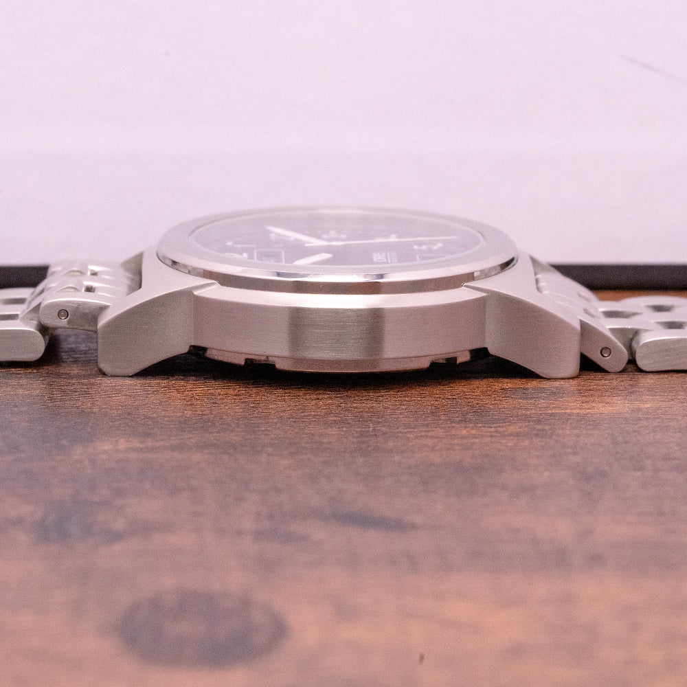 Here we have a 2005 Oris Big Crown Automatic Day Date Ref. 7500 with a curvaceous 40mm brushed stainless steel case that curves over your wrist with thick angled lugs, and a lug-to-lug length of 48.5mm and a case thickness of 10mm ensures a comfortable fit. On the right side is the large signed crown that sits slightly recessed into the case, a polished and brushed smooth bevelled-edged bezel holds a flat crystal above a matte black dial. An outer minute chapter ring is precisely executed with small Arabic numerals and lume pips, large Deco numerals are printed in white marking the hours, under the 12 we have a framed day window, and at 6 o’clock a framed date window. Slender white baton hands are complemented by a white tapered sweeping second hand, at 6 o’clock we have the Oris motif, “Automatic” curves on the left and “25 Jewels” curves on the right completing this vintage-inspired timepiece. On the reverse a screw-down exhibition case back, inside an automatic Oris Cal 635, 25 jewels, with the characteristic red rotor. The watch comes paired with an Oris 20mm stainless steel bracelet with a signed deployment clasp.