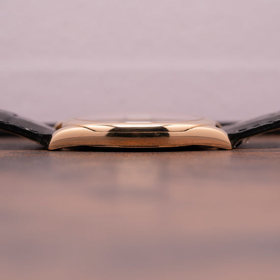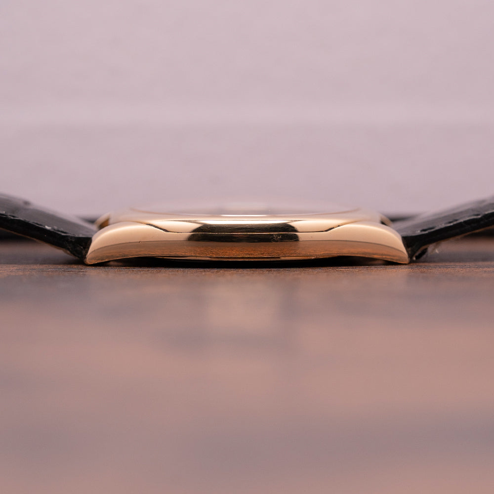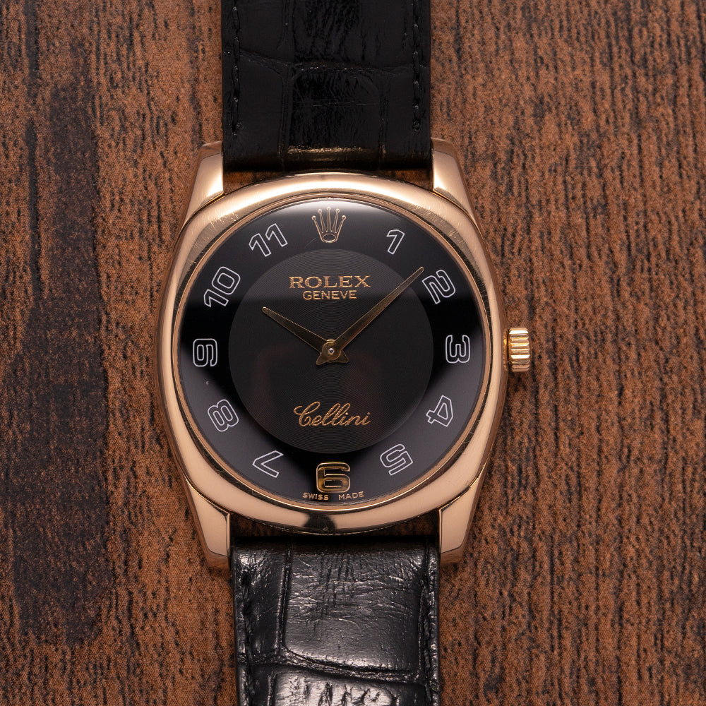Here we have a 2005 Rolex Cellini Danaos Manual with an 18ct Yellow Gold cushion case that curves over your wrist with thick tapered lugs. The Cellini range is named after the Italian goldsmith and sculptor, Benvenuto Cellini and is inspired by their dress watches of the 1950s. A lug-to-lug length of 40mm and a case thickness of just 7mm provide a slim profile that ensures a comfortable fit on your wrist, and on the right side is a signed crown. A sapphire crystal sits above a black dial featuring concentric circles like a vinyl record, at 12 o’clock we have the 18ct Yellow Gold Rolex motif followed by large white outlined Arabic numerals with an 18ct Yellow gold 6 marking the hours, underneath the crown, you find “Rolex Geneve” and at 6 o’clock “Cellini” in yellow gold text. Elegant 18ct Yellow Gold Dauphine hands complete this beautiful sophisticated minimalist two-handed dress watch. On the reverse an 18ct Yellow Gold case back with the relevant Hallmarks stamped on the inside, inside a manually wound Rolex Cal. 1602, 20 jewels, beating at 21,600 beats per hour. The watch comes paired with a 19mm leather strap with a Rolex 18ct Yellow Gold buckle, relevant Hallmarks stamped on its inside, plus the original Rolex 19mm leather strap in the box, and the watch comes with its Rolex presentation box, swing tag and paperwork.