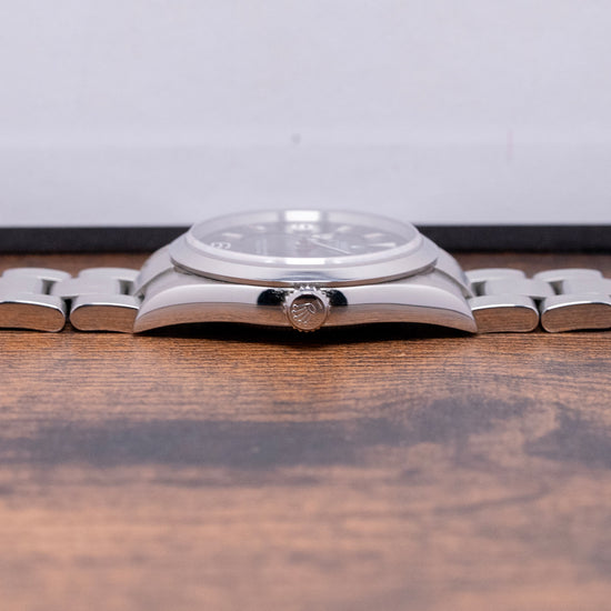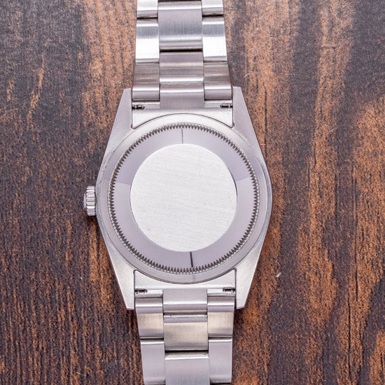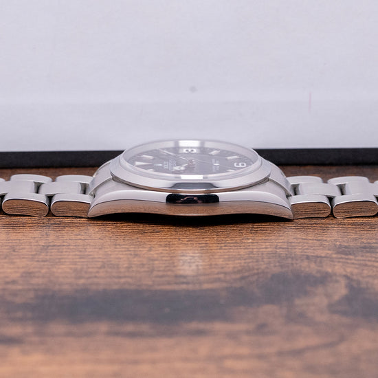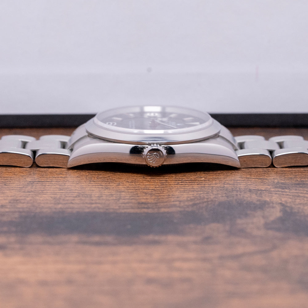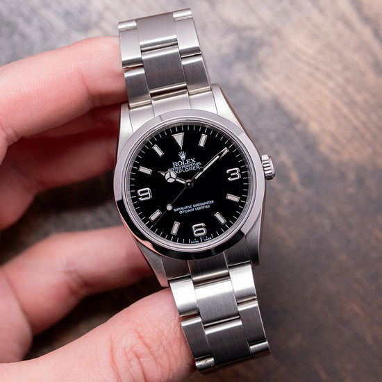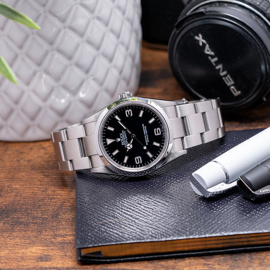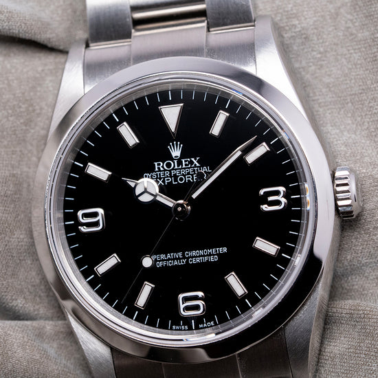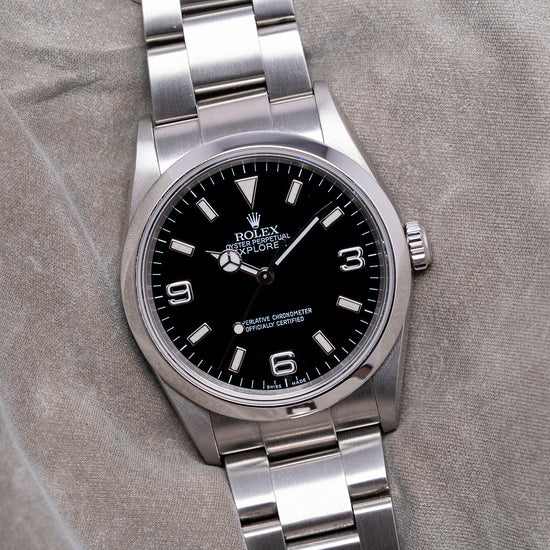 The Rolex Explorer was first introduced in 1953, shortly after the first successful summit of Everest by Sir Edmund Hillary. The Rolex Oyster Perpetual Chronometers used by the expedition were the forerunners of the explorer, albeit without the name. In 1989, the reference 1016 was discontinued after 26 years of production. To replace it, the reference 14270 brought with it modern upgrades, such as acrylic crystal to sapphire crystal and a newer movement, the automatic Cal. 3000. During the 90s, Rolex switched from tritium to Luminova and from 2001 to Super-LumiNova. Later in 2001, they introduced the reference 114270, which had the updated automatic cal. 3130 and a minor thickness increase from 11.5mm to 12.0mm. Here we have a 2005 Rolex Explorer I 36mm on SEL Bracelet 114270 featuring a 36mm stainless steel Oyster case that curves over your wrist with tapered lugs, a lug-to-lug length of 43.5mm, giving the watch an excellent wrist presence. This is the last version to have a 36mm case due to Rolex introducing the reference 214270 at Baselworld, increasing its size to 39mm in 2010. Until recently, Rolex has reintroduced the iconic 36mm size. Its polished and brushed surfaces transition perfectly towards tapering lugs. On the right is a large screw-down crown, its polished smooth bezel holds a flat sapphire crystal. The glossy black dial has applied white gold-framed Arabic numerals at 3, 6, and 9, with white gold-framed baton indexes infilled in Super-Luminova marking the hours. Elegant Mercedes’s hands are also Super-LumiNova infilled. At 12 o’clock we have the Rolex motif “Rolex Oyster Perpetual Explorer” and at 6 o’clock “Superlative Chronometer Officially Certified”. On the reverse, a coin-edged screw-in case back, inside an automatic Rolex Cal. 3130, 31 jewels, 28,800 beats per hour, COSC Chronometer Certified movement. The watch comes fitted on its 20mm Rolex stainless steel Oyster bracelet with a signed fliplock clasp and solid end links, polished sides and brushed links give the watch a quality finish. This watch is sold with a later Rolex presentation box.