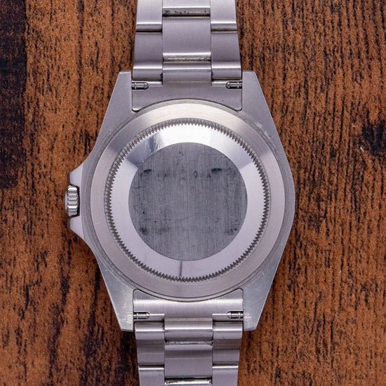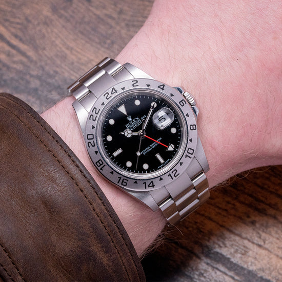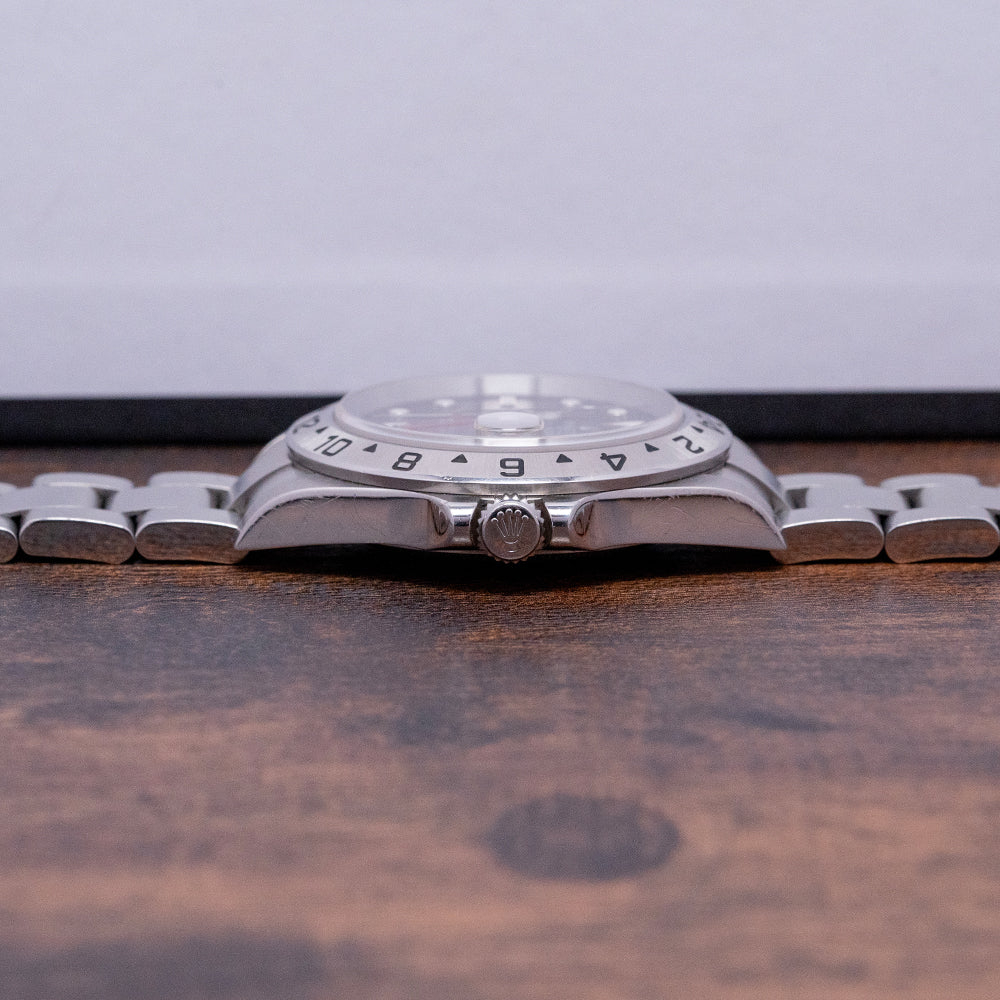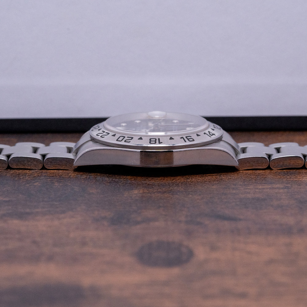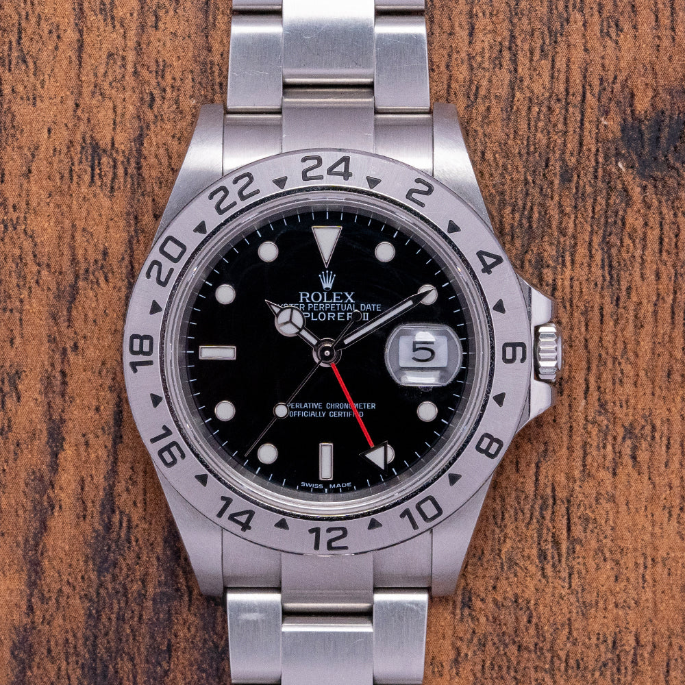 Here we have a 2006/07 Rolex Explorer II Black Dial 16570 on a Bracelet. The Explorer II was specifically made for Spelunkers who are cave explorers, this meant it was built with a particular specification and ultra-durability. The reference 16570 was introduced in 1989, it has a 40mm stainless steel case with well-defined crisp polished flanks and brushed top surfaces that are exquisitely executed, and a lug-to-lug length of 47mm and a case thickness of 11.5mm giving the watch a impressive wrist presence. The TwinLock screw-down crown has been crafted at Rolex and consists of a two-gasket seal system; a stepped fixed bezel has 24-hour black markings. Sapphire crystal protects the black dial, and an outer minute track surrounds the applied disc, batons, and triangle at 12 o’clock with contrasting White Gold outlines marking the hours, all lumed in SuperLumiNova. At 3 o’clock a date window with cyclops magnification on the crystal, the Mercedes’s hands are complimented with the lollipop sweeping second hand and an arrow hand for the 24-hour function made more visible with its red hand and white arrowhead. On the reverse, we have the screw-down case back, inside the Automatic Rolex Cal. 3185 features 31 jewels and beats at 28,800 beats per hour, the movement is fitted with a Nivarox hairspring and was in production from 1989 until 2007 when it was replaced by the Cal. 3186. The watch comes paired with its original Rolex 13-link full bracelet, brushed solid end-link 20mm Rolex Oyster bracelet with a signed Rolex clasp and flip lock, all links are provided.