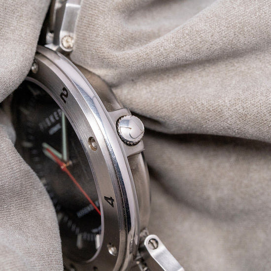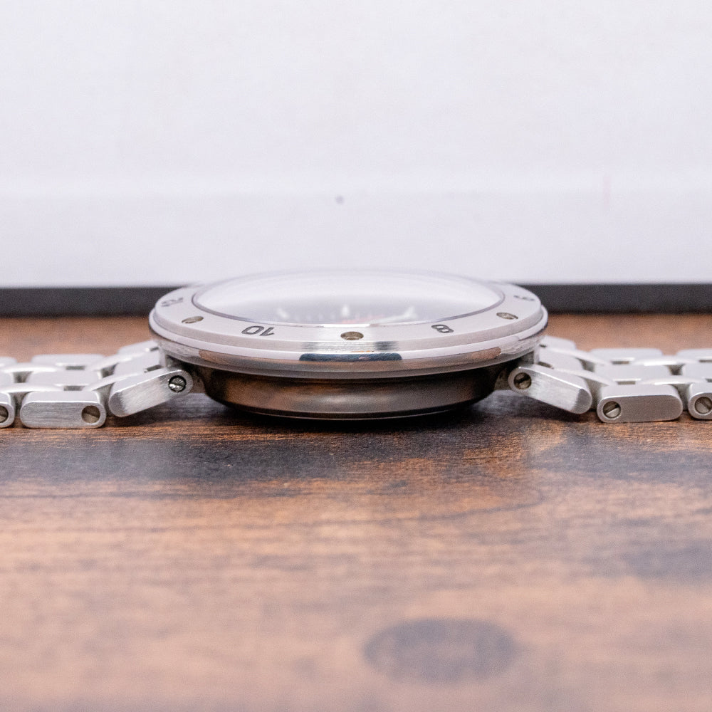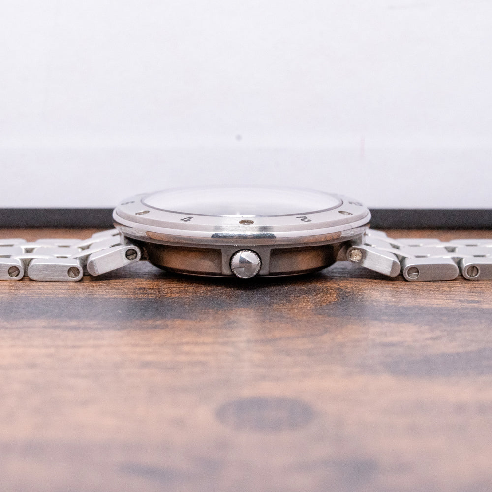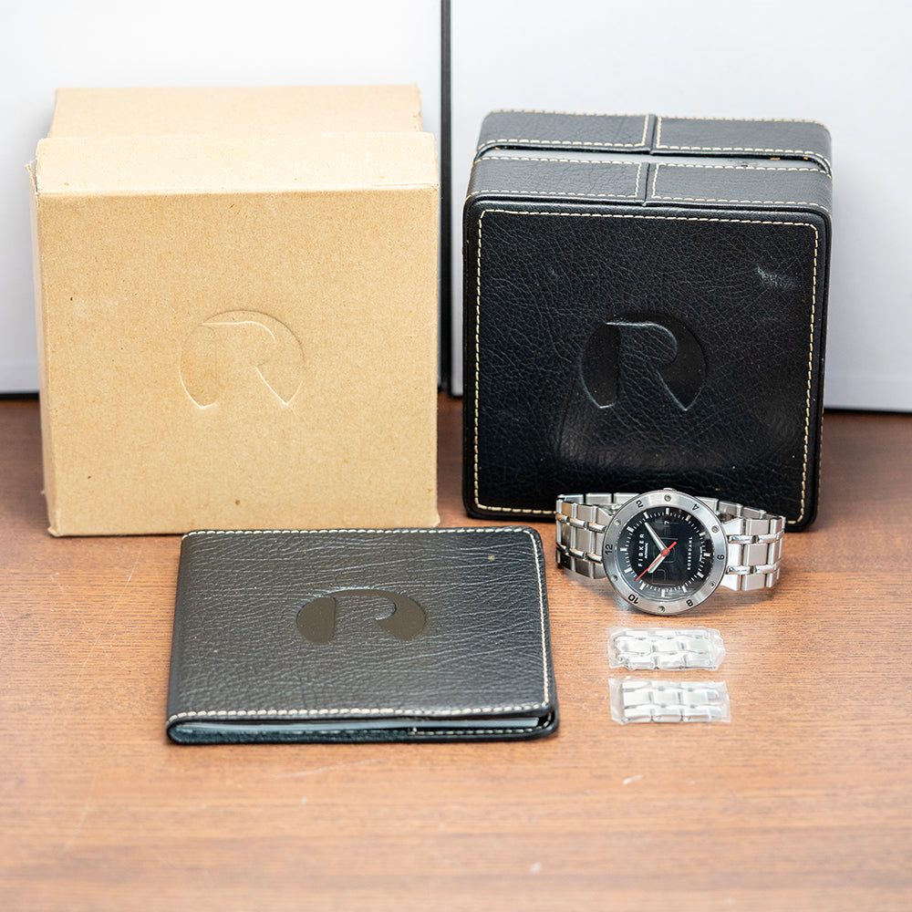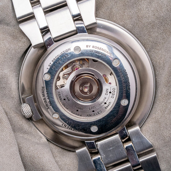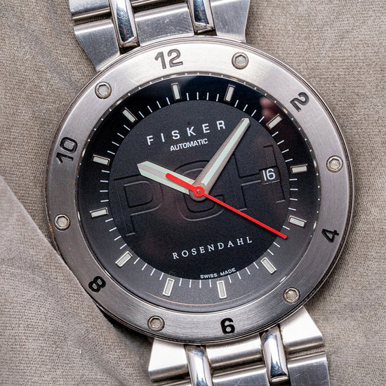 Here we have a rare first production 2006 Henrik Fisker x Rosendahl PCH Automatic, inspired by the iconic Pacific Coast Highway and the Fisker-designed cars that drive along it. This collaboration is with Danish designer Henrik Fisker, well known for creating the classic BMW Z8 and Aston Martin DB9. Its 44mm round stainless steel case sits comfortably on your wrist thanks to the 21mm integrated bracelet with a distinctive taper towards the screwed lugs. Its curvaceous flanks lead to a lug-to-lug length of 44mm and a case thickness of 13mm, giving the watch an impressive presence on the wrist. On the right side, a hobnail-textured, signed crown is recessed into the case for protection. The wide stainless steel bezel features hex screw detailing and engraved 12-hour Arabic numerals filled in black, supporting a domed sapphire crystal that sits above a black dial engraved through the centre with PCH, a nod to the California North-South Pacific Coast Highway, where Fisker resides. A wide chapter ring features baton indexes filled with lume, complemented by a minute track that marks the hours. At 3 o’clock, a colour-matched date window, the thick lumed hour and slender minute hand are complemented by a red tapered sweeping second hand. At noon, we have the Fisker logo, ‘Automatic’ printed in white, and at 6 o’clock, the Rosendahl motif completes this distinctive sports watch. On the reverse, a screw-down exhibition case back, engraved with the details of the watch around its edge, houses an automatic ETA Cal. 2892, 21 jewels, beating at 28,800 beats per hour. Its bidirectional rotor is decorated with the cities along the California north-south Pacific Coast Highway. It comes paired with its full-sized 21mm integrated, brushed and polished stainless steel screw-link bracelet, secured by a concealed butterfly clasp. This watch is sold with its original Henrik Fisker x Rosendahl box, the inner box is flaking and the paperwork.