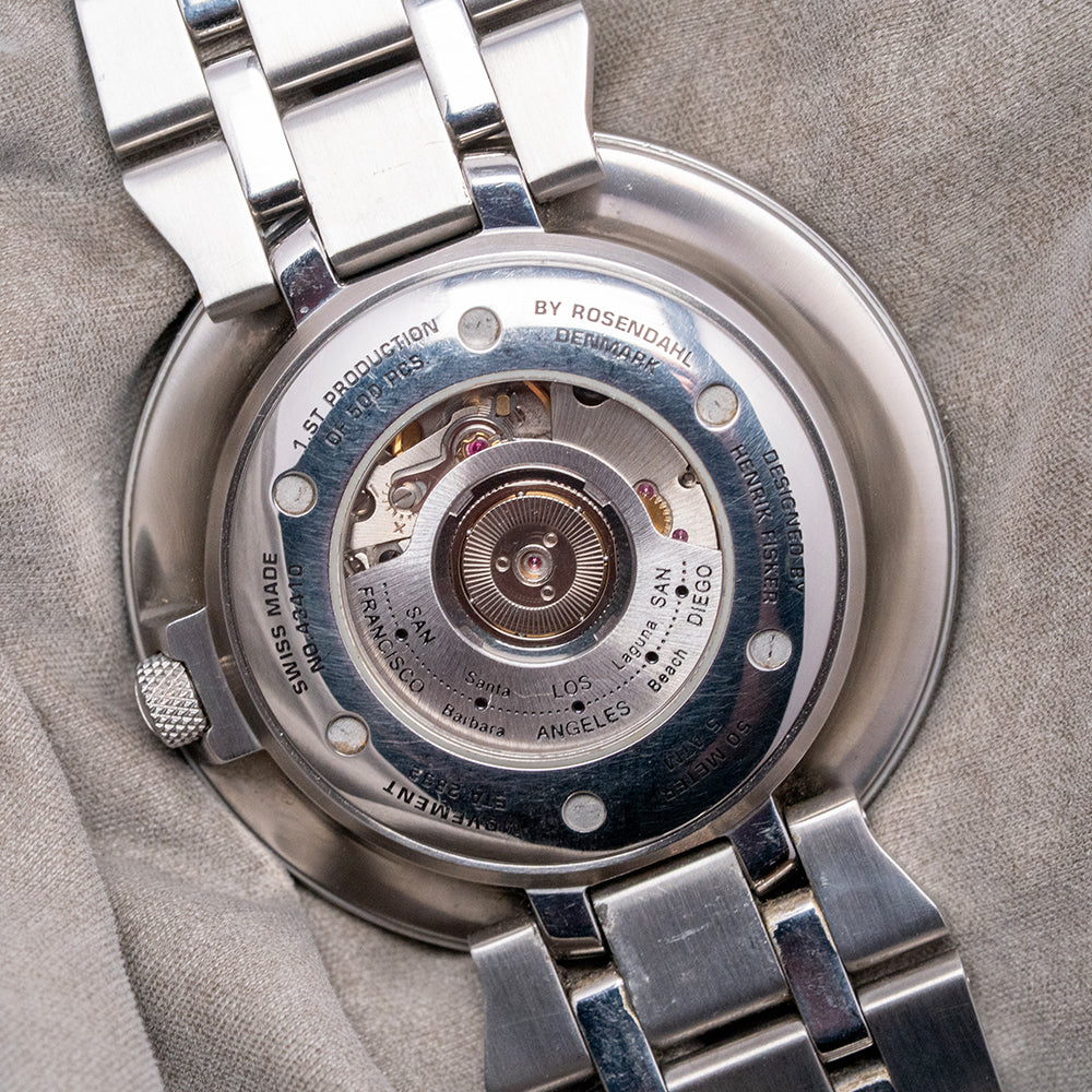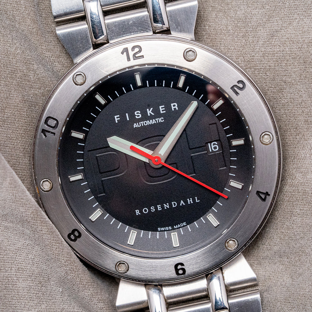 Here we have a rare first production 2006 Henrik Fisker x Rosendahl PCH Automatic, inspired by the iconic Pacific Coast Highway and the Fisker-designed cars that drive along it. This collaboration is with Danish designer Henrik Fisker, well known for creating the classic BMW Z8 and Aston Martin DB9. Its 44mm round stainless steel case sits comfortably on your wrist thanks to the 21mm integrated bracelet with a distinctive taper towards the screwed lugs. Its curvaceous flanks lead to a lug-to-lug length of 44mm and a case thickness of 13mm, giving the watch an impressive presence on the wrist. On the right side, a hobnail-textured, signed crown is recessed into the case for protection. The wide stainless steel bezel features hex screw detailing and engraved 12-hour Arabic numerals filled in black, supporting a domed sapphire crystal that sits above a black dial engraved through the centre with PCH, a nod to the California North-South Pacific Coast Highway, where Fisker resides. A wide chapter ring features baton indexes filled with lume, complemented by a minute track that marks the hours. At 3 o’clock, a colour-matched date window, the thick lumed hour and slender minute hand are complemented by a red tapered sweeping second hand. At noon, we have the Fisker logo, ‘Automatic’ printed in white, and at 6 o’clock, the Rosendahl motif completes this distinctive sports watch. On the reverse, a screw-down exhibition case back, engraved with the watch's details around its edge, houses an automatic ETA Cal. 2892, 21 jewels, beating at 28,800 beats per hour. Its bidirectional rotor is decorated with the cities along the California north-south Pacific Coast Highway. It comes paired with its full-sized 21mm integrated, brushed and polished stainless steel screw-link bracelet, secured by a concealed butterfly clasp. This watch is sold with its original Henrik Fisker x Rosendahl box, the inner box is flaking and the paperwork.