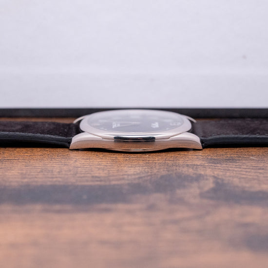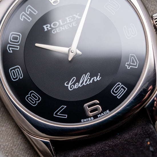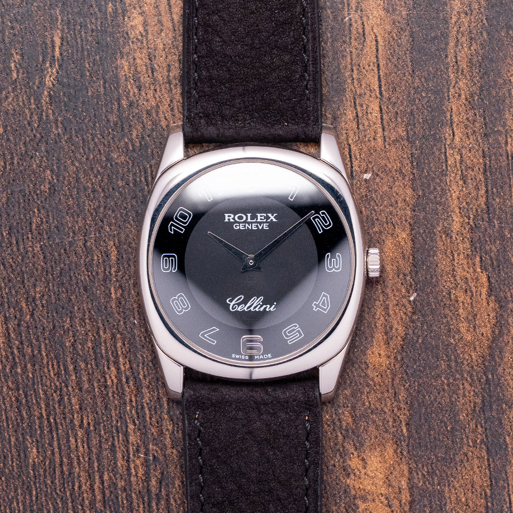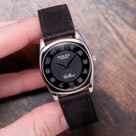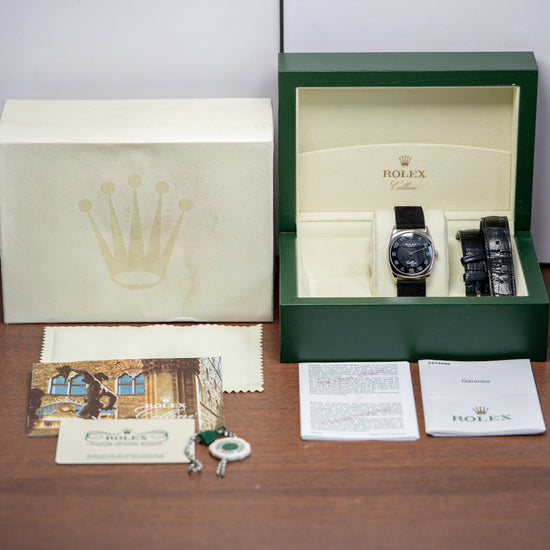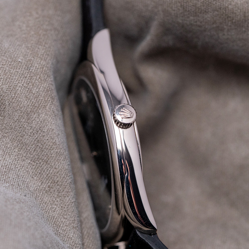 Here we have a rare 2006 Rolex Cellini 4233/9 'Rolex CPO'. Rolex CPO means Rolex Certified Pre-Owned Program. It is an official program where second-hand Rolex watches are authenticated, inspected, and serviced by Rolex technicians. Featuring a 33mm 18ct White Gold cushion case that curves over your wrist with thick tapered lugs. The Cellini range is named after the Italian goldsmith and sculptor, Benvenuto Cellini and is inspired by their dress watches of the 1950s. Its slim flanks lead to a lug-to-lug length of 39.5mm and a case thickness of just 7mm, ensuring a comfortable fit on your wrist. On the right side is a signed crown. A slightly domed sapphire crystal sits above a two-tone black dial with a concentric circular mid-section. At 12 o’clock, we have the 18ct White Gold Rolex Coronet, followed by large white outlined Arabic numerals with an 18ct white gold ‘6’ marking the hours. Underneath the crown, you find “Rolex Geneve” and at 6 o’clock “Cellini” in white text. Elegant 18ct white Gold Dauphine hands complete this beautiful, sophisticated, minimalist two-handed dress watch. On the reverse, an 18ct white Gold case back with the relevant Hallmarks stamped on the inside, inside a manually wound Rolex Cal. 1602, 20 jewels, beating at 21,600 beats per hour. It comes paired with a well-suited 20mm leather strap with a Rolex 18ct white Gold buckle, relevant Hallmarks stamped on its inside, the original Rolex 20mm leather strap in the box, and the watch comes with its Rolex presentation box, swing tag and paperwork.