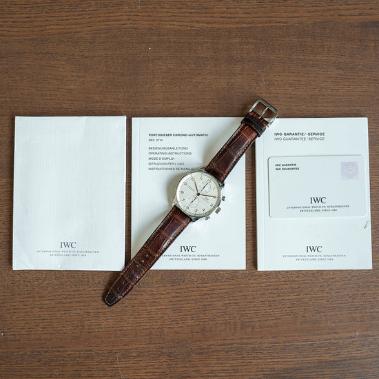 Here we have a 2007 IWC Portuguese Chronograph White IW371401 with a 40.5mm stainless steel case, the sides of the case are expertly brushed with a mirror finish to the tops of the lugs, and a lug-to-lug length of 47.5mm and a case thickness of 12mm give the watch an impressive wrist presence. On the right side, we have the chronograph pushers and a large crown in the centre. A thin bezel holds a scratch-resistant sapphire crystal AR coated on both sides above an ivory dial, an outer minute chapter ring with applied gilt Arabic numeral indices marks the hours, at 12 o'clock a recessed 30-minute register and at 6 o'clock a recessed 60-second register. Elegant gilt leaf hands with a fine tapered chronograph hand complete this classic bi-compax, text is precisely executed at 3 o'clock and 9 o'clock respectively. On the reverse a screw-down case back, inside an automatic IWC Cal. 79350, 31 jewels, 28,800 beats per hour, assembled, finished, and tested at their IWC factory. The watch comes fitted on a 20mm leather strap with a signed buckle and the watch also comes with its original IWC paperwork.