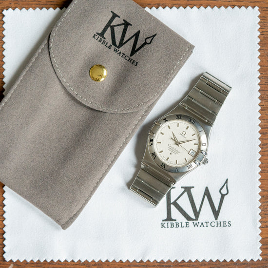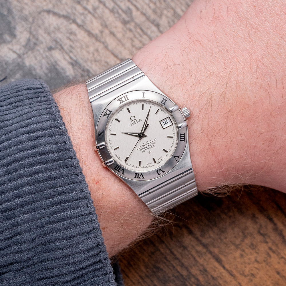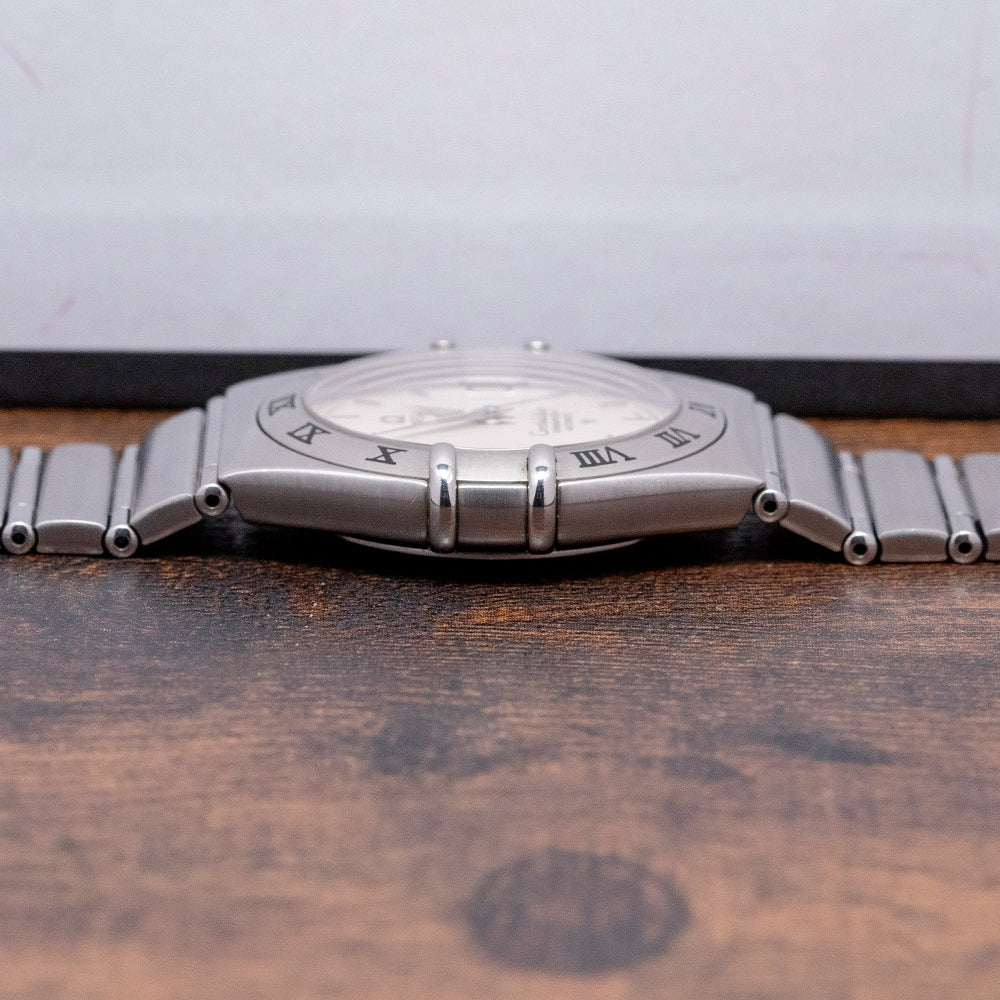 Here we have a 2007 Omega Constellation Automatic 368.1201 with a 35mm stainless steel tonneau case; the distinctive flowing lines of the integrated style bracelet lead to a lug-to-lug length of 41mm and a case thickness of 10.5mm, ensuring a comfortable fit on your wrist. On the right side, is a signed crown. The domed bezel has large engraved Roman numerals and four characteristic “Griffes” or claws; a domed sapphire crystal AR coated on the inside sits above a stunning linen dial. An outer minute track with applied steel baton indexes tipped with lume plots at the hour and at 3 o’clock, a framed date window. Elegant polished steel Dauphin hands sit majestically in the centre, complemented by a tapered second hand; at noon, we have the applied Omega motif, and at 6 o’clock, the “Constellation Chronometer Automatic” with an applied steel star underneath completes this striking dress watch. On the reverse, a screw-down case back with the Observatory of Geneva, the eight stars above the Observatory stand for the many exploits of Omega in the world Chronometer competition, celebrating the fact that all Constellations are Chronometer Certified, inside an Automatic Omega Cal. 1120, 23 jewels, 28,800 beats per hour. This movement is based on the ETA 2892-A2. It comes paired with its original 22mm stainless steel bracelet with a signed concealed butterfly clasp.