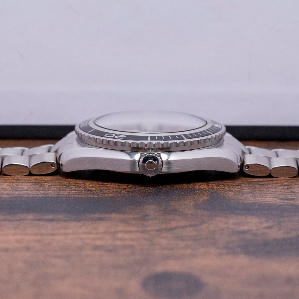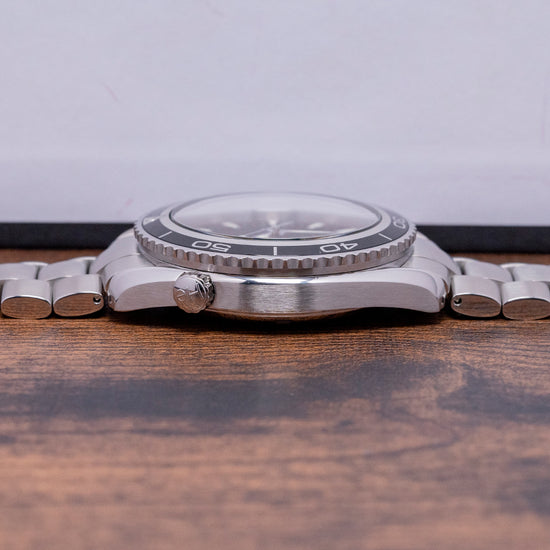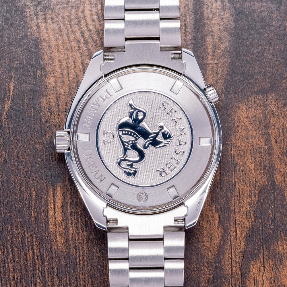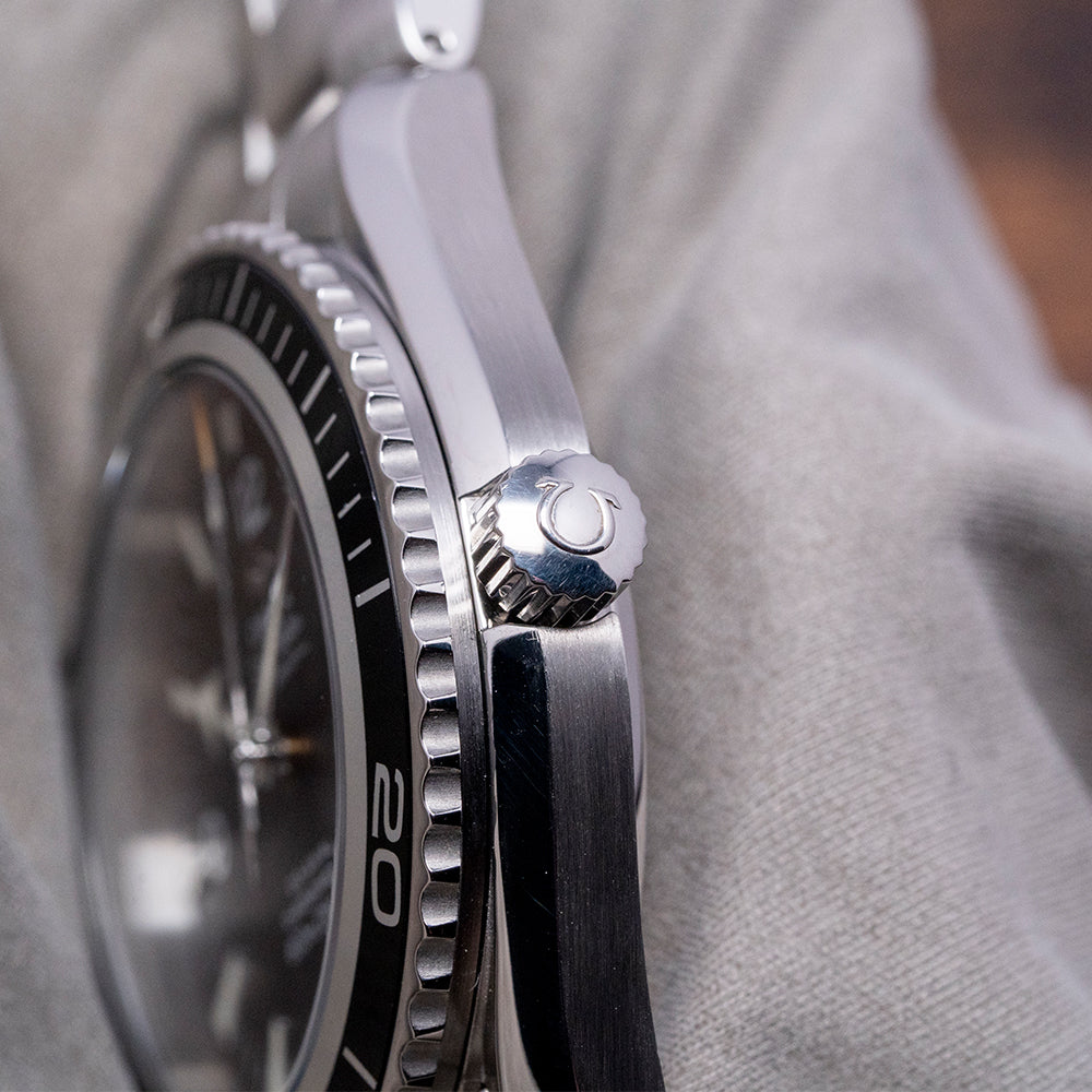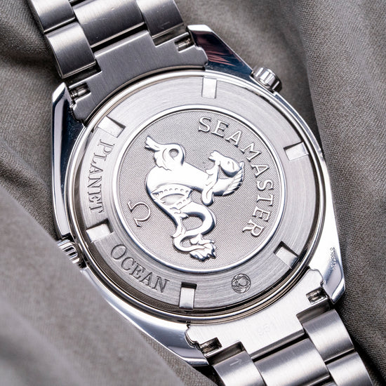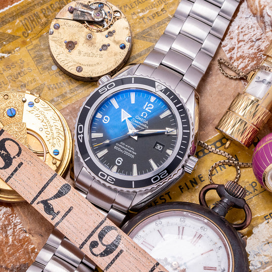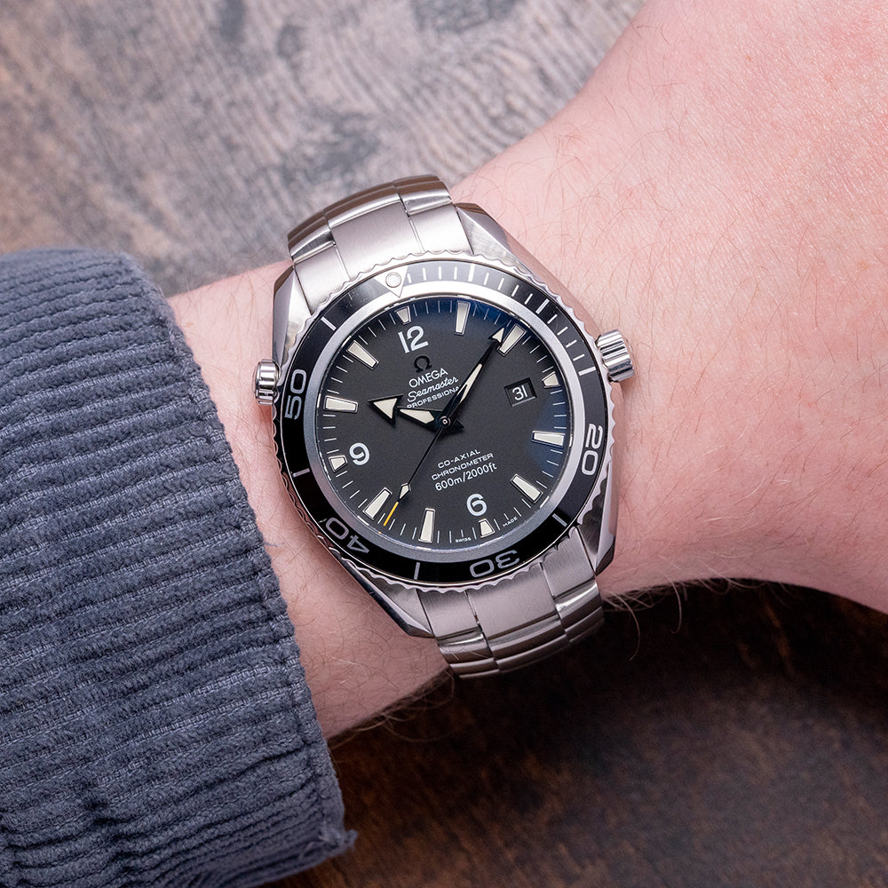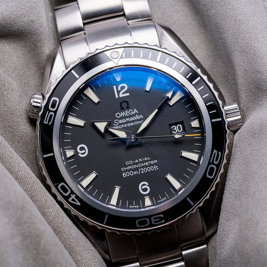 Here we have a 2007 Omega Seamaster Planet Ocean Black 2200.50.00 with a 44mm polished and brushed stainless steel case, characteristic twisted lugs with a lug-to-lug length of 51.5mm, and a case thickness of 14.5mm give the watch an impressive wrist presence. On the right side is a signed screw-down crown that sits recessed into the case for protection and, at 10 o’clock, a manual helium escape valve. The unidirectional bezel has deep knurling sides for extra grip, and a black aluminium dive insert has silver numerals and markings. Sapphire crystal sits above a black dial, an outer minute track has baton indexes filled in lume that sit above the 12, 6 and 9 numerals marking the hours, and at 3 o’clock a colour-matched date window, broad sword hands filled with lume are complemented by an arrow-tipped sweeping second-hand, at 12 o’clock we have the Omega motif “Seamaster Professional” and at 6 o’clock “CO-Axial Chronometer 600m/2000ft'' is printed underneath. On the reverse, a screw-down case back with a polished Hippocampus in the centre, a seahorse that represents Neptune, the God of the sea; it was conceived by Pierre Borie after seeing a picture of Neptune riding a chariot pulled by seahorses; it is the reason why the seahorses are wearing a bridle, first seen on the Seamaster in 1958. Inside an automatic Omega Cal. 2500, 29 jewels, and an unusual 25,200 beats per hour, the movement is based on the ETA 2892-A2 and was released in 1999, after Omega purchased the patent for the Co-Axial escapement from George Daniels, a renowned English master watchmaker and inventor in 1993. It comes paired with its original 22mm Omega stainless steel brushed stainless steel bracelet secured by an Omega signed push button-release clasp. It will fit up to a 7.15-inch wrist, and the watch comes with its Omega presentation box.