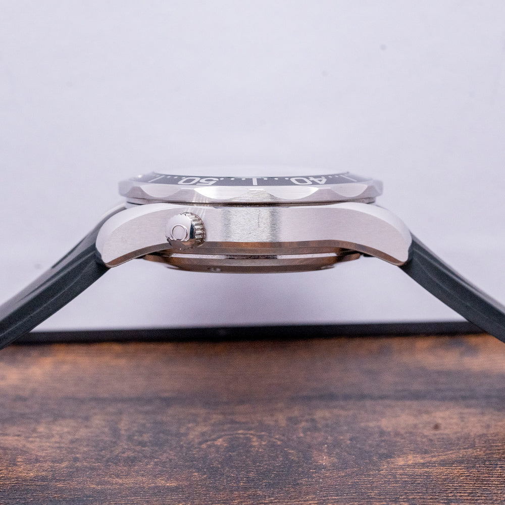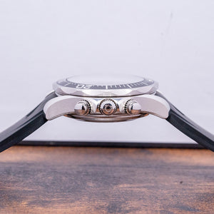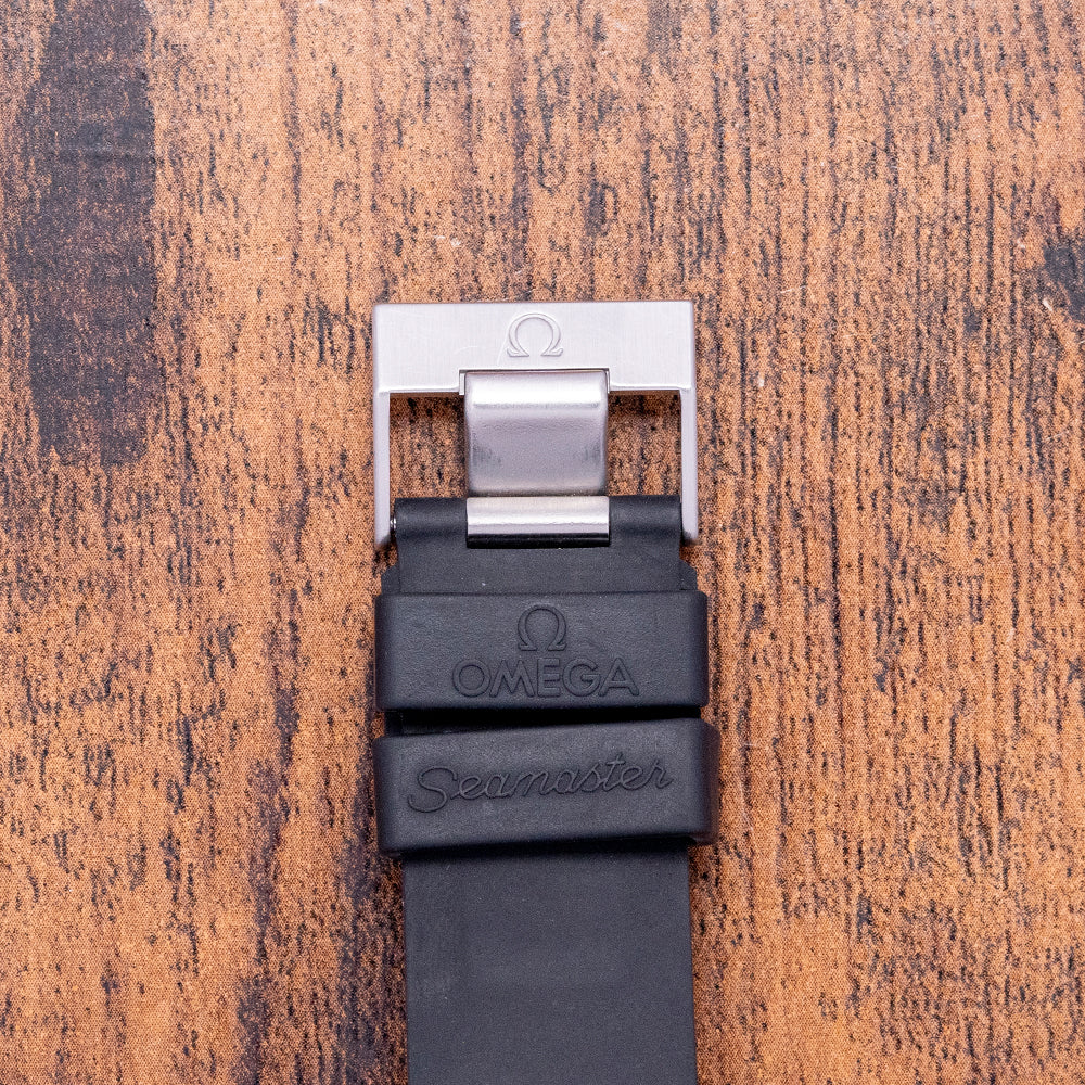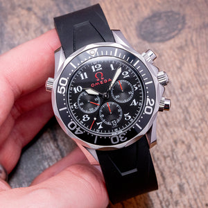 Here we have a 2007 Omega Specialities Olympic Seamaster Chronograph 2896.51.91 with a polished and brushed 316L stainless steel case that sits comfortably on your wrist thanks to the characteristic twisted lugs. Made for the 2007 Special Olympics World Summer Games held in Shanghai, China, where Omega were Official Timekeepers. A lug-to-lug length of 48.5mm and a case thickness of 15mm give the watch an impressive wrist presence. Down the right side, we have the chronograph pushers and a signed screw-down crown, which is protected by crown guards in the centre. On the left side, at 10 o’clock, you find a manual Helium escape valve. The scalloped unidirectional stainless steel bezel has a black 60-minute dive aluminium insert with silver numerals and markings and a slightly domed sapphire crystal AR coated sits above a dynamic black lacquered dial. An outer minute track is precisely executed, surrounding white Arabic numerals marking the hours; at 3 o’clock, we have a 30-minute register; at 6 o’clock, a 12-hour register and a colour-matched date window at 6 o’clock; finally, at 9 o’clock, the small seconds register, each slightly recessed with concentric circular pattern and a red stick hand, broad sword hands filled with Super-LumiNova are complemented by a red-tipped, Olympic symbol counterweighted chronograph hand, at 12 o’clock we have a red Omega motif completing this Olympic themed chronograph. On the reverse, a screw-down case back with an Olympic symbol and “Omega Official Timekeeper” embossed in the centre, inside an automatic Omega Cal. 3303, 33 jewels, beating at 28,800 beats per hour, this column wheel chronograph is based on the Piguet 1285/3301. The watch comes paired with its fitted 20mm Omega Seamaster black rubber strap and signed pin buckle, and it comes with its special Omega presentation box and paperwork, including 2021 Omega Service paperwork.