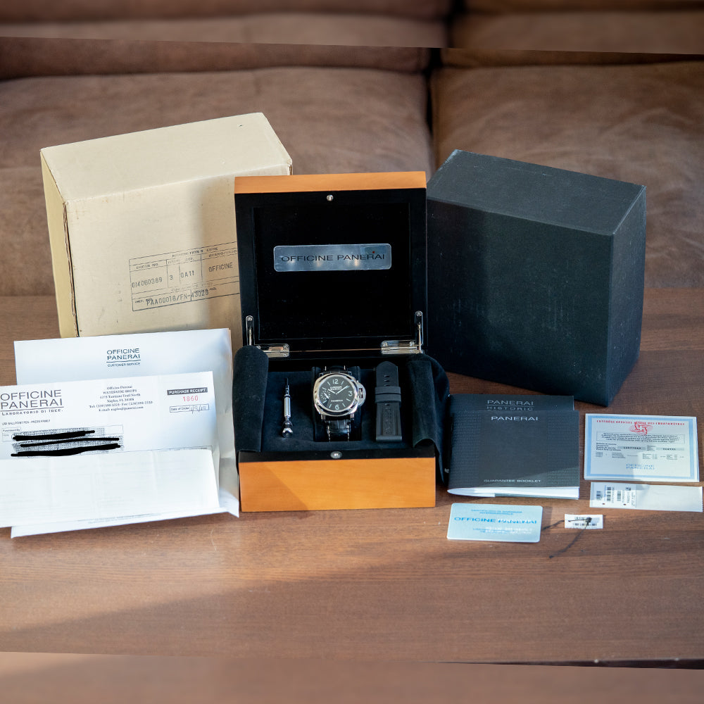 Here we have a 2007 Panerai Luminor Marina 44mm Manual PAM00111 inspired by Panerai’s 1950s combat watch, the ref. 6152 with its iconic 44mm cushion stainless steel case, polished surfaces lead to thick straight screwed lugs that hug the wrist with a lug-to-lug length of 53mm and a case thickness of 14.5mm giving the watch an impressive wrist presence. On the right side is the characteristic crown guard with its release and locking mechanism; a smooth polished bezel holds a sapphire crystal above a black sandwich dial. A black stencil dial bearing the indexes and numerals is overlaid atop a fully painted luminescent disc; this process has been perfected since its inception in the 1930s. Luminor is based on Luminova and has been developed by Panerai since the 1950s. The two hands are black-oxidised and infilled with Luminor luminance in striking contrast to the black of the dial. At 9 o’clock a small second sundial, at 12 o’clock we have “Luminor Marina" and at 6 o’clock “Panerai” motif completes this distinctive dive watch. On the reverse, a screw-down exhibition case back with the details of the watch engraved into it, inside a manually wound Panerai Cal. OPXI, 17 jewels, beating at 21,600 beats per hour, based on the ETA/Unitas 6497/2, Panerai has used this movement in various models since 2002. The watch comes paired with two 24mm Panerai straps with a signed buckle and the watch comes with its Panerai presentation box and paperwork.