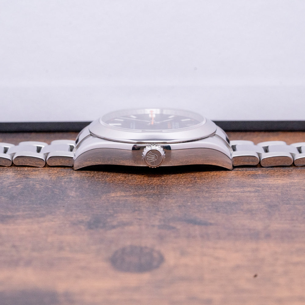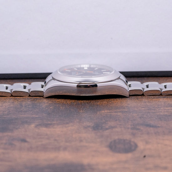 Here we have a 2007 Rolex Milgauss Black Dial 116400 that has a curvaceous 40mm polished and brushed 904L OysterSteel Oyster case, and inside the case is a shield made from ferromagnetic alloys specifically chosen by Rolex; this acts as a Faraday cage. The Rolex Milgauss was developed in 1954 specifically for scientists working in laboratories and research centres who required a timepiece that wouldn’t stop working when they were subjected to levels above 100 gausses. Rolex tested at CERN, European Organization for Nuclear Research, and the Milgauss was born. They are specifically designed to work in areas of up to 1,000 Gauss’. Its name was created from the French word Mille, meaning thousand and gauss, which is the unit of a magnetic field. Rolex, in 1988, decided to discontinue the Milgauss. It wasn’t until 2007 that they decided to reintroduce three models of the ref. 116400. A lug-to-lug length of 48.5mm and a thickness of 13mm gives the watch an impressive wrist presence, and the gentle curve of the case ensures a comfortable fit. On the right side is a TwinLock screw-down crown. The polished bezel holds a flat sapphire crystal above a black dial and has an outer minute track with orange plots at the hour, and applied baton indexes with the larger batons at 3, 6, and 9 filled with Super-LumiNova marking the hours. Broad baton hands are coated in lume in the same way as the indexes. The iconic orange lightning bolt sweeps around the dial. At 12 o’clock, the applied Rolex coronet with text precisely printed and the orange Milgauss that stands out against the black dial. At 6 o’clock, text signifying its chronometer certification. On the reverse, a coin-edged screw-down case back with Rolex Oyster Milgauss engraved around the edge, inside a Rolex automatic Cal. 3131, 31 jewels, 28,800 beats per hour, this movement has a magnetic alloy Parachrom-Blu hairspring, resistant to magnetic fields and up to 10 times more resistant to shocks. The watch comes paired with its polished and brushed 20mm Rolex stainless steel Oyster bracelet with an Oysterclasp and 5mm Easylink extension; 11 links are provided, one short of a full bracelet, and comes with its Rolex presentation box and card.