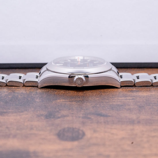 This watch is sold with its original Rolex box and card. It comes paired with its polished and brushed 20mm Rolex stainless steel bracelet, Oysterclasp, and 5mm EasyLink extension, with 11 links provided, one short from a full bracelet. The watch is from December 2007 and is sold in worn but is in very fair condition, as you can see, recently benefiting from a service and polish. The watch comes with our 12-Months Warranty.
