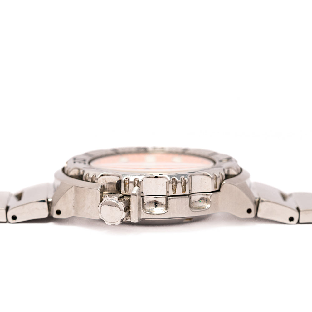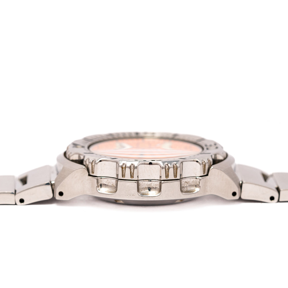 The Seiko Monster was first introduced in 2000, borrowing aspects from the Seiko 5 line and the Tuna line. Our 2007 Seiko Orange Monster SKX781 7S26-0350 has a 42.5mm polished stainless steel case, a lug-to-lug length of 47.5mm and a thickness of 12.5mm giving the watch an excellent wrist presence. Tuna-like shielding surrounds the watch protecting the screw-down crown at 4 o’clock and giving it its aggressive form, a wide rotating concave bezel is deeply knurled for extra grip and has deep engraved 60-minute dive numerals painted black for easy reading. The flat hardlex crystal sits above a vibrant orange dial, an outer minute track has applied baton indexes coated in pillow luminescence marking the hours. At 12 o’clock you have a shark tooth shape, the day/date window is clear to see the black print on white and the 60-minute numerals are printed in black. The luminescent coated hands when at 12 form a rocket ship, the text is precisely printed. On the reverse, a screw-down case back with an embossed Seiko Tsunami in the centre, inside an automatic Seiko Cal. 7S26, 21 jewels, 21,600 beats per hour, this workhorse of a movement was first introduced in 1996. The watch comes on its original Seiko Stainless steel bracelet with its signed folding clasp and comes with an original Seiko presentation box and paperwork.