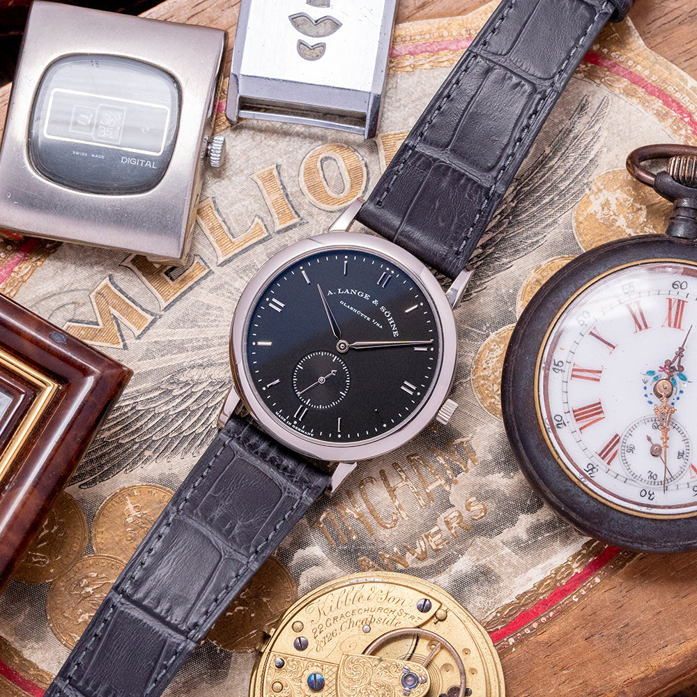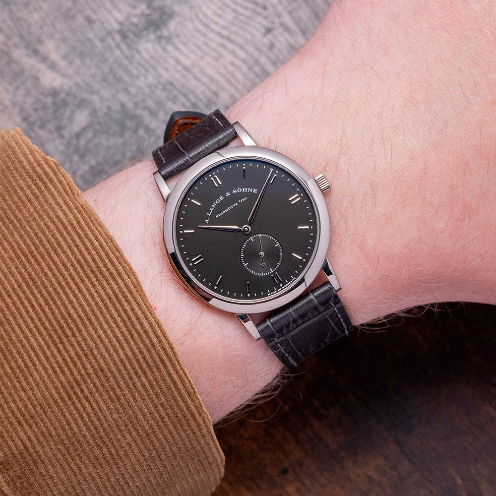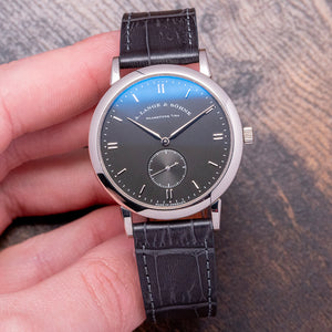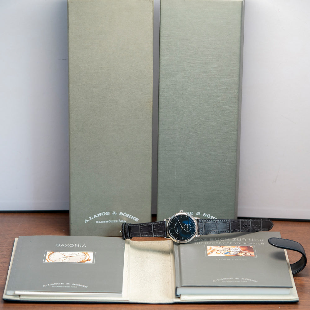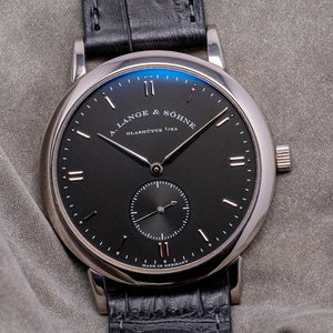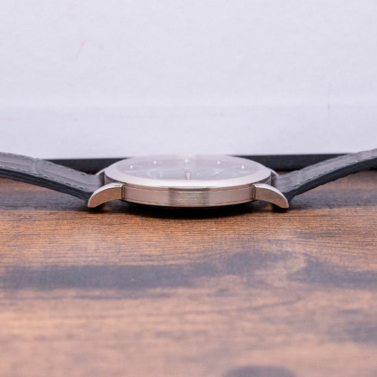 Here we have a classic 2008 A.Lange & Söhne Saxonia 215.029 with a curvaceous 37mm 18ct White Gold round case that comfortably sits on your wrist with tapered lugs, chamfered-edged polished and brushed surfaces transition with crisp lines, leading to a lug-to-lug length of 44mm and a case thickness of just 7mm. On the right side is a signed coin-edged crown. The smooth, polished bezel holds a flat sapphire crystal above a stunning black dial. An outer minute track surrounds applied polished 18ct white gold single and double baton indexes that magically capture the light as you rotate your wrist, marking the hours. Elegant 18ct white gold Alpha hands sit above a slightly recessed sub-second at 6 o’clock; at 12 o’clock, we have the A. Lange & Söhne motif completes this sophisticated dress watch. On the reverse, a screwed-down sapphire exhibition case back is engraved with the details of the watch, inside a manually wound ALS Cal. L941.1, 21 jewels, beating at 21,600 beats per hour; this movement is made up of 164 components, expertly finished to the highest standards with beautiful hand engraving. It comes paired with a 19mm Grey Geckota strap and the original signed 18ct White Gold Buckle. It also comes with its A. Lange & Söhne Service box and original paperwork.